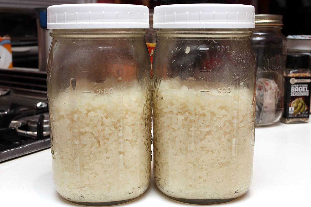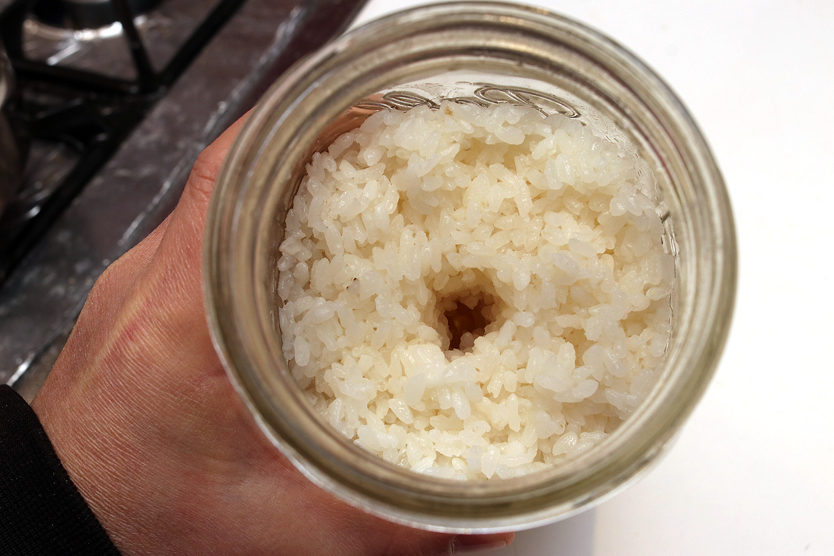 later i tried jiu niang batch v6 2020-12-23, the one i made yesterday afternoon using angel rice leaven. it's only been 1 day, and normally i don't like to open the jar until the fermentation is complete (to avoid introducing bad bacteria), but i was curious to see the progress after only a day. when i opened the jar, there was hardly any smell. there was also hardly any liquid, although the rice grains were still moist. i tried a little spoonful, the rice grains had a faint sweetness, no sour note, which is a good sign that the rice hadn't gone bad. i noticed in the inner wall of the glass jar fine mycelium from the Rhizopus oryzae fungus. i think it's fermenting at the right rate, about the same as the yeast ball fermentation. i was afraid i used too much powder.