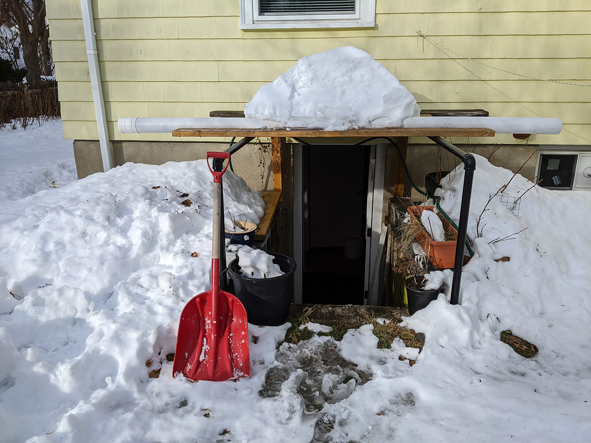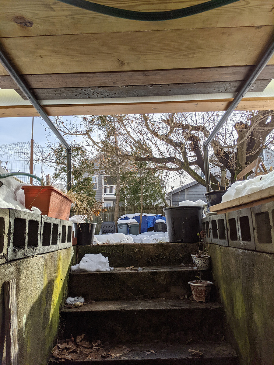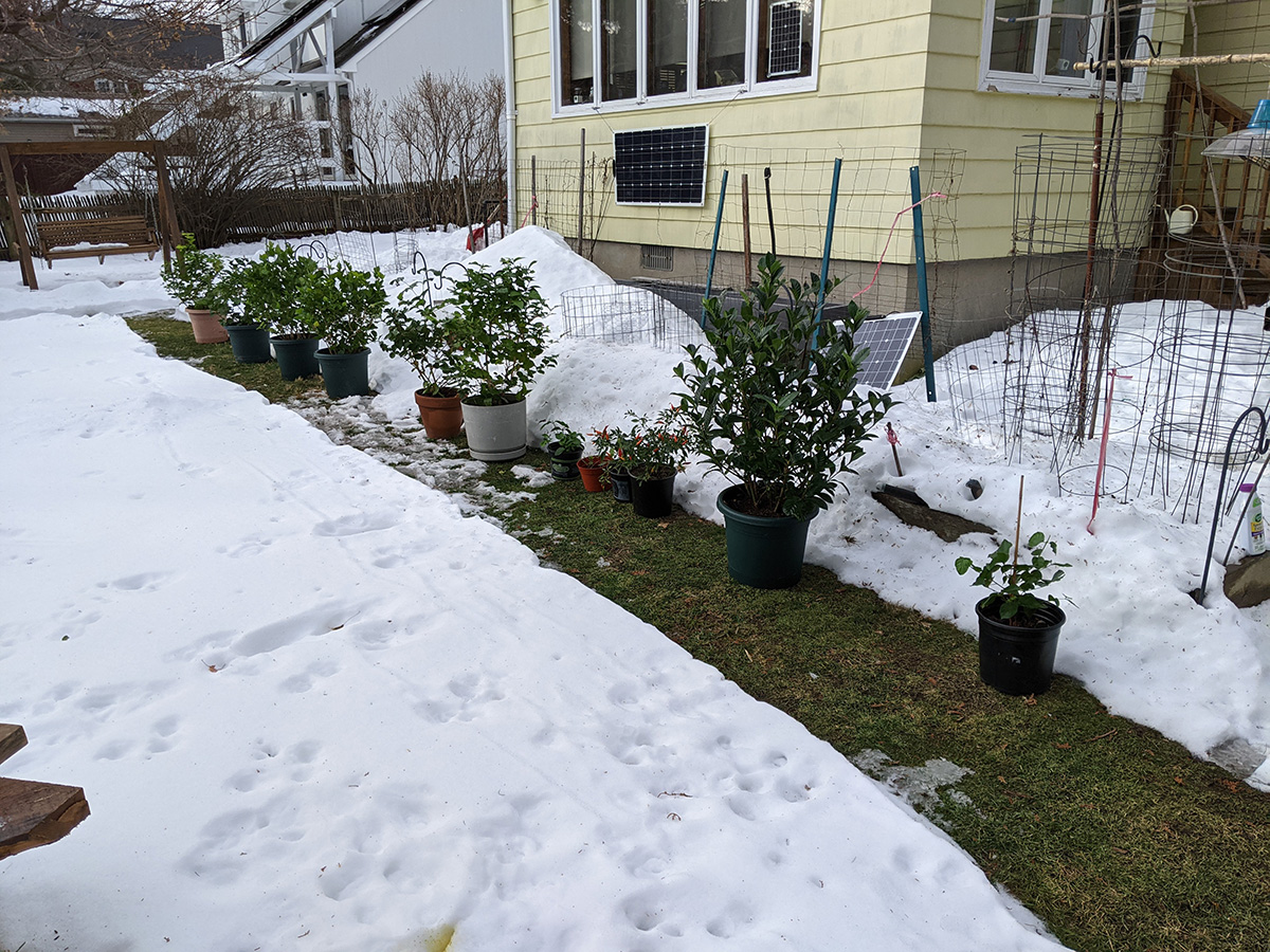 i'd forgotten there'd still be snow in the backyard. thankfully the pathway my father plowed with the snowblower had all melted down to the bare grass. i moved out the plants one by one and put them in a row along the pathway, so they wouldn't be resting in the snow.