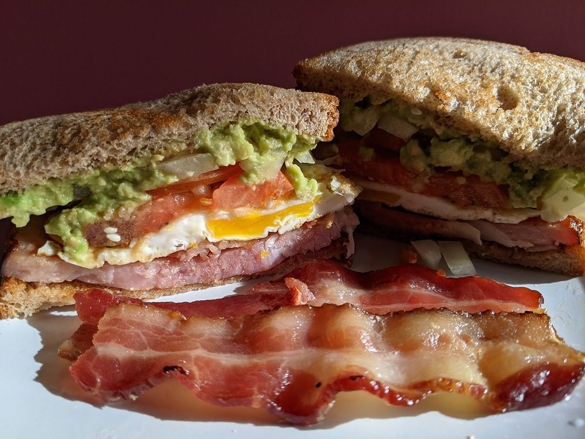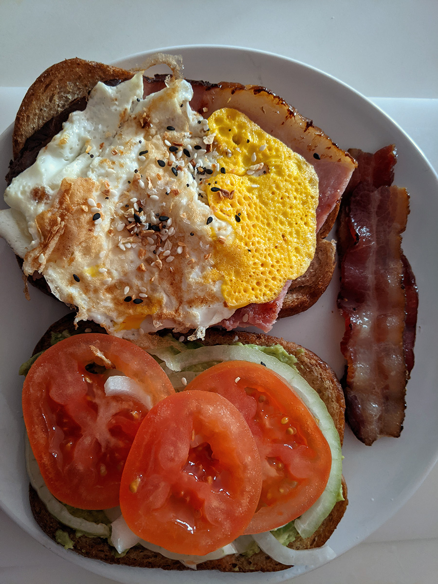 i made another ambitious sandwich for lunch, this time frying the whole wheat bread in some butter first so they don't get soggy when i assemble the sandwich. although it looks quite delicious and nutritious, i'm not happy with it. there's a mushy consistency i don't like, from the guacamole to the egg, to the soft tomato slices, even down to the hickory smoked ham. but my biggest problem is the combined ingredients don't have a strong enough flavor. everything is relying on the ham to bring the salty savoriness, but the flavor just isn't strong enough, even after i pan-fried it a little bit. i think a better choice would be some smoked salmon.