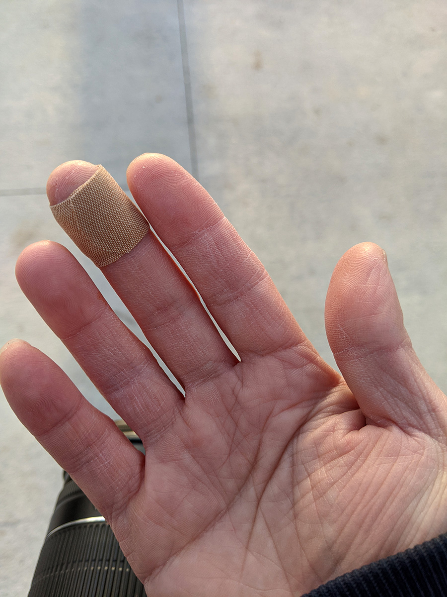 i went to the side of the railing where i could set the drone done and bandage my wound. i checked the drone for damages, other than some mud and grass stains, it was fine. i looked at my fingers. i couldn't tell where i got sliced but i wrapped my fingers in a tissue and saw were the blood was oozing out. fortunately i always carry some bandaid with me and once i got a bandaid on my middle finger everything was fine. i'd dripped blood onto the drone; i wiped off as much as i could and then put the drone away. i felt a little stupid, but getting hit by the propeller was bound to happen sooner or later, like crashing the drone.
