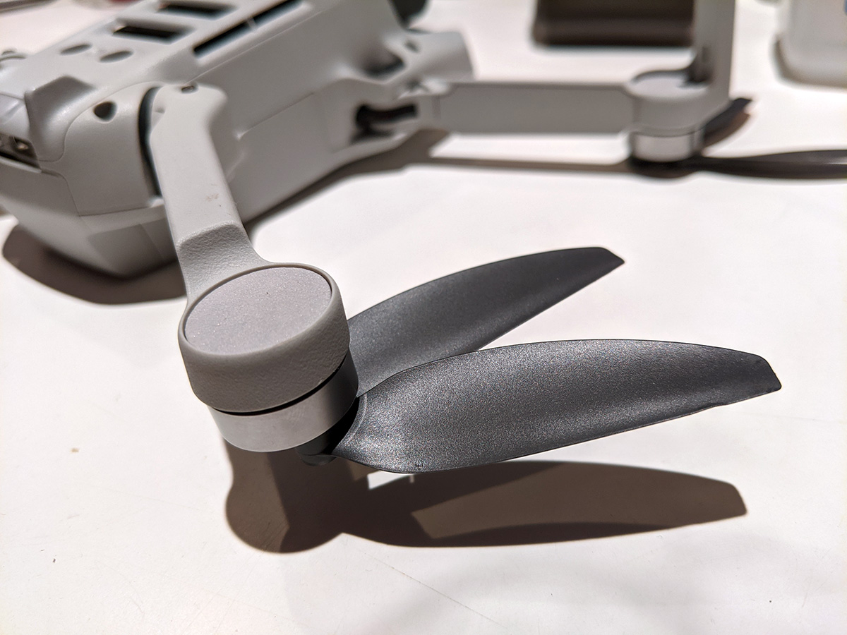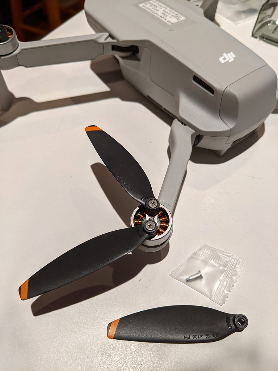 back at the house i examined the drone more thoroughly. i tried cleaning off the blood with some cotton swabs and alcohol, but it wouldn't come off. only when i tried some hydrogen peroxide did it do the trick. i checked the propellers to make sure there were no damages. a few had dried up blood on them. one in particular had a small dent, maybe that happened when it hit my fingernail. fortunately one of the undamaged propellers i removed when i replaced my propellers the last time i had a crash was a perfect match, so i replaced that one damaged propeller, using a brand new screw as well.