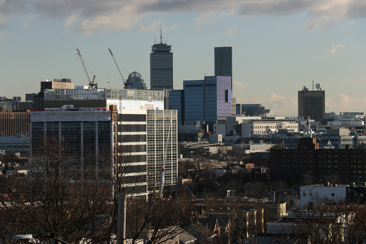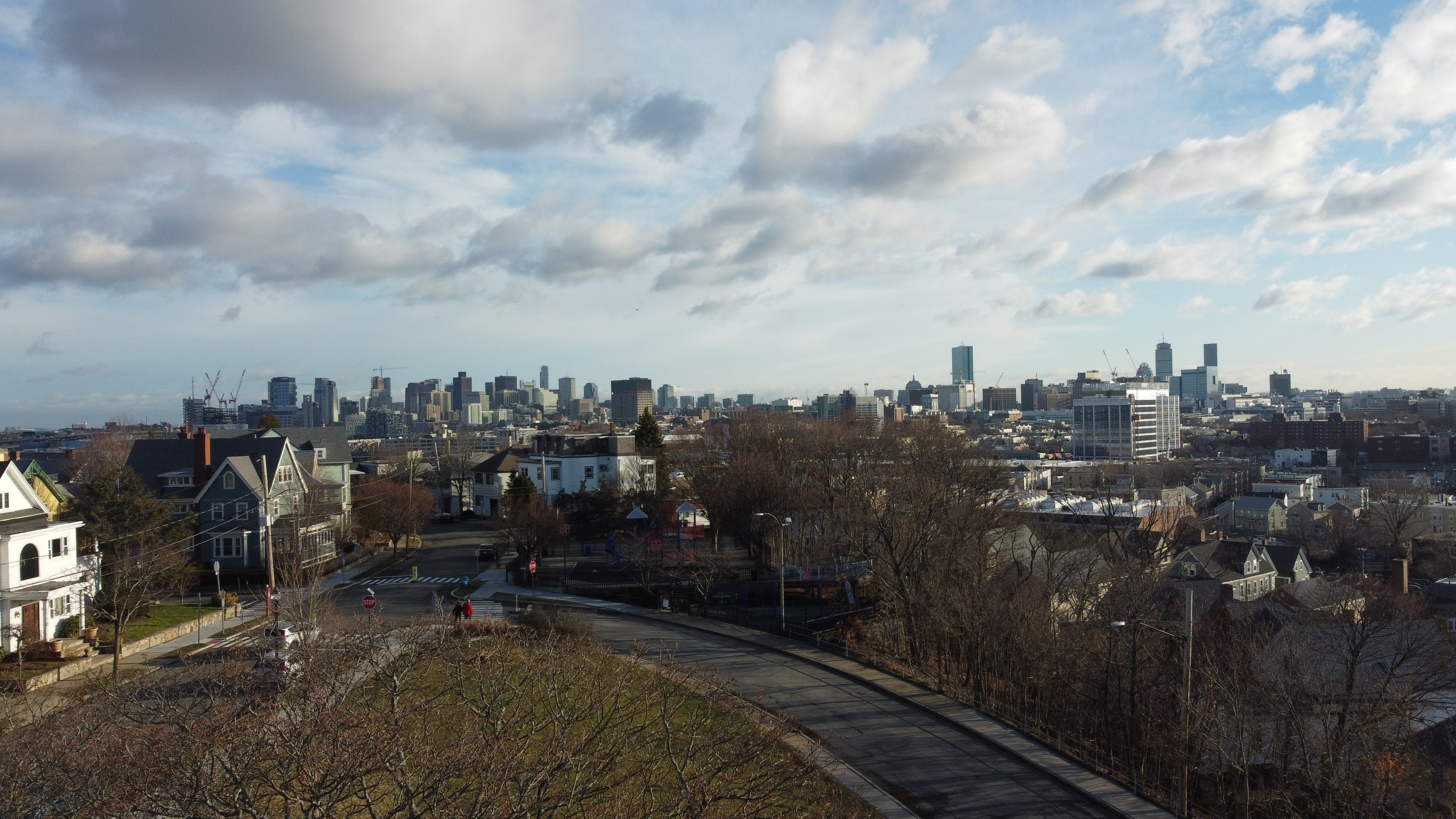 later in the afternoon i was compelled to bike up to prospect hill by union square in somerville and fly my DJI mini 2 drone. it was a good day, blue sky, sunny, some clouds, with a bit of 10mph wind. i figured even if i didn't do any flying, i could still go up there and check it out ever since they renovated the place. i feel like it's been nearly 2 years since i've been up to prospect hill. i immediately noticed a large new building in east cambridge that blocked a chunk of the boston skyline.