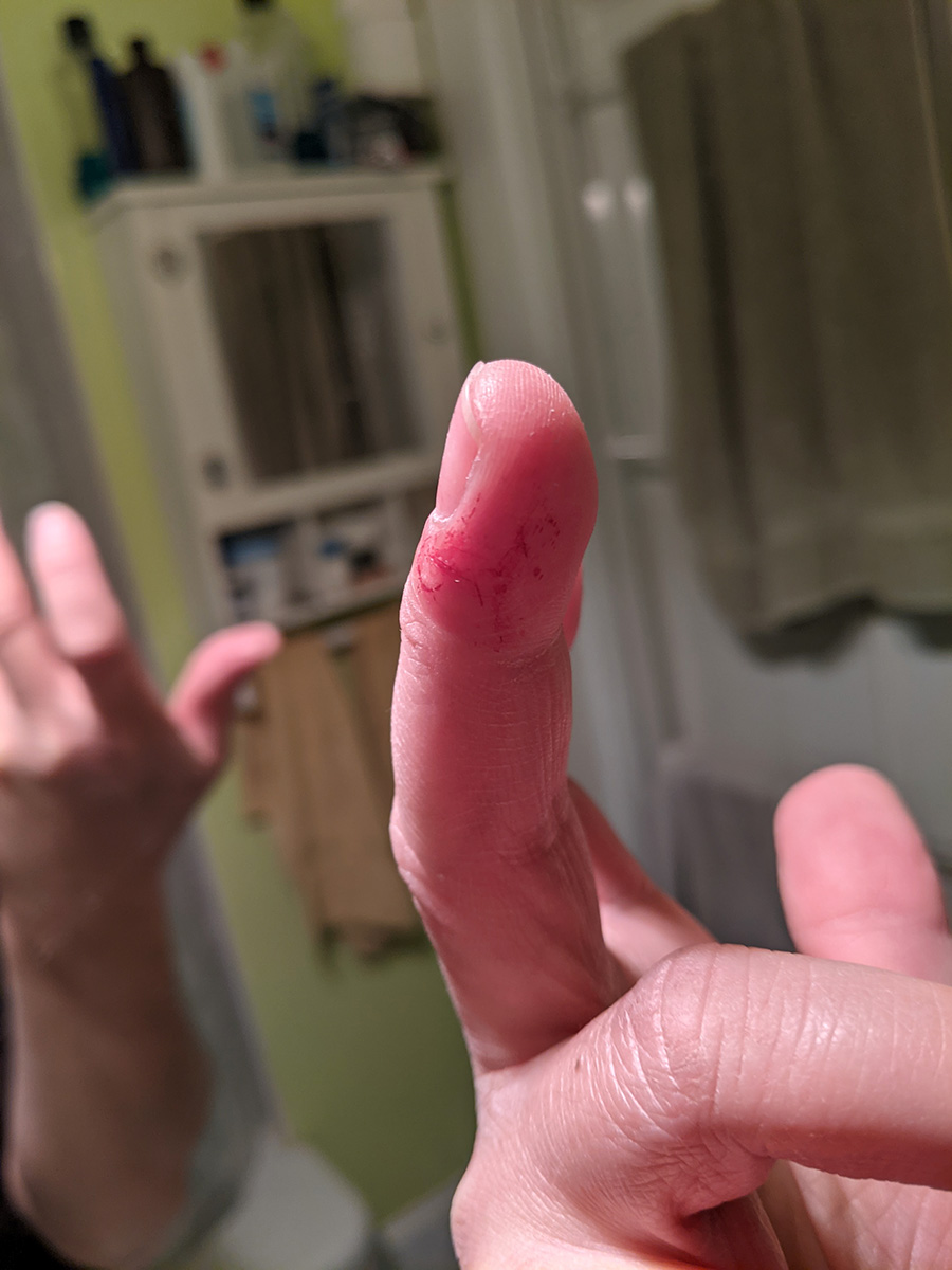only then did i removed the bandaid from my fingertip to give it a more thorough cleaning and to see what exactly happened. i got sliced a few times. it hurt when it happened, but didn't afterwards. it's probably no worse than getting a few papercuts. after washing the wound, i put on a fresh bandaid. there was no pain whatsoever.
