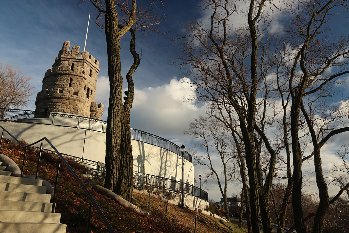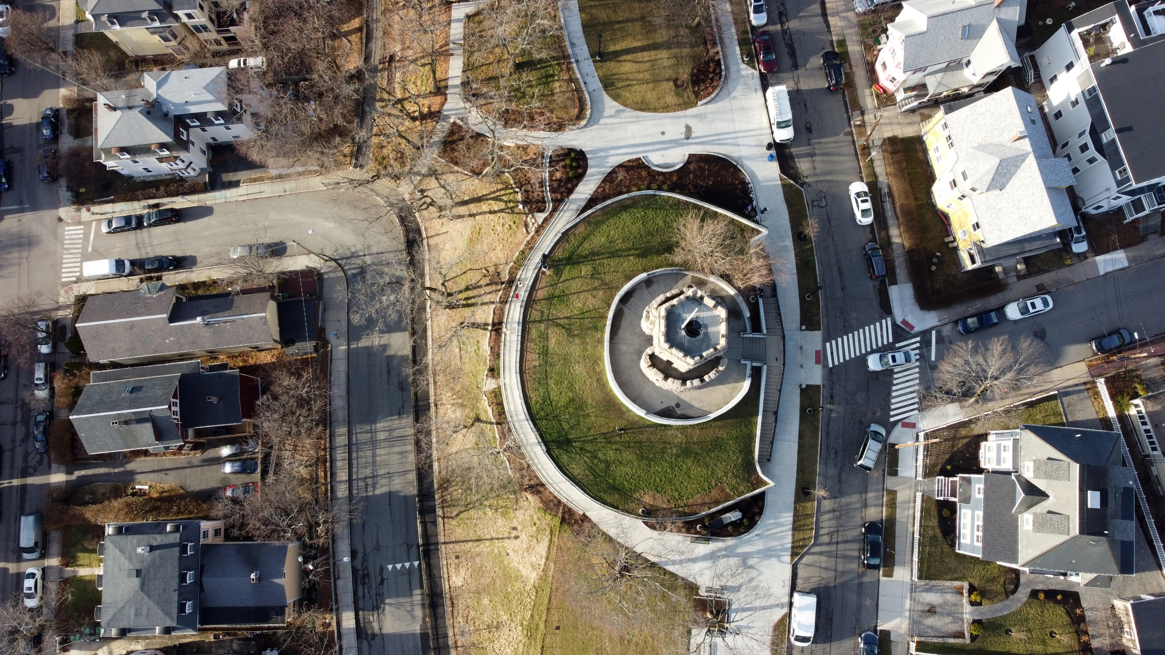 there was nobody around other than a mail carrier busy delivering mail, a jogger resting on one of the benches, and a few pedestrians either walking dogs or out for a stroll. conditions were ideal so i climbed over the railing to the circular grass moat surrounding the prospect hill tower and took out my drone. honestly, if you didn't know what i was doing, you wouldn't even know i was flying a drone in the air. i looked around to see if anyone noticed, and not a single person paid any attention. the drone could be almost over them and they never noticed it.