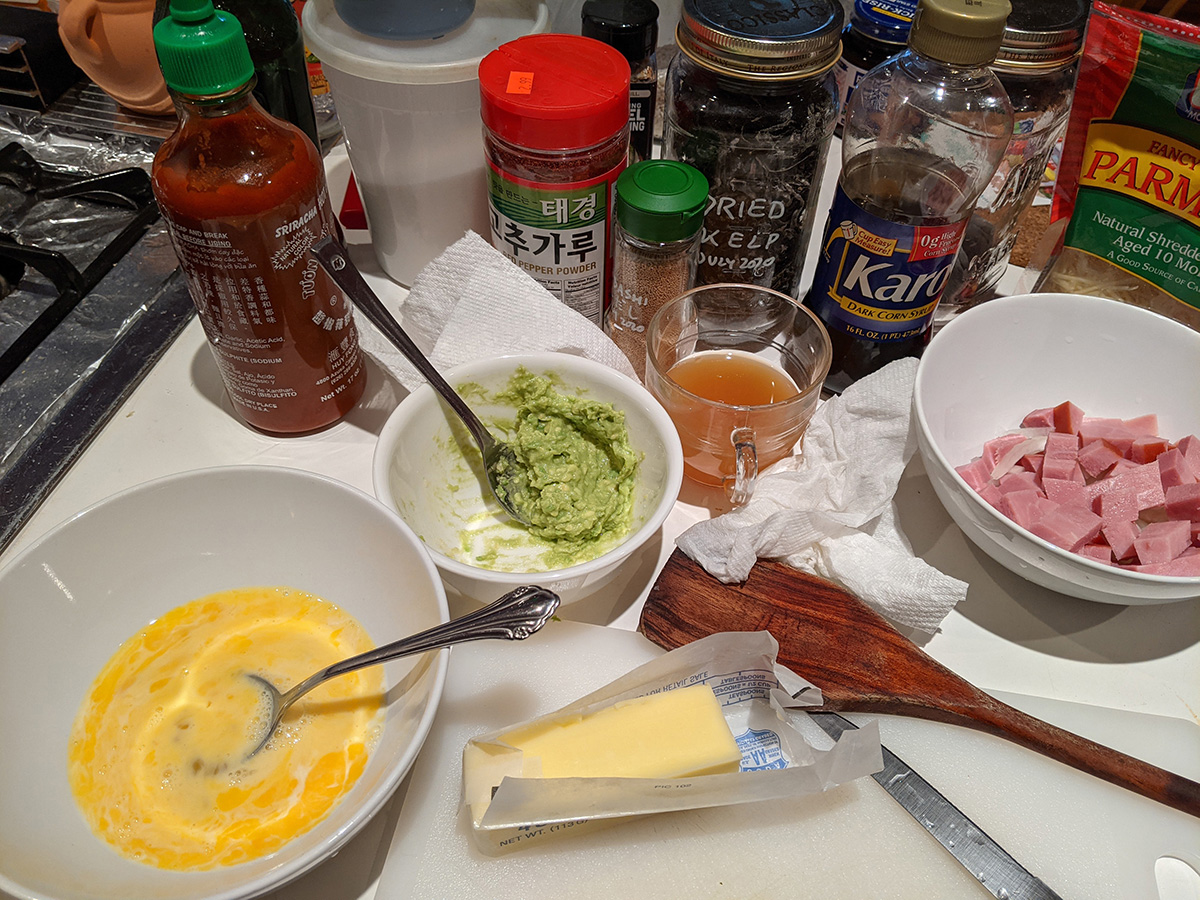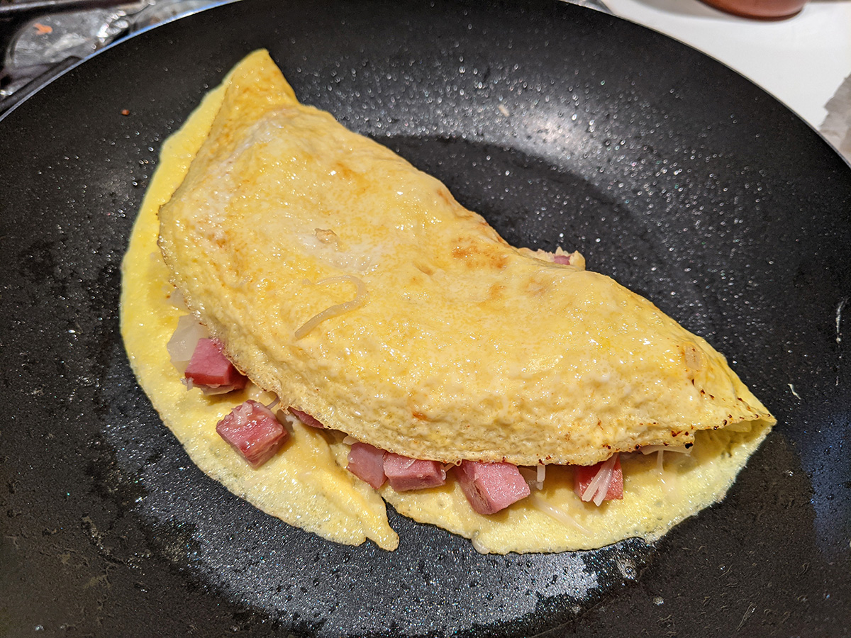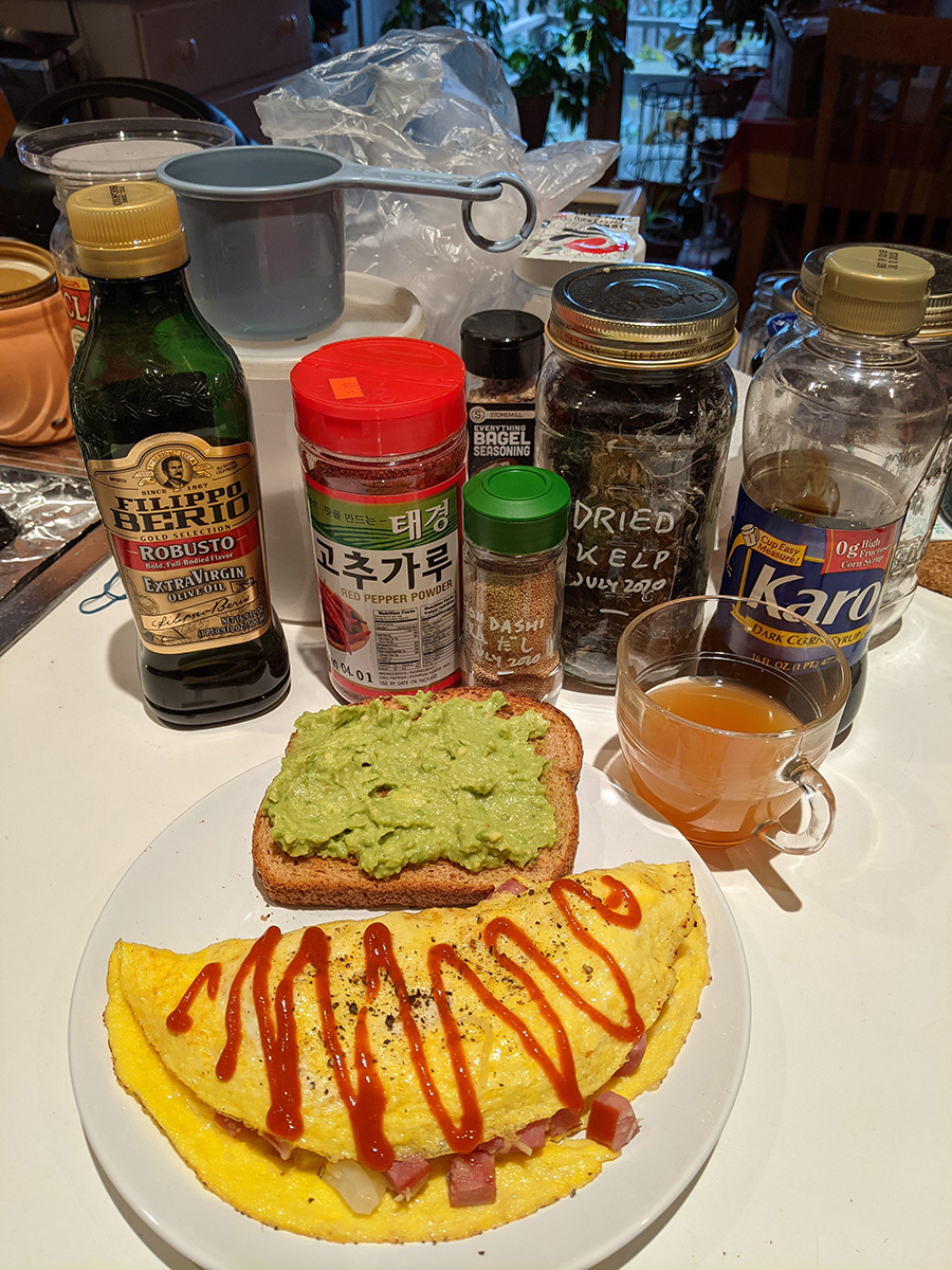 for lunch i made an omelette (ham and onion) with a slice of avocado toast toasted in a toaster.