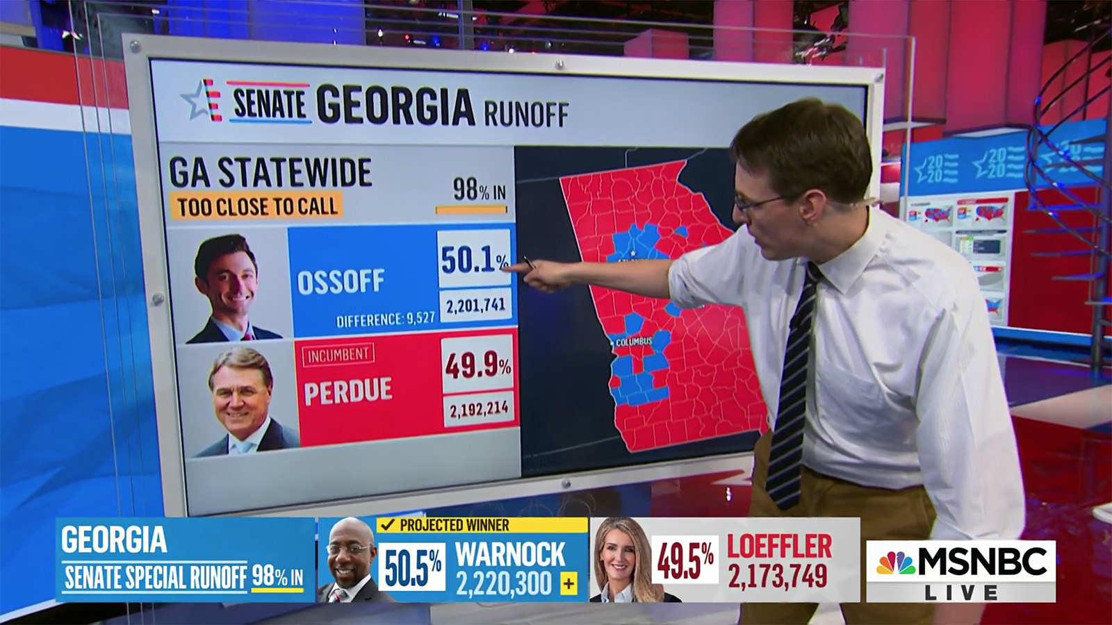 by the time i finally went to bed at 2am, warnock had been declared the projected winner and ossoff had a 10K+ lead over perdue. the remaining uncounted votes were from overwhelmingly democrat-leaning counties, so ossoff's lead will only increase. democrats did it: they actually won the senate tonight.