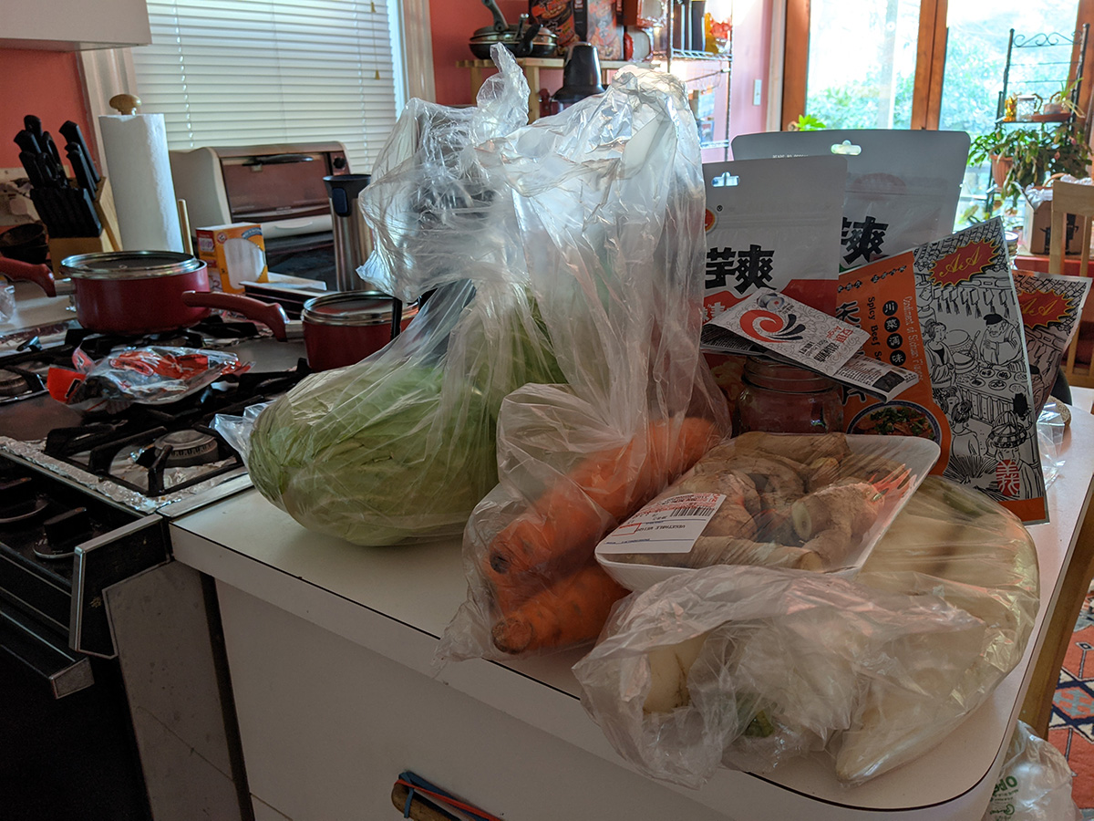 i went to two supermarkets: c-mart first then ming's market. i got $30 worth of groceries, including another 5 lbs. bag of red plum brand glutinous rice ($7.99) and two 6-pack of heysong sarsaparilla soda ($6.98). i only bought enough to carry in a single grocery bag, because i needed the other bag for ming's market. here i bought nearly as much groceries ($26), including all the vegetable ingredients i needed to make sichuan paocai next week.