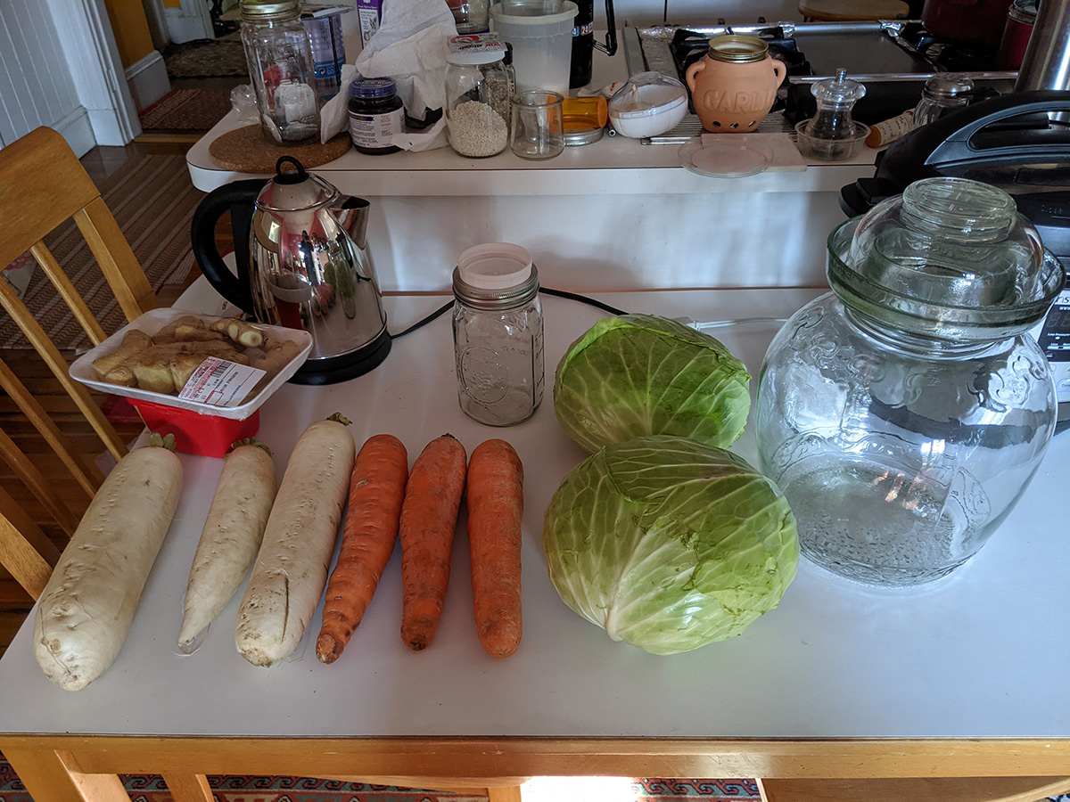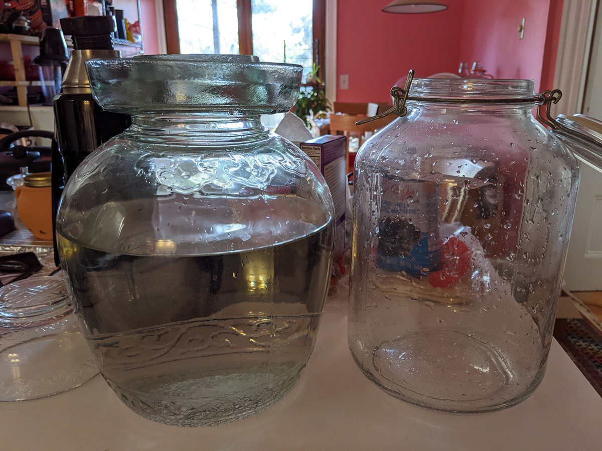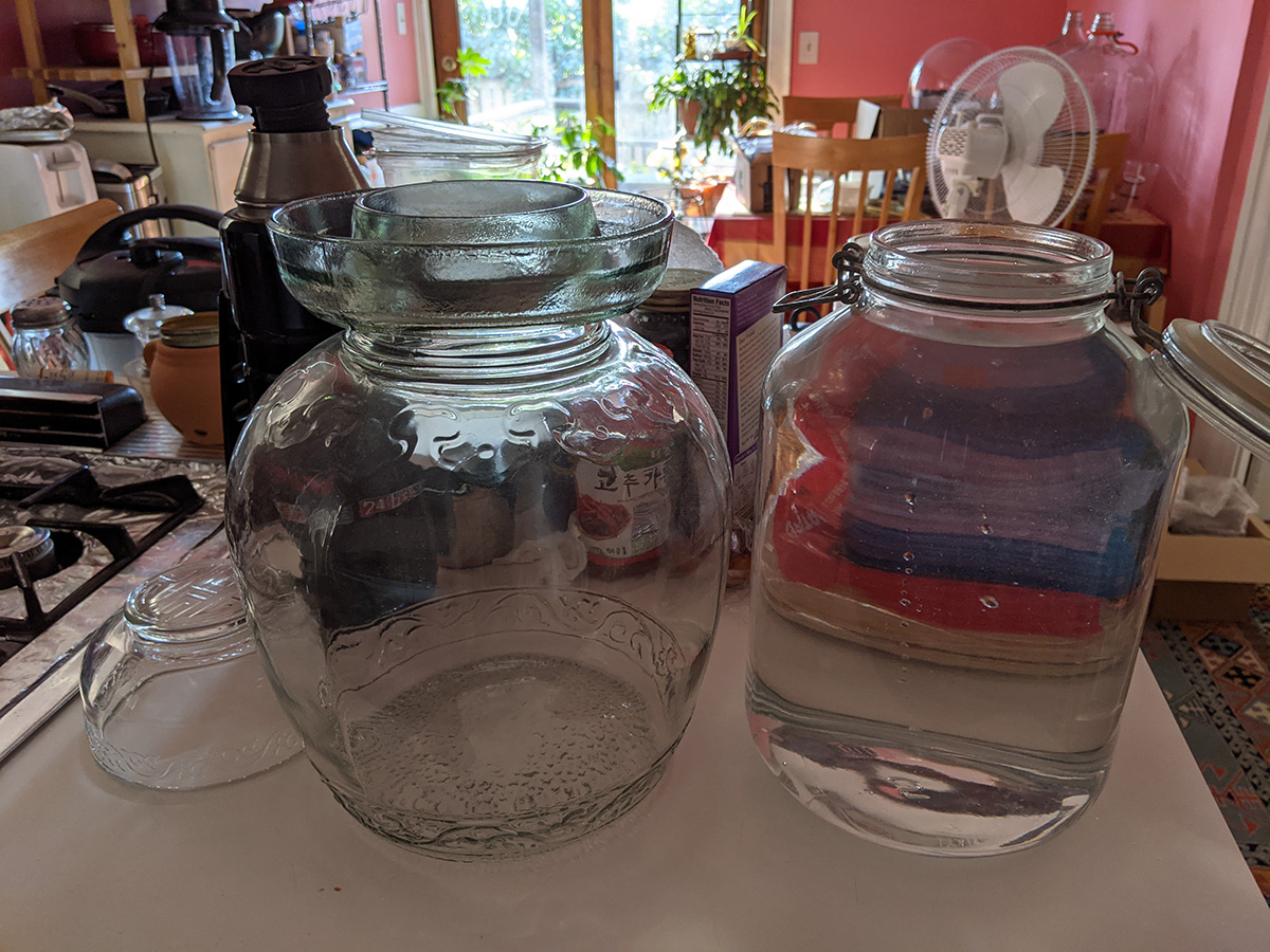 i'm not yet ready to make my sichuan paocai but i filled my 5L fido jar with water (my normal paocai container) and poured it into the special sichaun paocai fermenting jar so i could figure out its volume. judging from the amount, the fermenting jar is probably 8L (edit: i went to the manufacturer's website and it says this "medium-sized pickle jar" is 7L; the large-sized jar at my parents' place is 10L). with the amount of vegetable ingredients i have, i can probably fit most of the vegetables in the fermenting jar and use a fido jar for the extras.