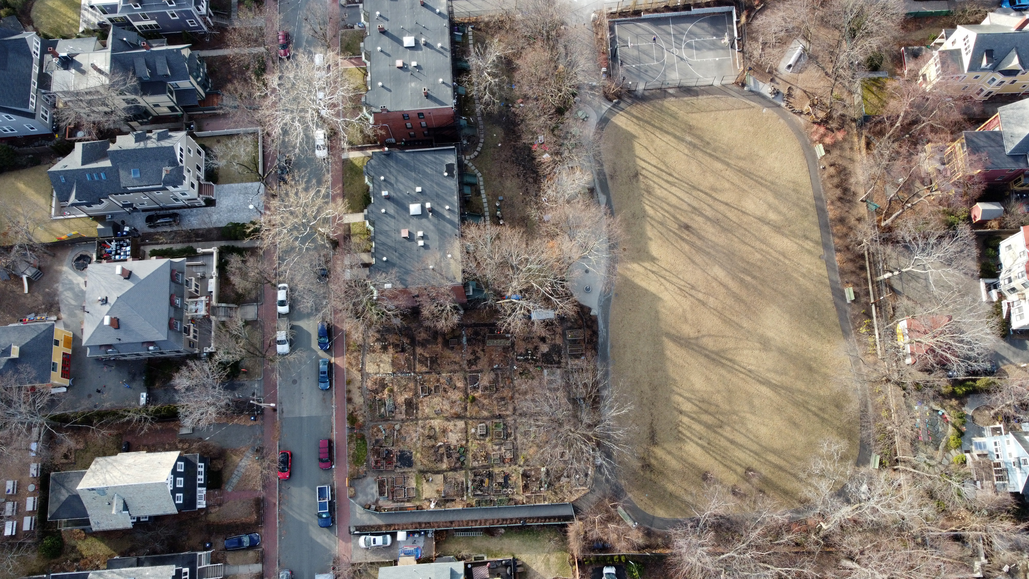 i decided to take a detour and fly over my house to get a few photos before finally flying back to the community garden. while i was there a woman actually came into the garden. i'd never seen her before, she seemed to be doing a survey of the garden, inspecting each plot carefully (maybe she lost something). after she did a tour of the gardens she left. once she was gone i bought the drone down. once again, if i can avoid it, i rather not land the drone on my hand. instead i put it down on the dirt path. i was afraid the prop blades would hit the ground, but when it lands it comes in very gently. i packed up my drone and returned home.