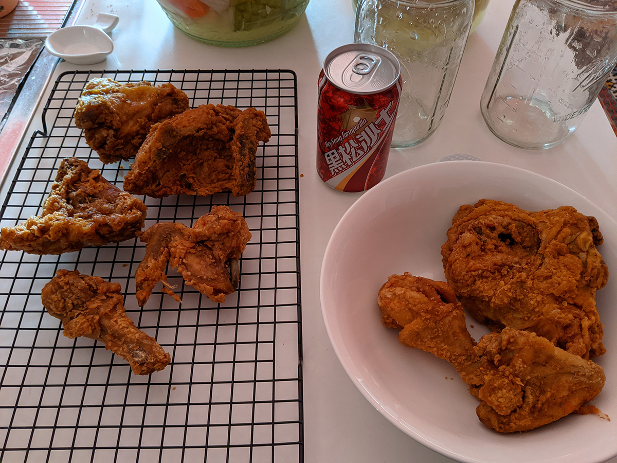 later in the evening i finished the rest of the fried chicken. all that grease finally caught up to me and i ended up with explosive diarrhea. after a shower i felt better and ate an apple.