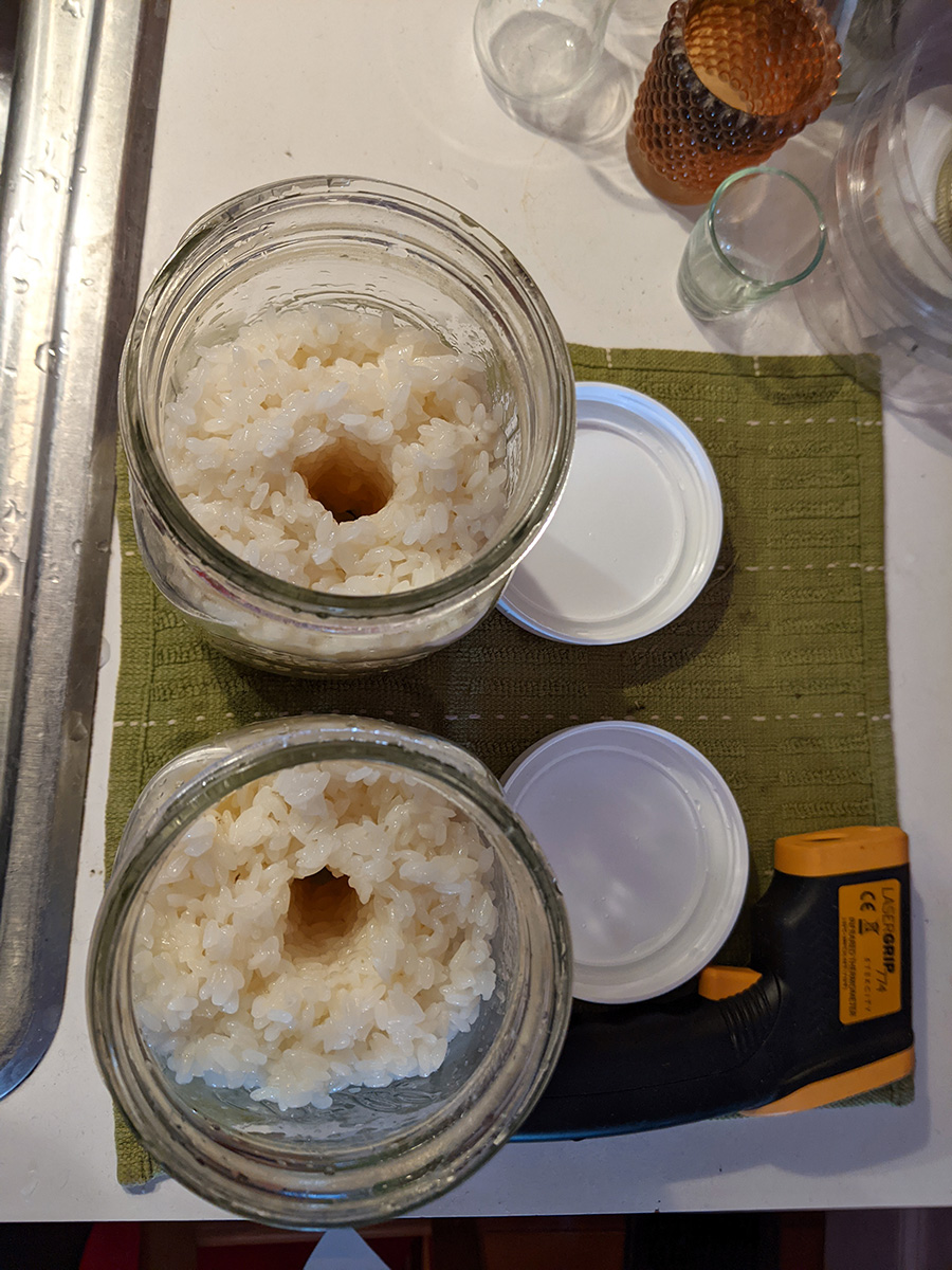 at the 6 hours mark, i opened a jar of fermenting jiu niang. there's was some liquid at the bottom but when i took a sniff there was no discernable smell other than that of wet rice.