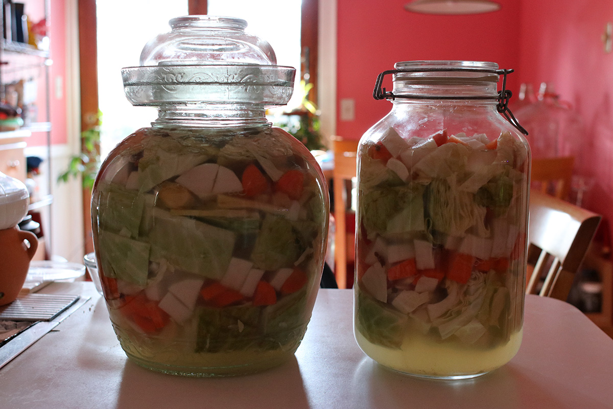the constricted neck of the sichuan paocai jar is perfect for keeping the floating vegetables submerged. the fido jar also has a constricted neck but it's higher up, and my brine level doesn't reach that high, so the vegetables float to the top and the top layer might be dry. to compensate, i shake the fido jar whenever i can, to sort of sink the vegetables a little bit. with the sichuan paocai jar i don't have to do any of that. the paocai is definitely fermenting. i smelled something awful today that i thought was the trash (even though i emptied it last night) until i realized it was the burping paocai jar. the more burps the better,