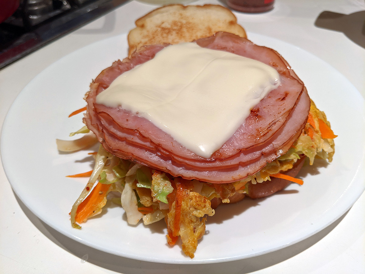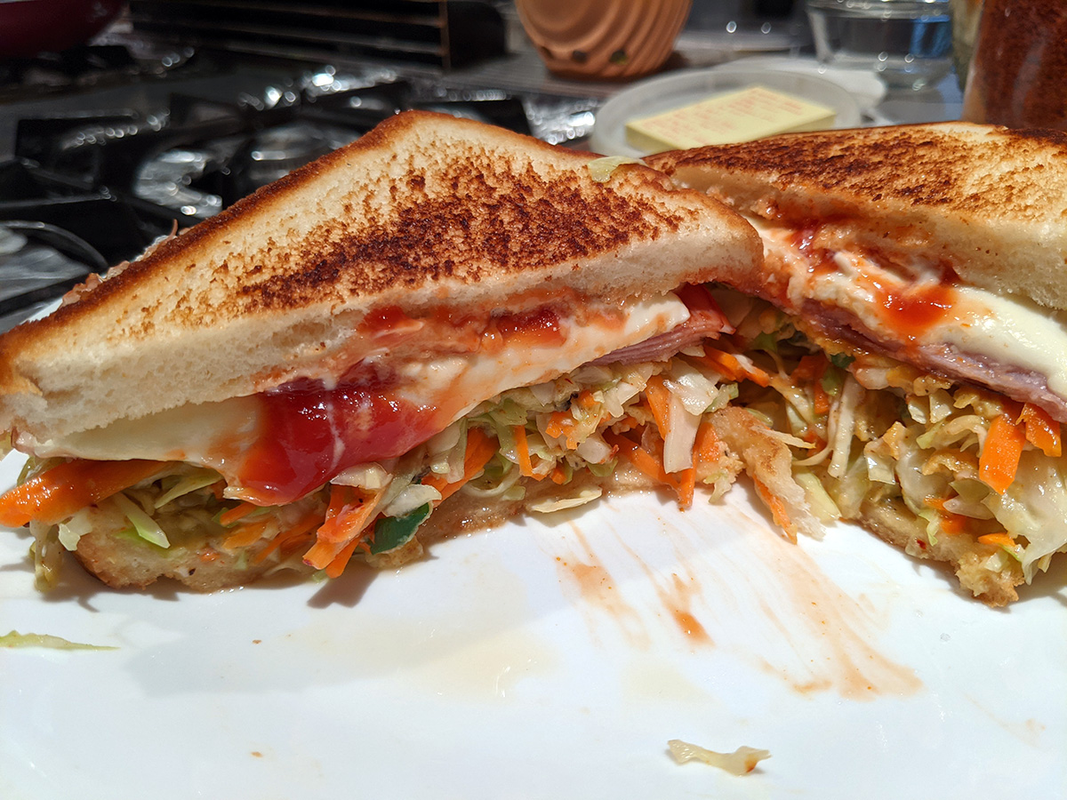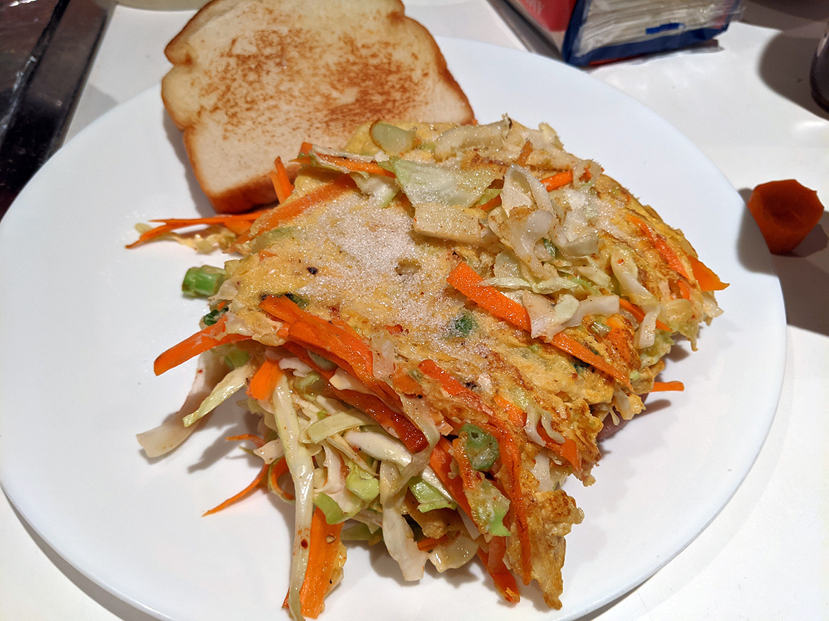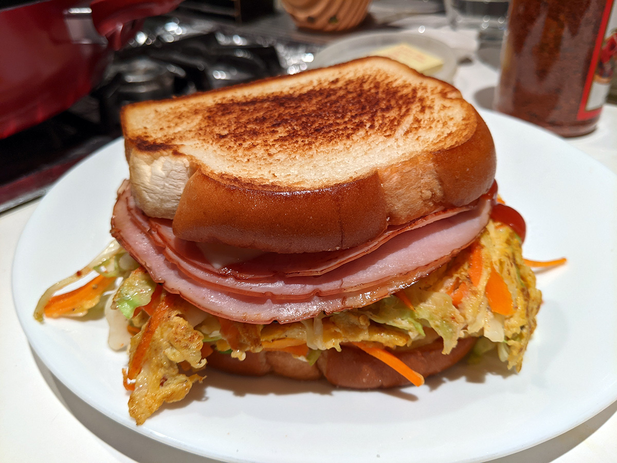 i finally made korean street toast today. the hardest part was chopping the carrots into matchsticks, i think my carrots were just too small. the recipe called for half a handful of chopped carrots and a full handful of chopped cabbage, but i went way overboard, probably had a cup of carrots and easily 2-3 cups of cabbage. when i cooked the chopped vegetables with the eggs, it was barely holding together, it was so full of vegetables. the recipe didn't call for it but i added a dash of half and half to make the eggs puffier. the final result was essentially a thick omelette sandwich with a bit of ham enhanced with cheese, mayonnaise, and ketchup. it was a mess to eat, and the bottom half of the sandwich was all soggy from having the omelette stacked on top of it. it was okay, but nothing to write home about. i'll try again tomorrow, definitely use less vegetables. why this would be popular in korea i have no idea, it doesn't seem particularly korean but mainly because i associate korean food with either spicy or meaty.