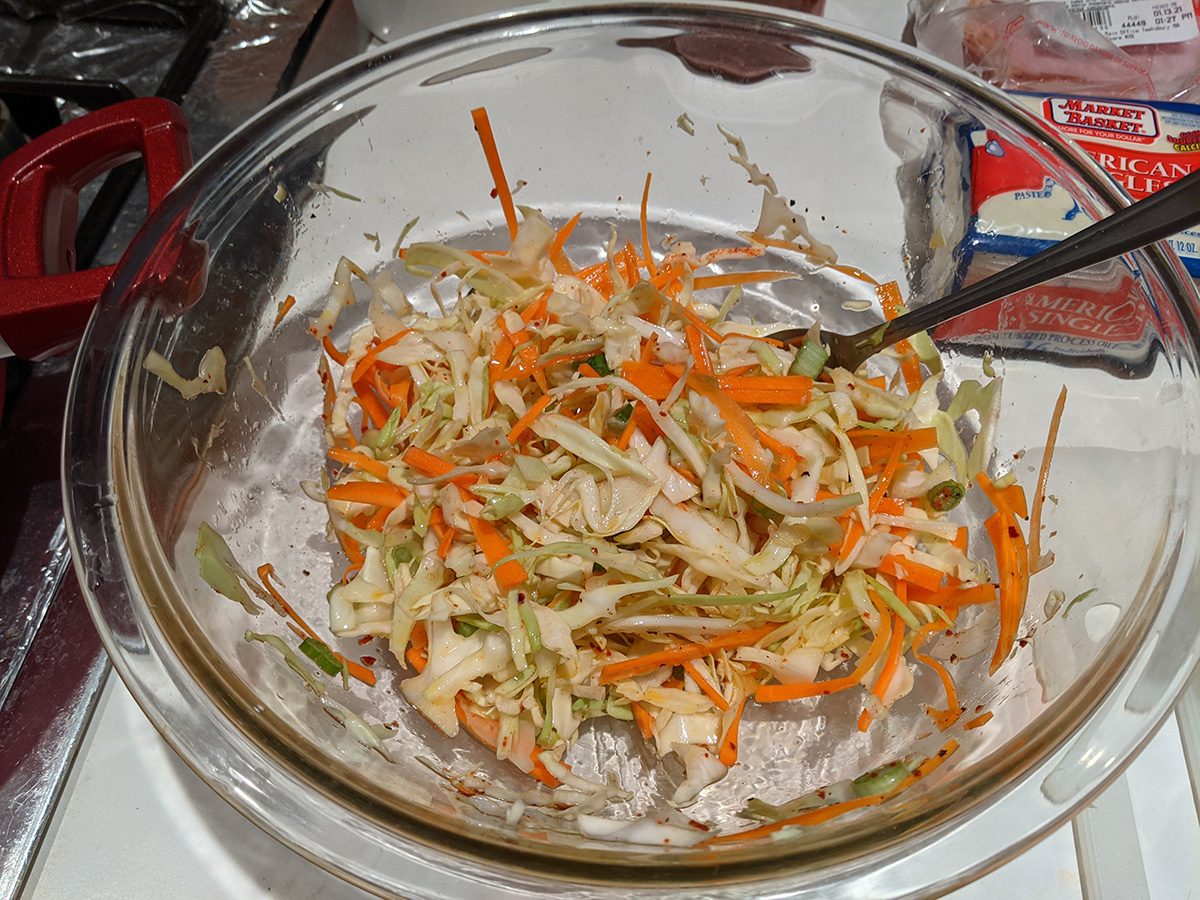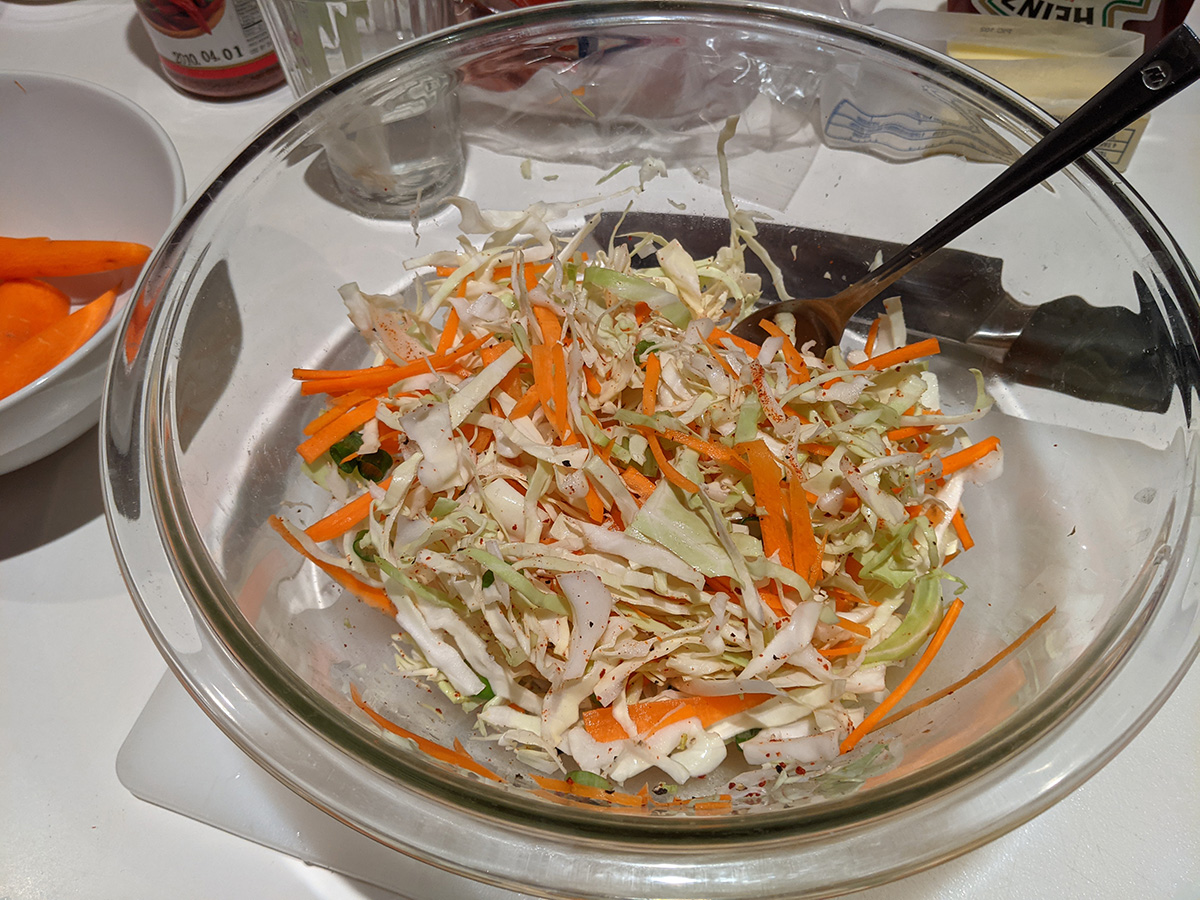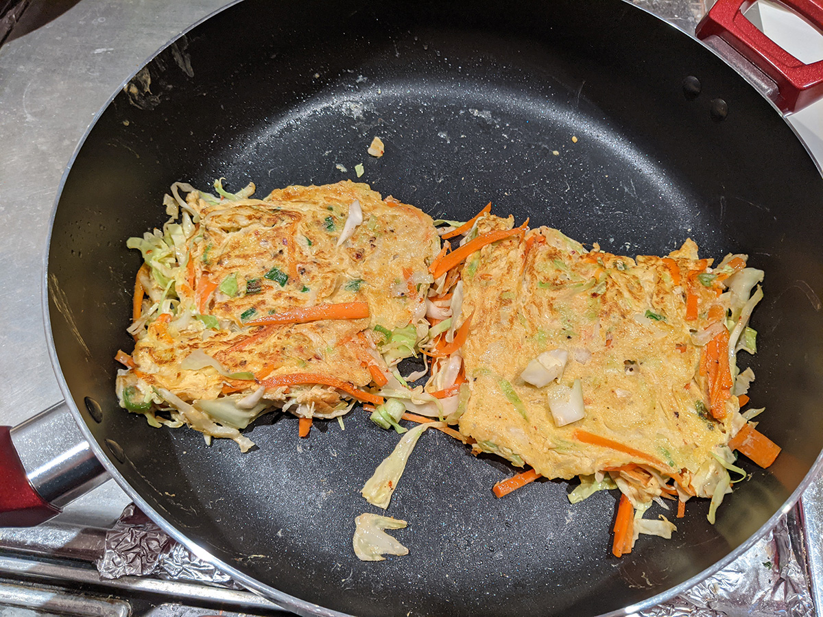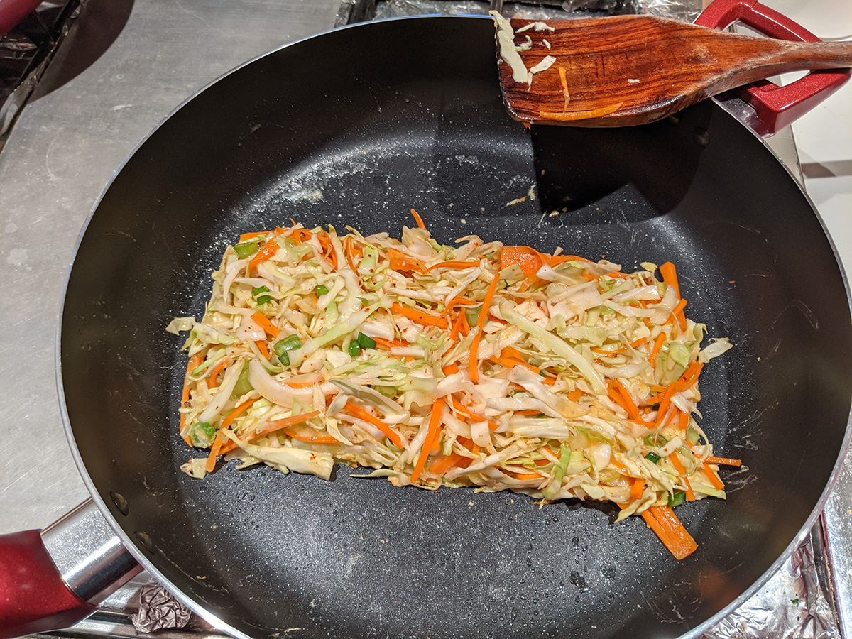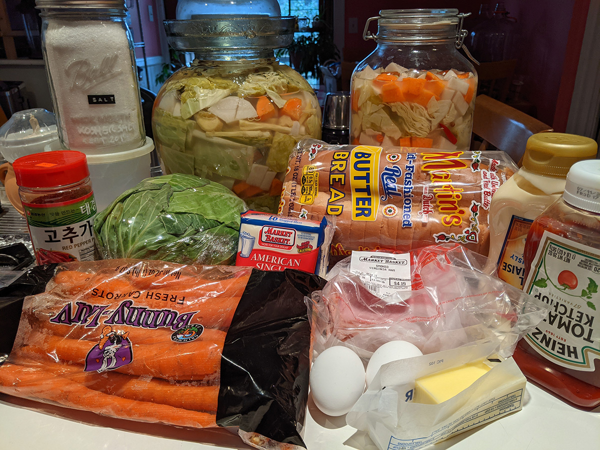 i finally made korean street toast today. the hardest part was chopping the carrots into matchsticks, i think my carrots were just too small. the recipe called for half a handful of chopped carrots and a full handful of chopped cabbage, but i went way overboard, probably had a cup of carrots and easily 2-3 cups of cabbage. when i cooked the chopped vegetables with the eggs, it was barely holding together, it was so full of vegetables. the recipe didn't call for it but i added a dash of half and half to make the eggs puffier. the final result was essentially a thick omelette sandwich with a bit of ham enhanced with cheese, mayonnaise, and ketchup. it was a mess to eat, and the bottom half of the sandwich was all soggy from having the omelette stacked on top of it. it was okay, but nothing to write home about. i'll try again tomorrow, definitely use less vegetables. why this would be popular in korea i have no idea, it doesn't seem particularly korean but mainly because i associate korean food with either spicy or meaty.