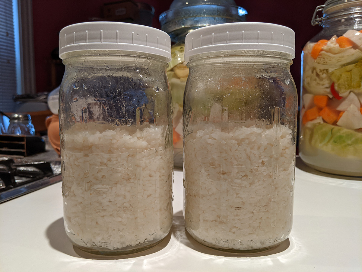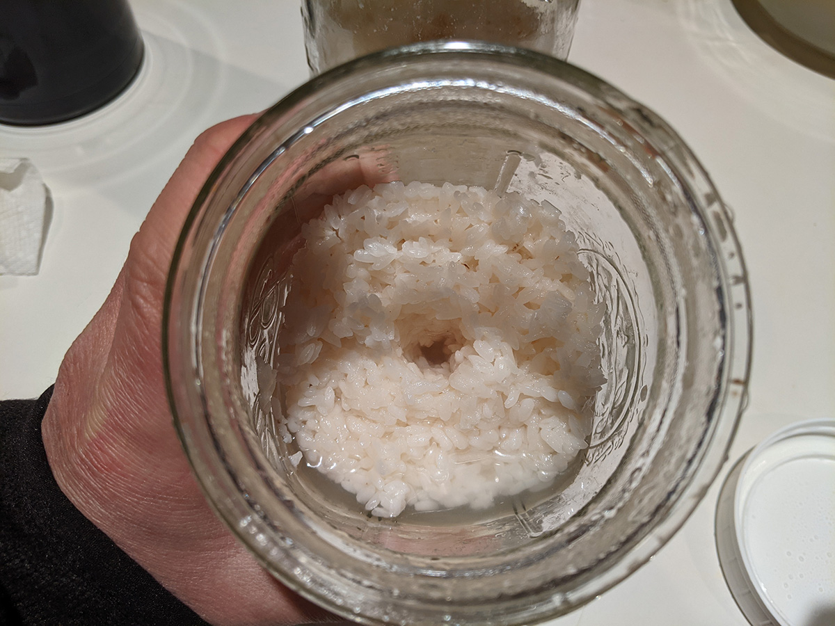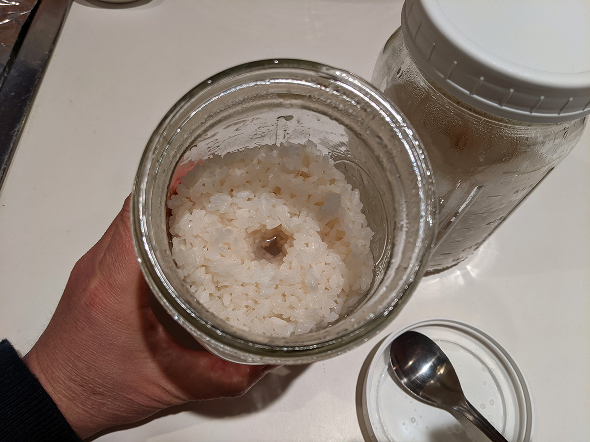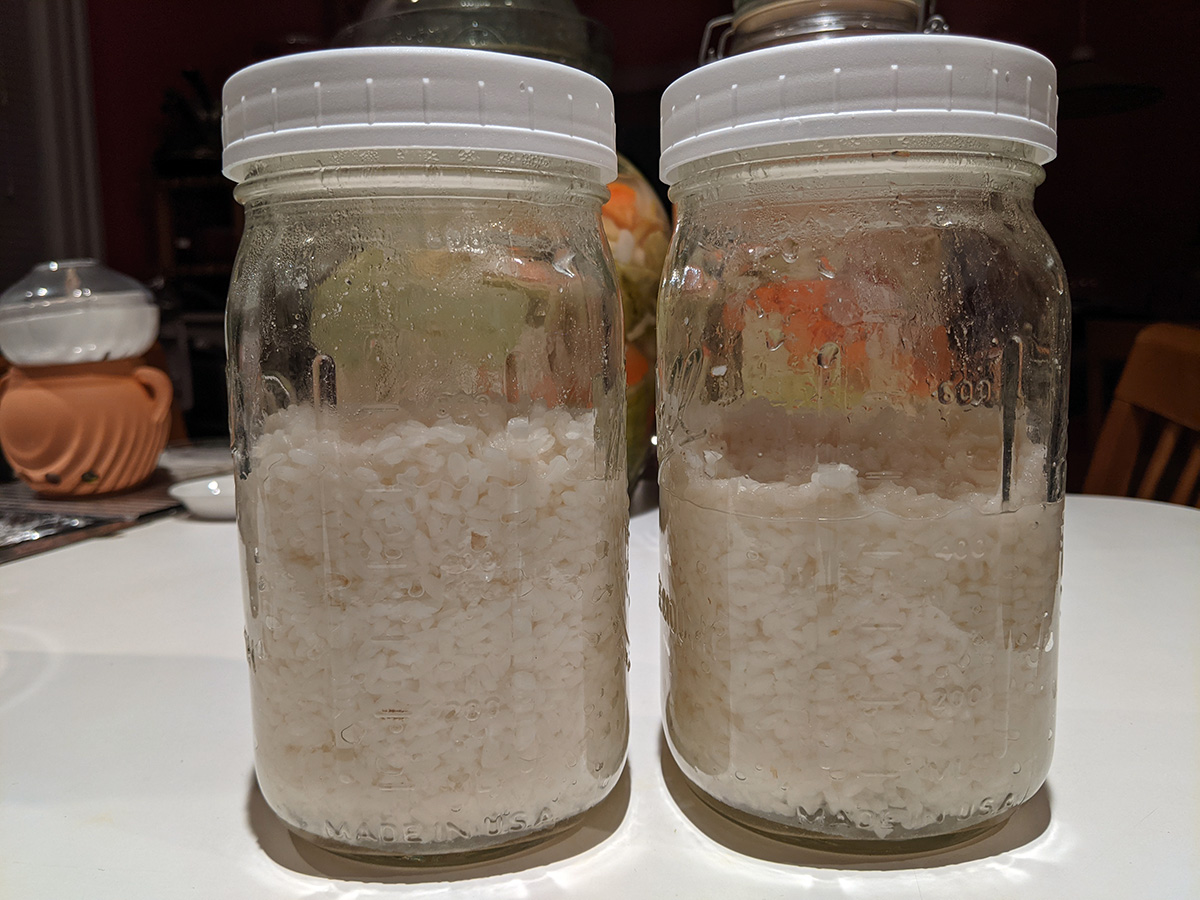 the jiu niang was finally ready today, after it's had 25 hours to ferment in the instant pot. there was definitely more liquid in the jars and the rice was sort of floating. when i opened the jar there was a distinctive jiu niang alcohol aroma, something i didn't quite get when i slow fermented. i scooped out a small spoonful to give it a taste: sweet was the dominant flavor, with a slight sour note, but nothing like when i used the crushed yeast ball to ferment. that means jiu niang powder definitely makes a different. i thought it could be sweeter so i put the jars back in the instant pot and left it to ferment for another 6 hours.