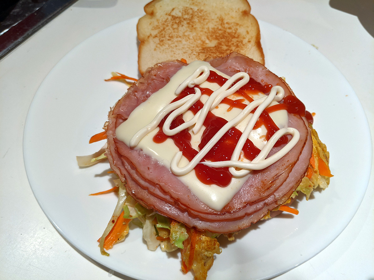 | toast the bread in butter, set aside. chopped vegetables and mix together with pepper, chili powder, salt. mix with eggs and some half & half. sauté egg vegetable mixture, form into rectangle then make into two squares. cook on both sides. stack cooked vegetables egg onto one slice of bread, add sugar. cook ham add cheese to melt. layer ham & cheese onto sandwich and squirt some mayonnaise and ketchup. | |