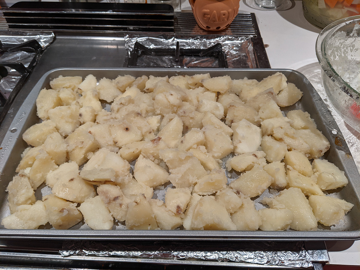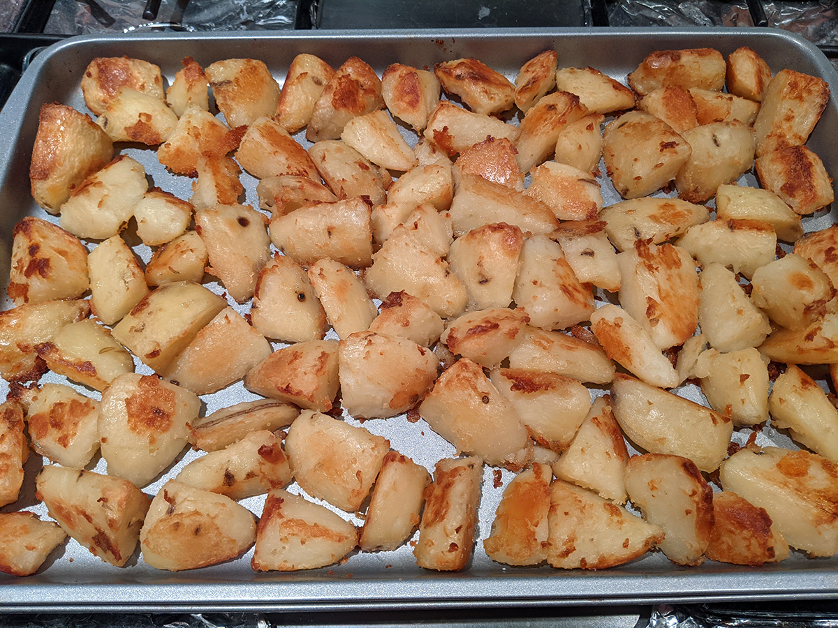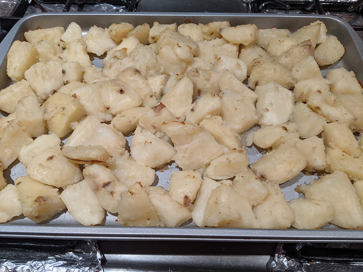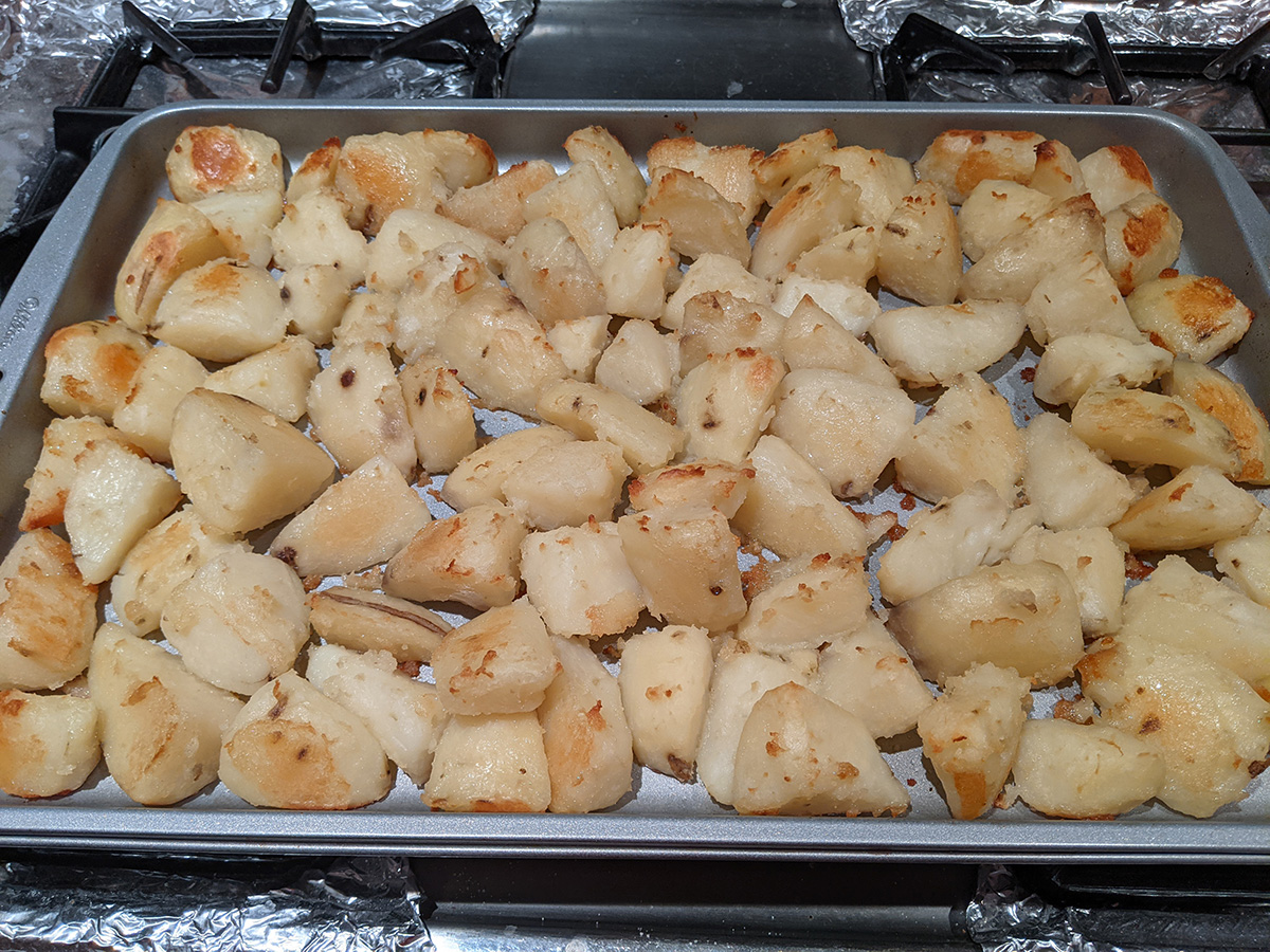 in the evening i made kenji lopez-alt's crispy roast potatoes. the recipe called for 4 pounds of potatoes, i used up the entire 5 pounds of russet. i tossed the cooked potatoes in 5 tbsp of garlic-infused bacon fat then baked them in the oven for an hour, turning them a couple of times so they could brown evenly. the final result was okay, but i wasn't going to finish 5 lbs. of starch in a single night. having the oven on did warm up the house a bit, and the garlic-infused bacon grease left a savory smell in the house (if you like that sort of smell).