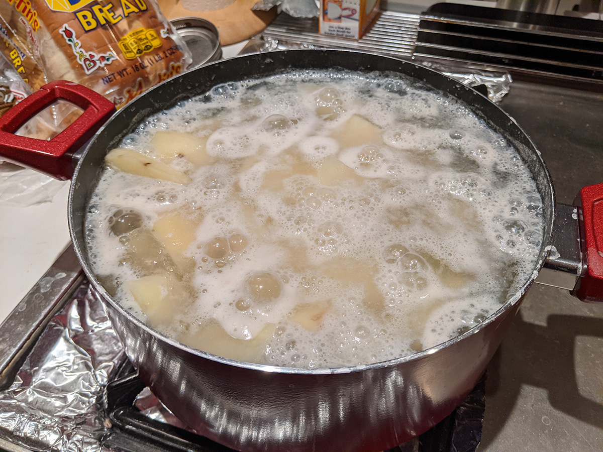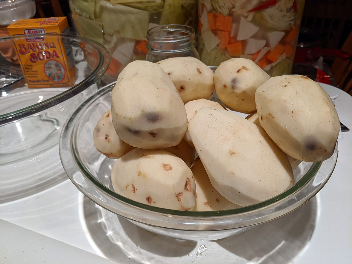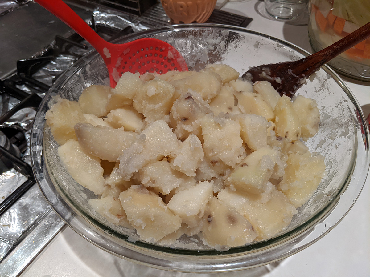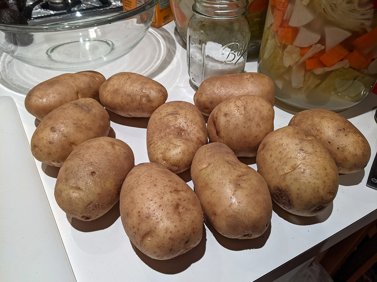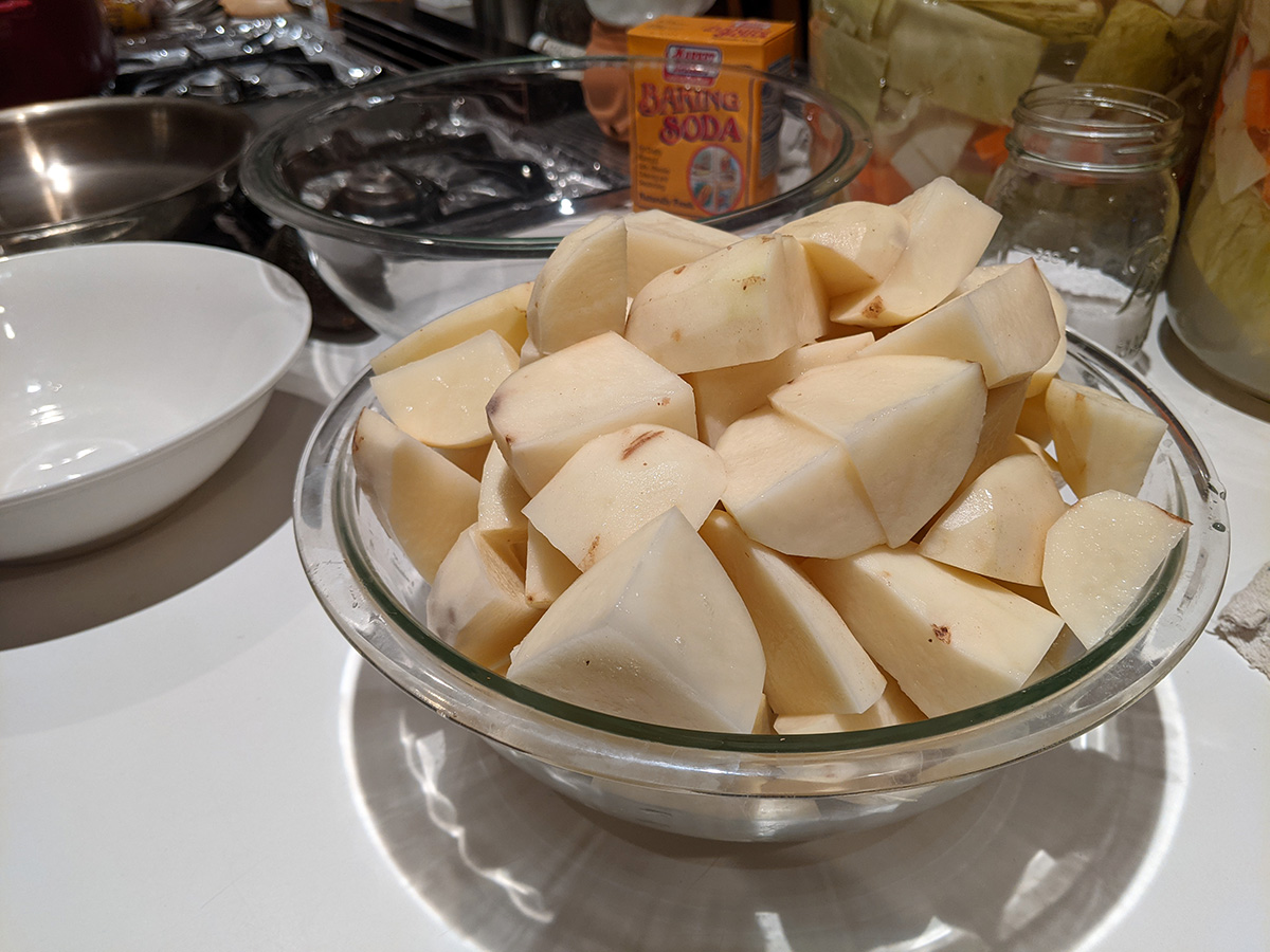 in the evening i made kenji lopez-alt's crispy roast potatoes. the recipe called for 4 pounds of potatoes, i used up the entire 5 pounds of russet. i tossed the cooked potatoes in 5 tbsp of garlic-infused bacon fat then baked them in the oven for an hour, turning them a couple of times so they could brown evenly. the final result was okay, but i wasn't going to finish 5 lbs. of starch in a single night. having the oven on did warm up the house a bit, and the garlic-infused bacon grease left a savory smell in the house (if you like that sort of smell).