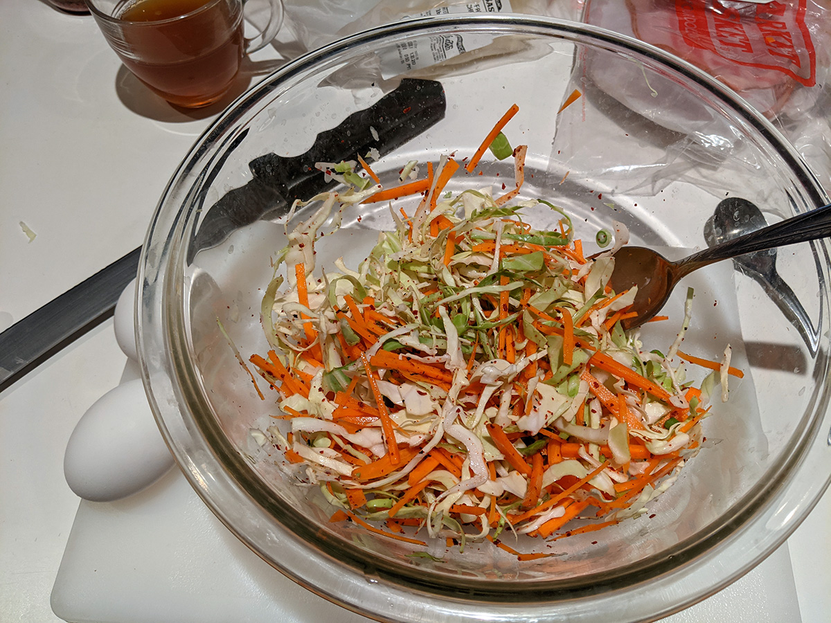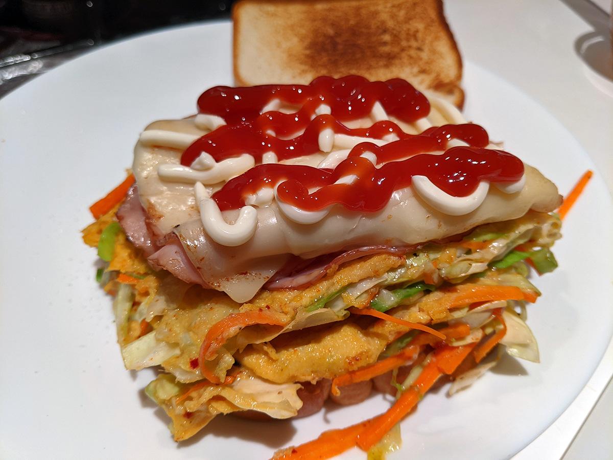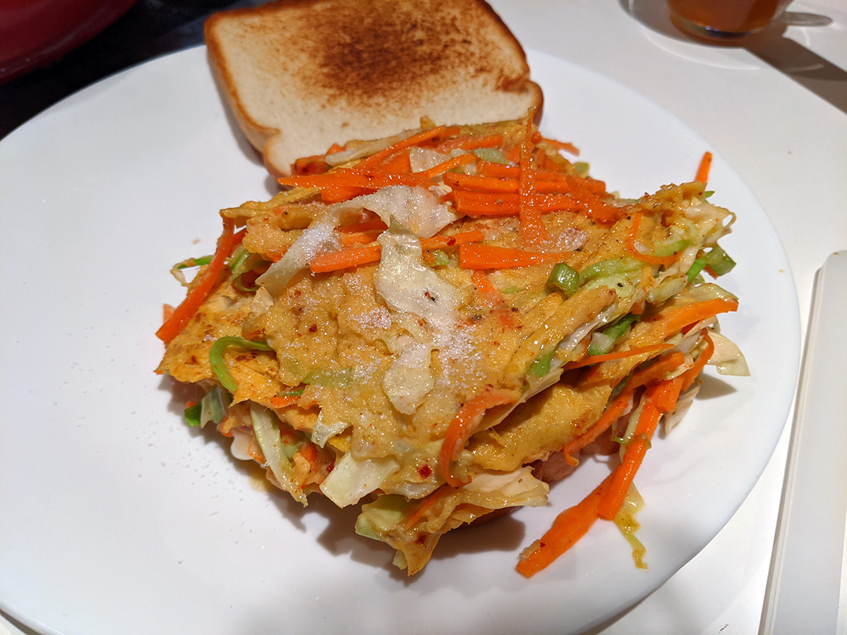 for lunch i made another korean street toast. i used less cabbage and carrots this time, the sandwich still came out a mess, soggy on the bottom, washed my hands a few times just to eat it.