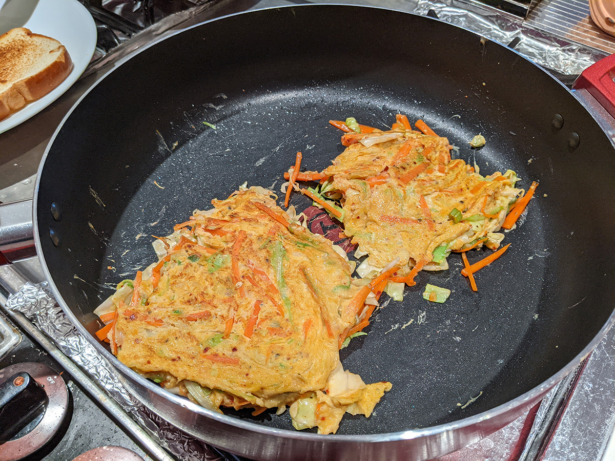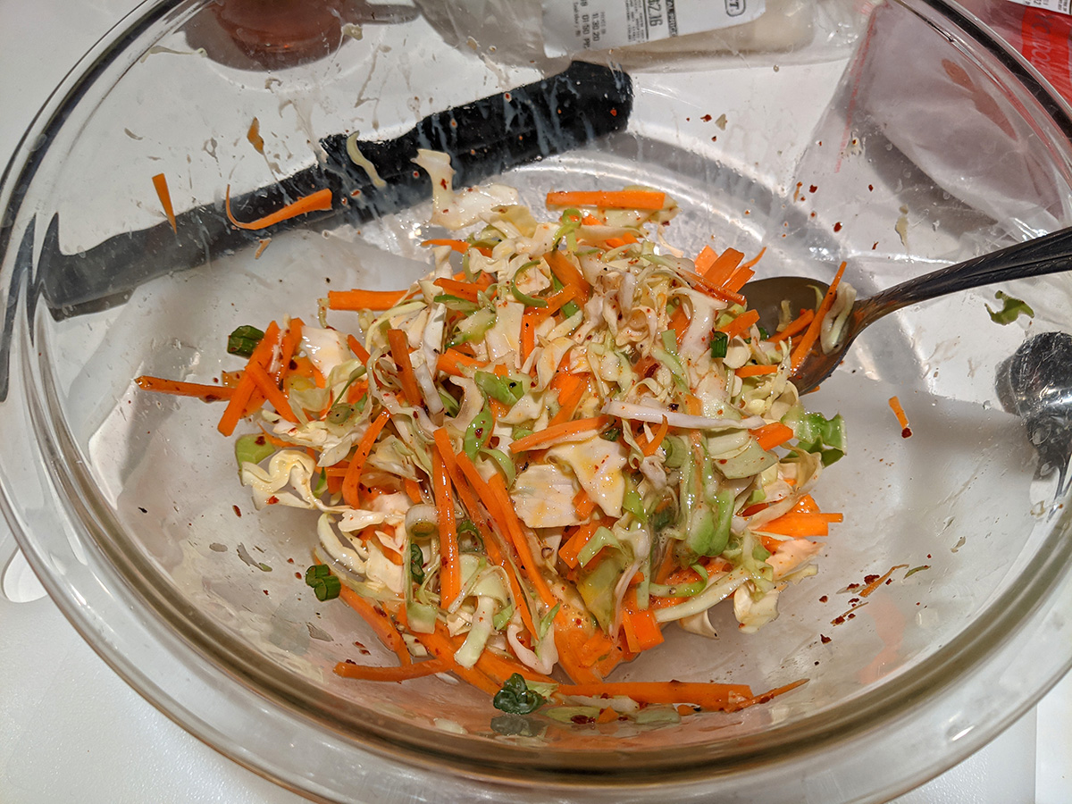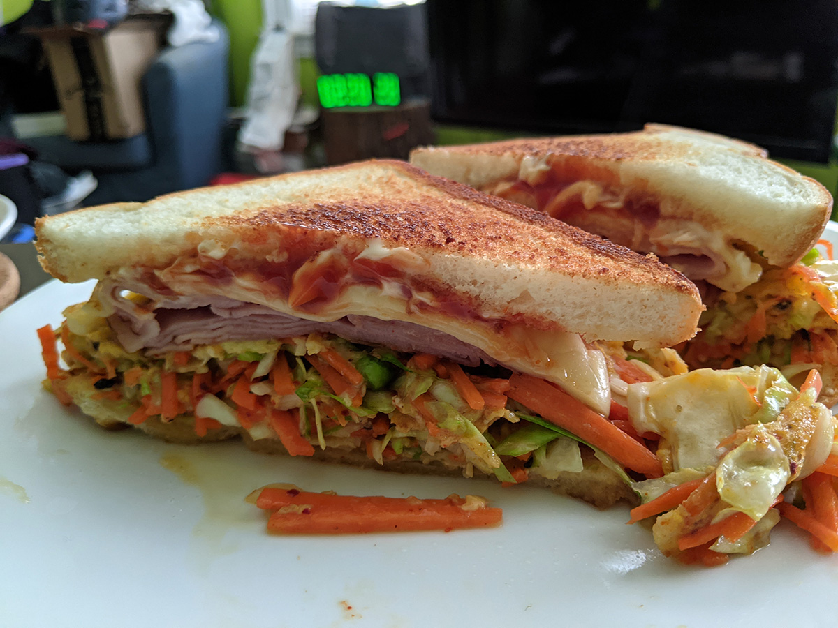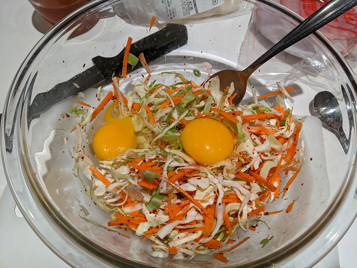 for lunch i made another korean street toast. i used less cabbage and carrots this time, the sandwich still came out a mess, soggy on the bottom, washed my hands a few times just to eat it.