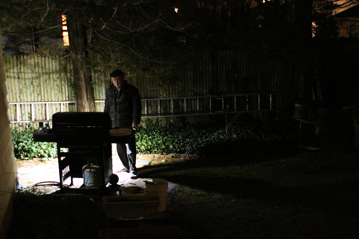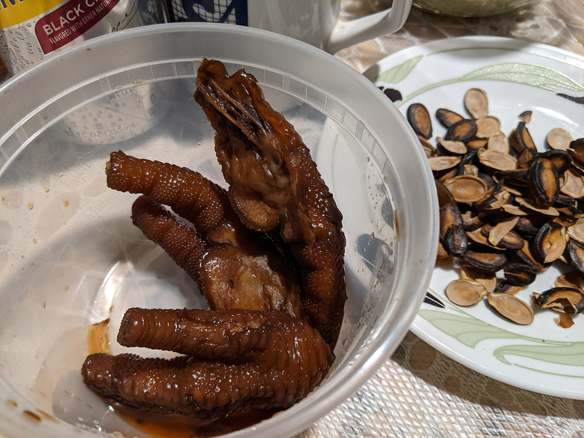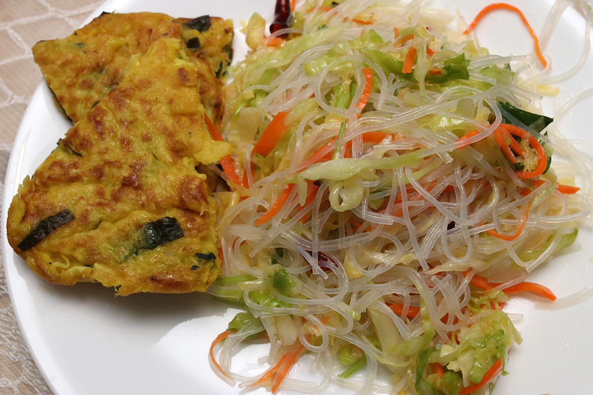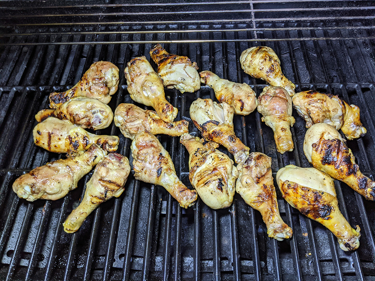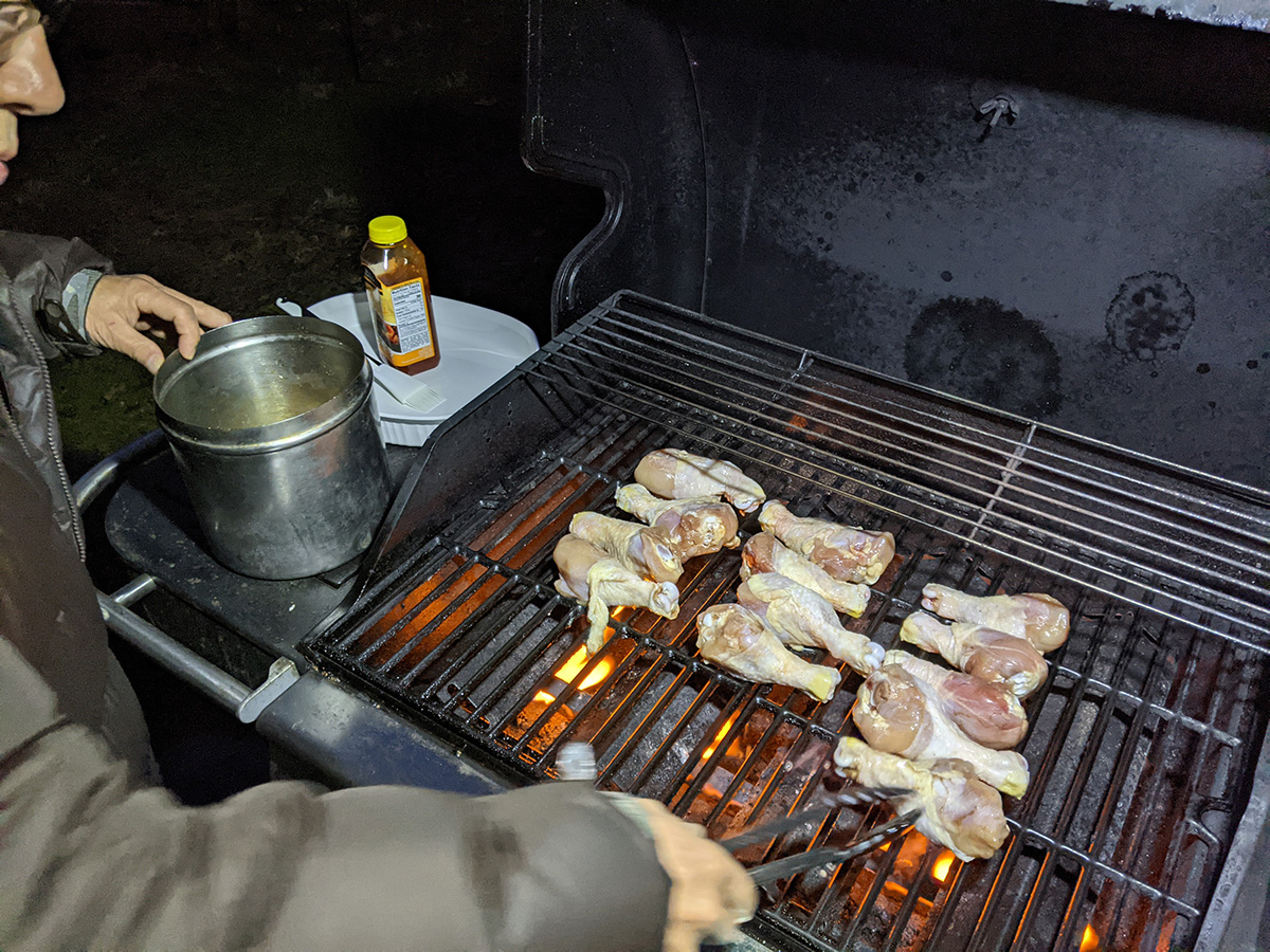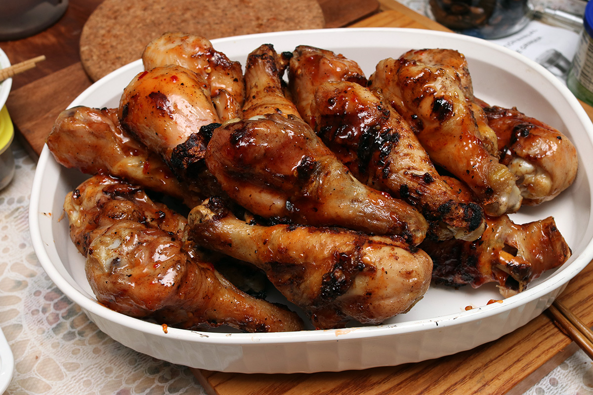 we didn't have rice for dinner. instead, my mother made a bowl of glass noodle salad while my father and i were outside barbecuing drumsticks. tonight was the best night to do it, as tomorrow and monday the temperature will be colder. my mother had marinated the drumsticks at least a day, and we grilled them on high heat, 10-15 minutes per side, before slathering on the sweet chili sauce and cooking them a few minutes more on low heat for the sugar to caramelize a bit.