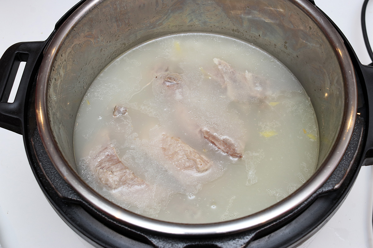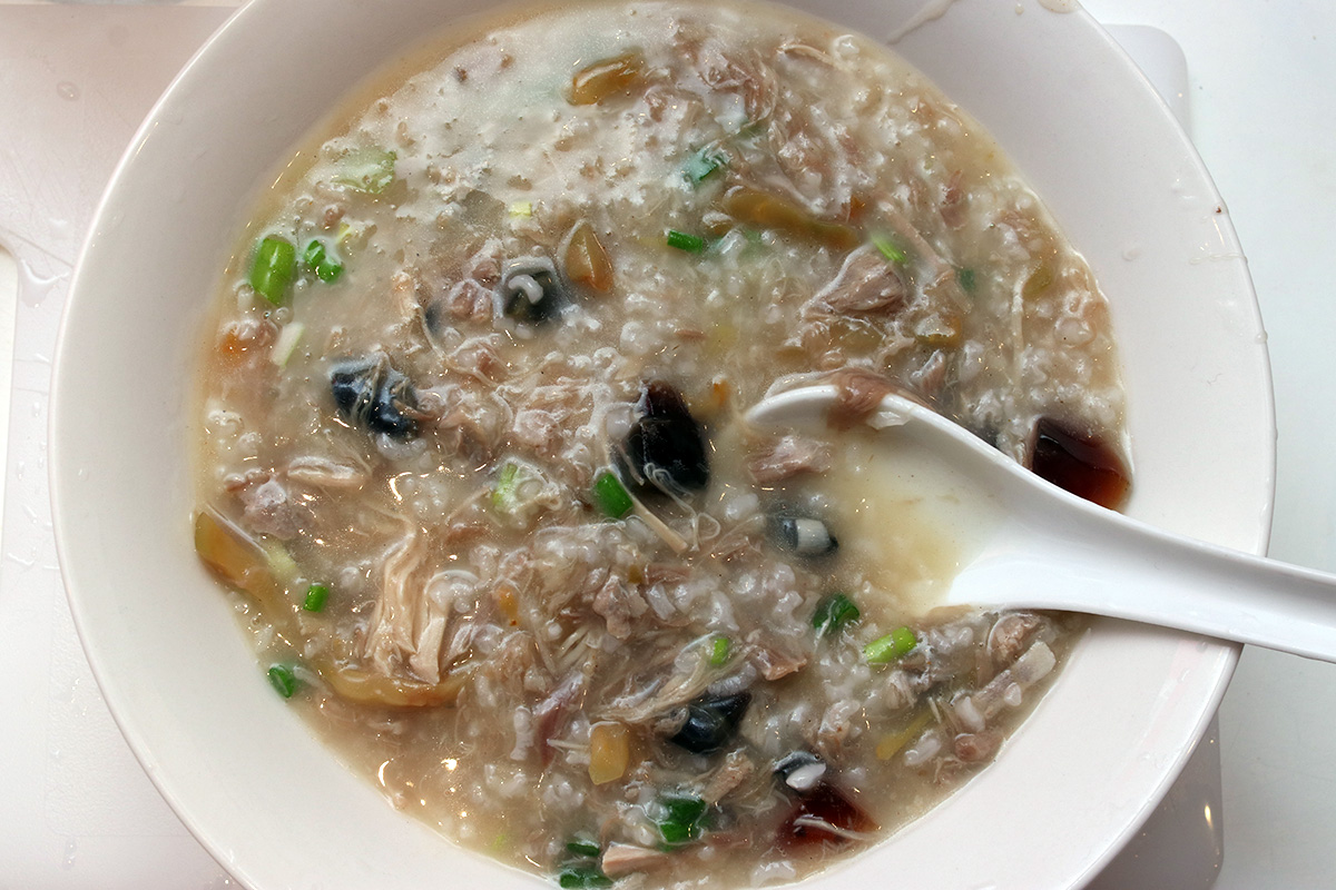 | marinate pork with salt for 6 hours or leave overnight in fridge. blanch pork in boiling pot of water for 3 minutes. add rice, water, ginger, and pork to instant pot and cook on high pressure for 35 minutes. let cool naturally (natural release) for 20 minutes before venting remaining pressure. remove pork, discard bone, shred meat. season with salt, sesame oil, and ground white pepper before returning to instant pot. medium sauté t thicken congee, add chopped century eggs, shredded pork, pickled radish, and scallions. once desired consistency reached, serve. | |