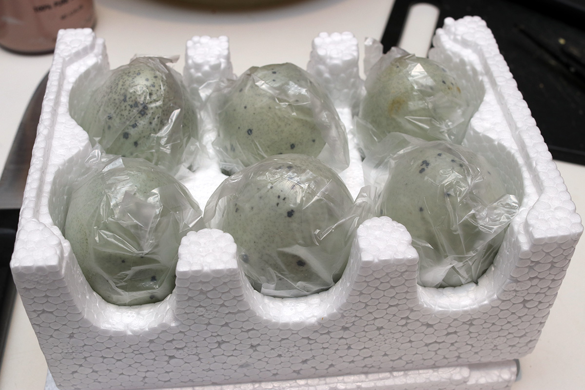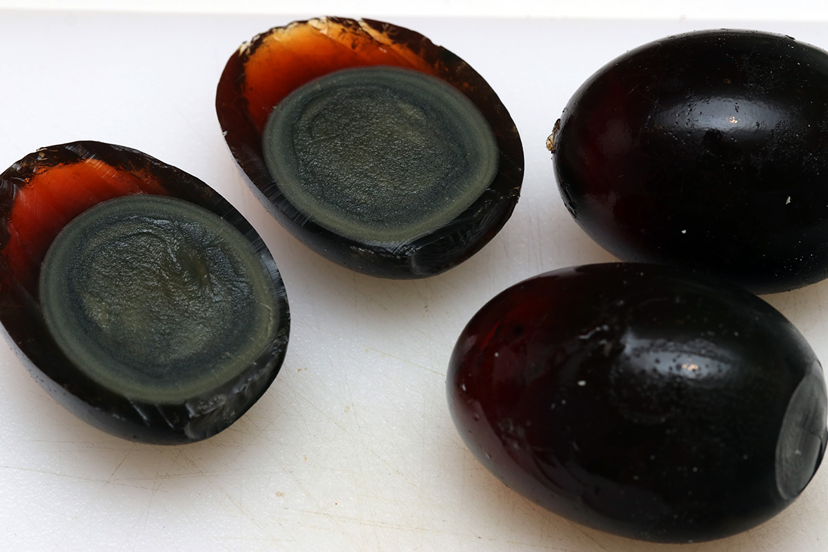 i chopped up 3 century eggs. i've never worked with century eggs before, this was my first time. i'm not a fan, with the exception of when it's a congee ingredient. i would never eat a century egg as-is, i find it kind of revolting. the translucent dark "egg white" i can tolerate, but the slimy green "egg york" does not look appetizing at all. plus these eggs have a funky smell that would otherwise warn you it wasn't edible.