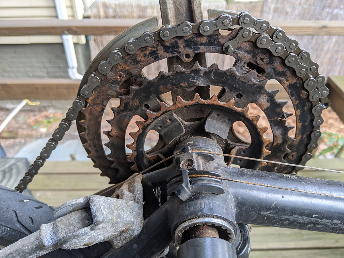 later, while examining photos i took of my bike repair, i realized it wasn't the chain that was the issue, but rather the chainring itself, with a lot of teeth worn down to the nub. i remember doing a crankset replacement before and i searched through my blog but the only record i have is from back in 2009 when i replaced the crankset on my old bianchi bike. it seems the crankset on my trek utility bike is still the original crankset. i have however replaced the rear freewheel on two occasions (2011 and 2016, every half decade), and did remove the crankset once before but just to check the bottom bracket length (2012). maybe if i adjust the rear derailleur i could fix the skipping issue, otherwise i'll need to replacement the crankset. it's not a big deal but it's hard to work outside during the winter and repairing the bike indoors is a dirty affair (i could try the basement).