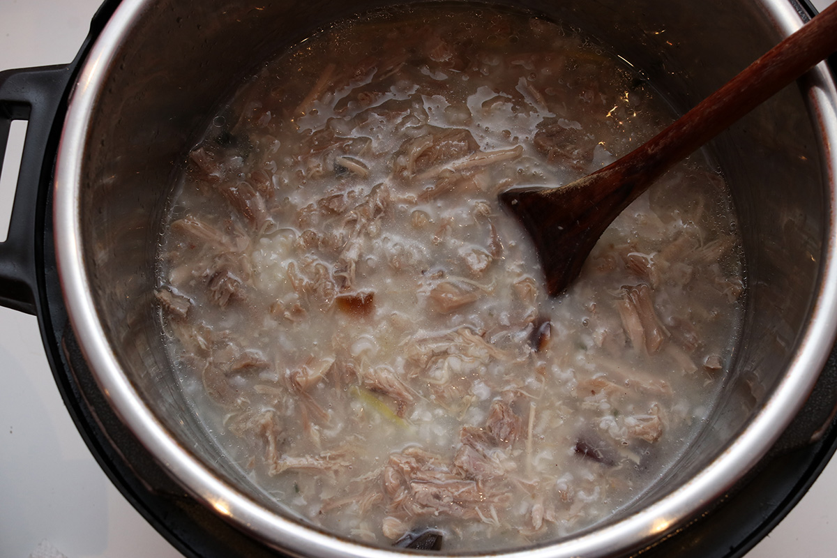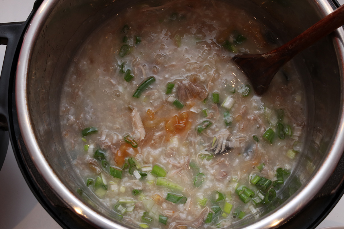 i tossed the shredded pork and chopped century eggs back into the instant pot with the bone broth congee, along with some chopped scallions and a package of pickled radish. i then put the instant pot on medium sauté to thicken the congee before it was ready to serve.