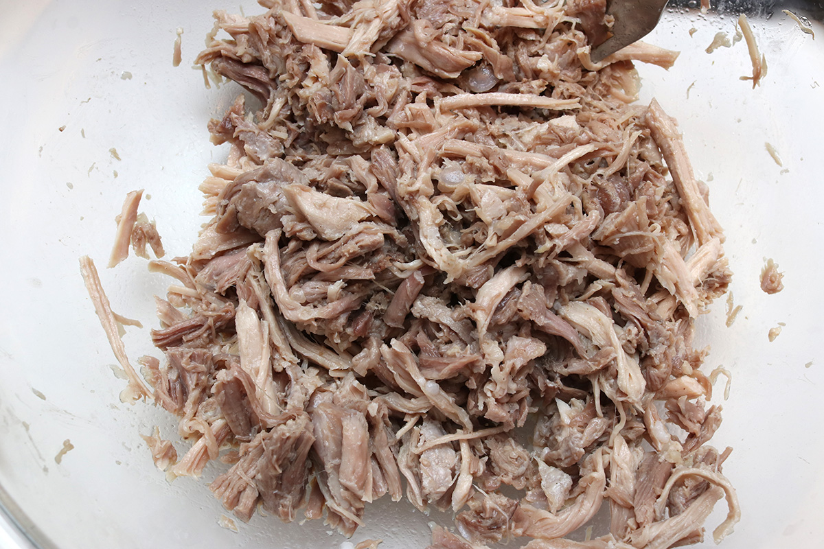 i took out the pork, was at this point was practically fall off the bone. i tasted a small piece, just as i feared, it was pretty bland. i put the spare ribs in a bowl and removed the bones before shredding the pork. i then seasoned everything with salt, sesame oil, and white ground powder. i tasted the pork again, much better.