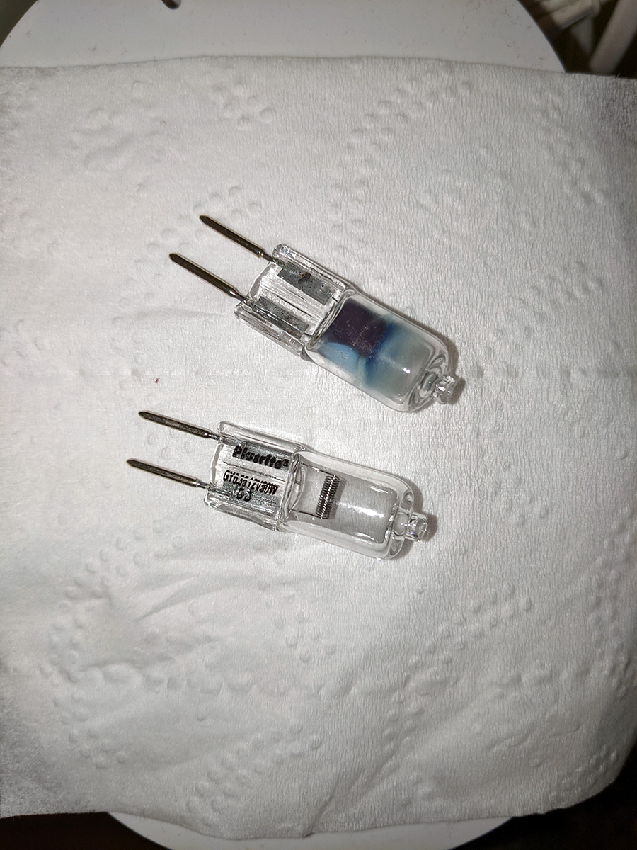 i noticed it last night: my bathroom light was unusually dim. i thought it was my imagination, but when i turned it one tonight, something was off. so i unscrewed the fixture and examined the halogen (xenon) bulb. sure enough, it looked like it was blown out although the bulb was still shining, just not as bright. fortunately i had a spare bulb and quickly replaced it (GY6.35 12V 50W). when i turned it on the difference was night and day. the above-sink bathroom fixture is the only light in the house that hasn't been converted to LED's yet. i've been searching but maybe the technology still hasn't caught up yet. these GY6.35 5W LED bulbs might be a good candidate though, i might get some to try out.