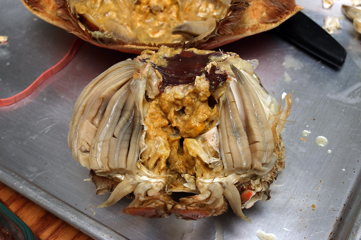 i can't remember the last time i ate crabs. i've eaten lobsters more often than i have crabs, neither of which i like very much (although i do find chinese stir-fried chopped lobster to be very delicious). i wasn't going to have any but tried a few pieces out of curiosity. immersed in a ginger & vinegar dipping sauce, the crab was actually pretty good, turned me back out to them. afterwards my father broken open the body and steamed them a bit more before eating the rest. i tried the broth that was created from the crab's inner organs: very naturally salty, with a strong seafood taste, almost like sipping seaweed cooked in salt water. my father not only drank the broth but also ate most of the guts. only later did i read that sometimes the guts can be toxic (though the crab came from whole foods i heard, so i'd imagine it's fairly fresh stock).