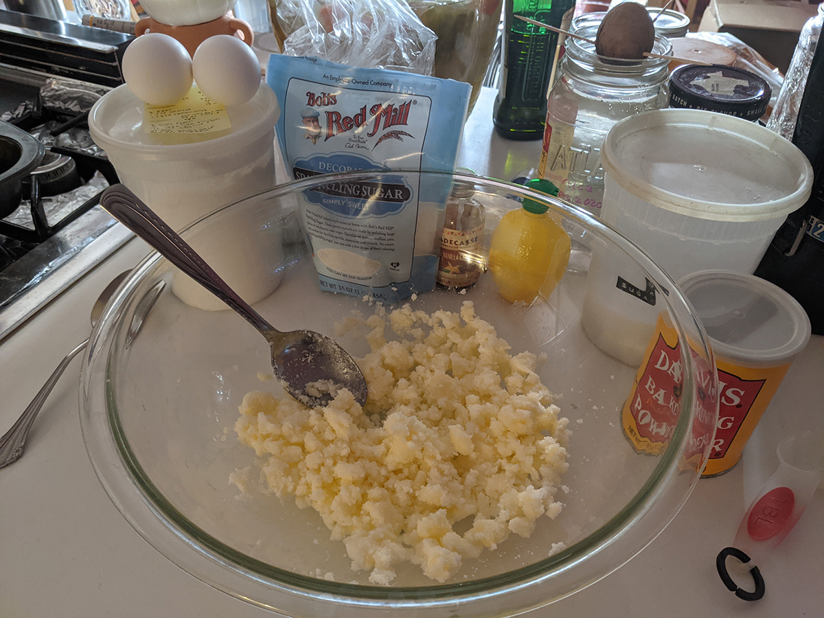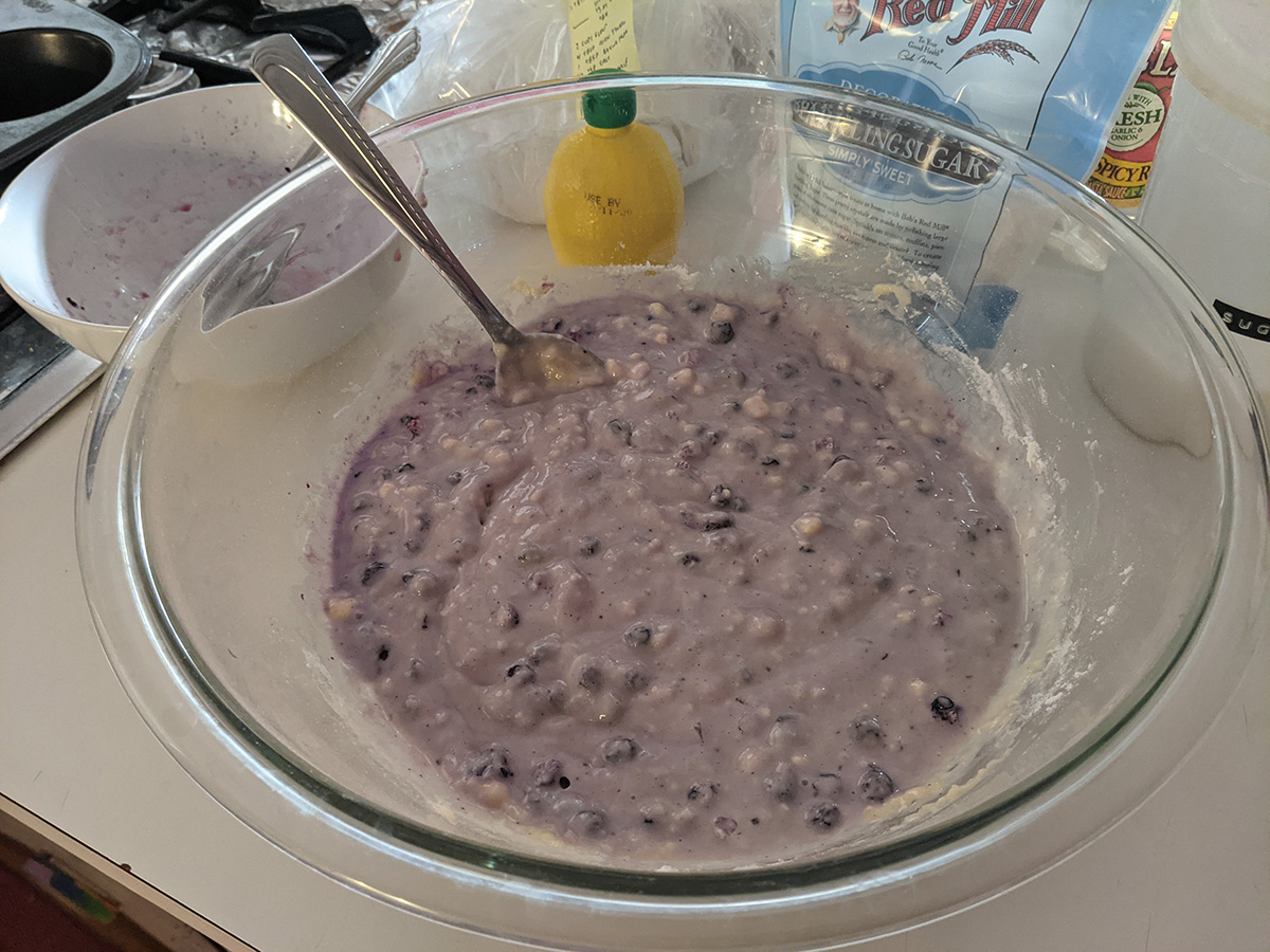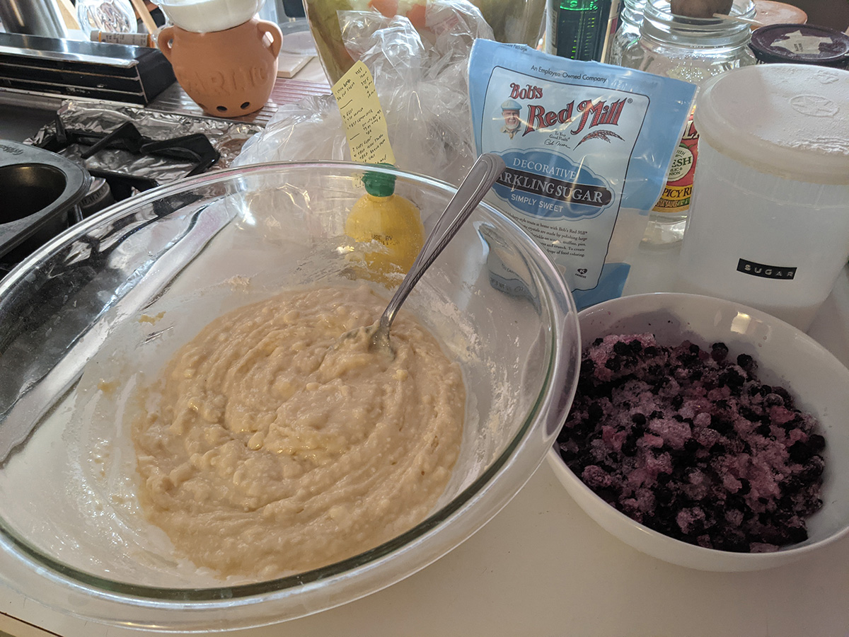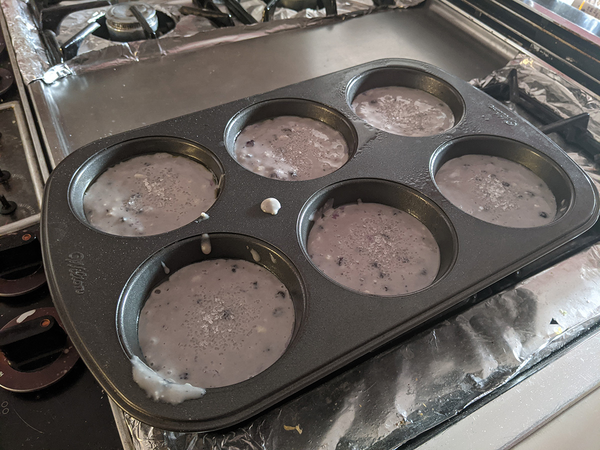 in the meantime, when i finally got out of bed, i made another half dozen blueberry muffins. this time i used the cake flour my mother gave me. i think i ruined the batter though because i was using old frozen blueberries that seemed to have thawed and refroze, so that there were a lot of ice crystals. when i finally added what was supposed to be 2 cups of blueberries, it contained a lot of ice that melted which then made the batter two wet. the final muffins were very much like my normal muffins except they looked a little different, a more uniform bottom crust. the wet batter also dissolved the sparkling sugar topping.
