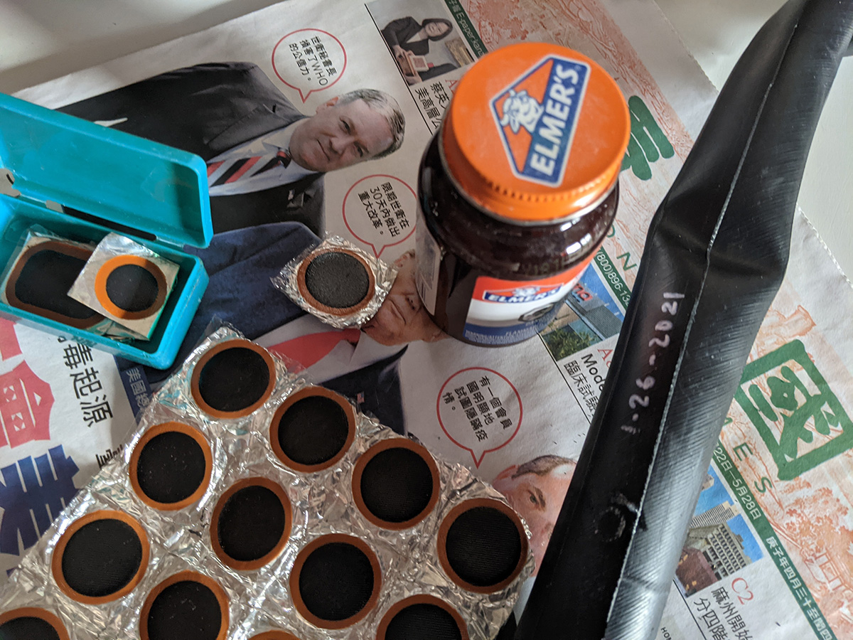 so in the ended i decided to keep on using the old tube. i sanded the tube surface, applied some rubber cement, and stuck on a piece of rubber patch. i then slightly inflated the tube and put it back in the tire before remounting the tire onto the rim. i inflated the tire to full then kept an eye on it to see if it'd deflate. it held up well, meaning the patch was successful.