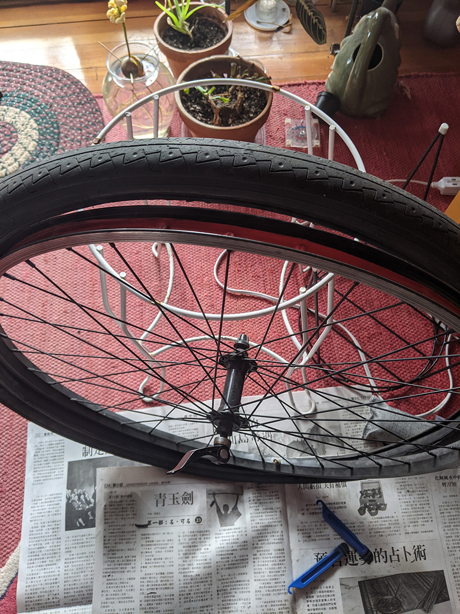 the muffins were finally ready by around noontime. i called my father telling him i was dropping by the cafe so we could install the temperature sensor. i packaged up my muffins in an insulated bag and went into the backyard with my newly fixed tire and put it back on the bike.