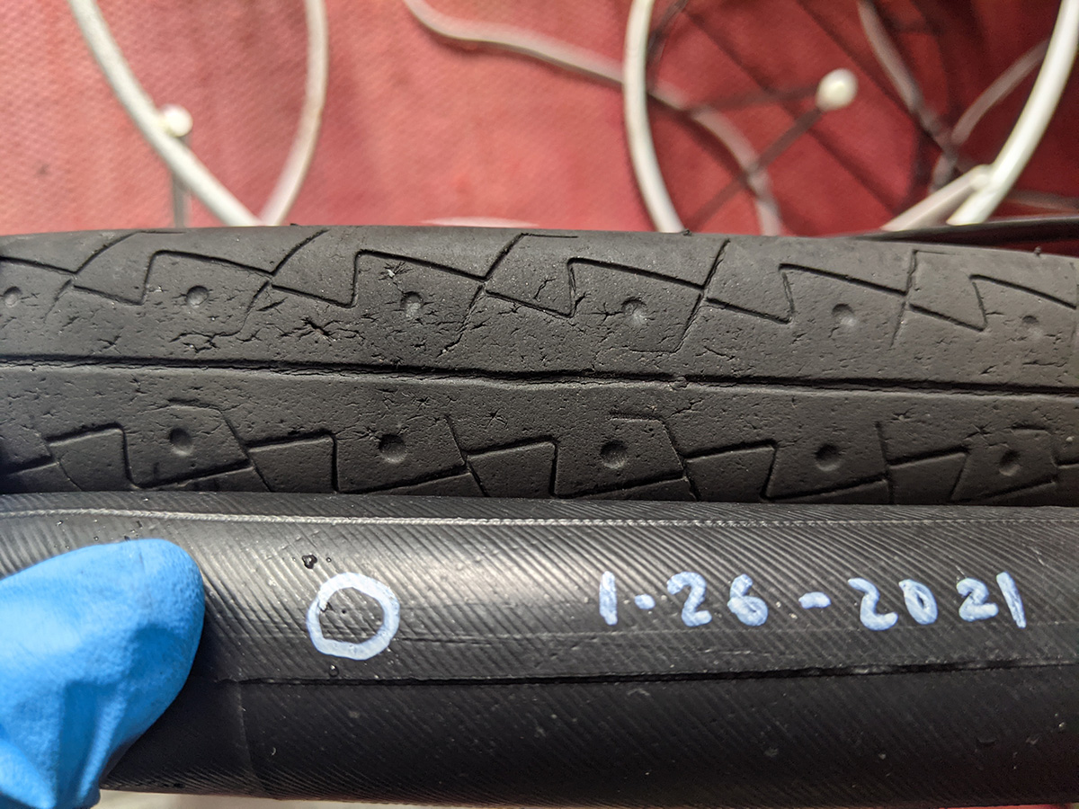 after drying off the inner tube and marking the location of the hole, i went back to the tire and matched the location to see where it'd punctured. sure enough, there was something embedded in the rubber tire. originally i thought it was a piece of metal but it was actually a shard of glass. originally i was going to replace the inner tube with a new one, but when i checked my bike supply box i discovered the spare inner tube had been previously patched as well.