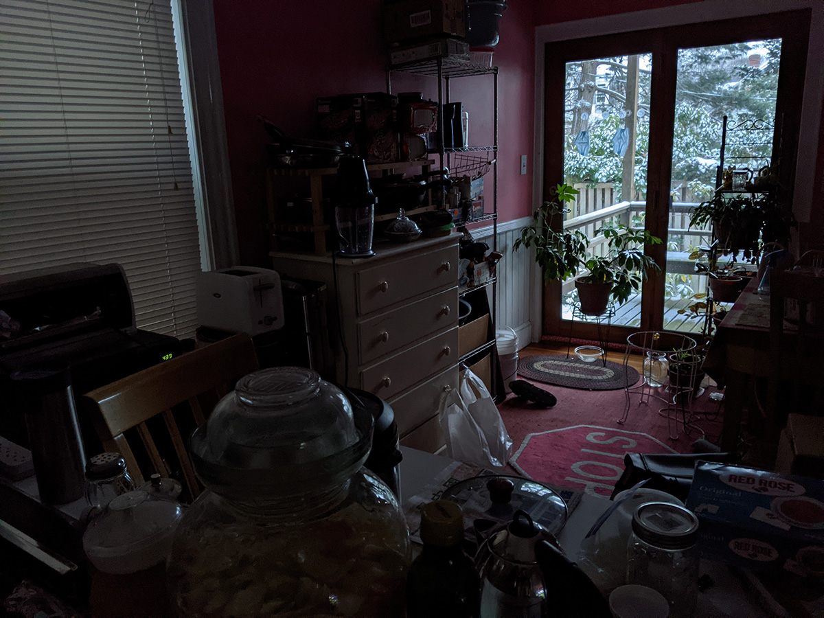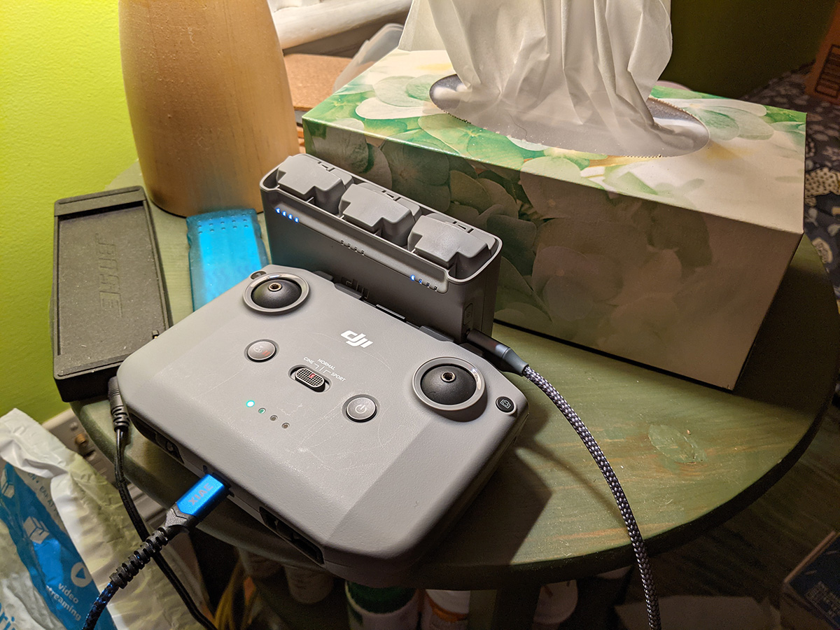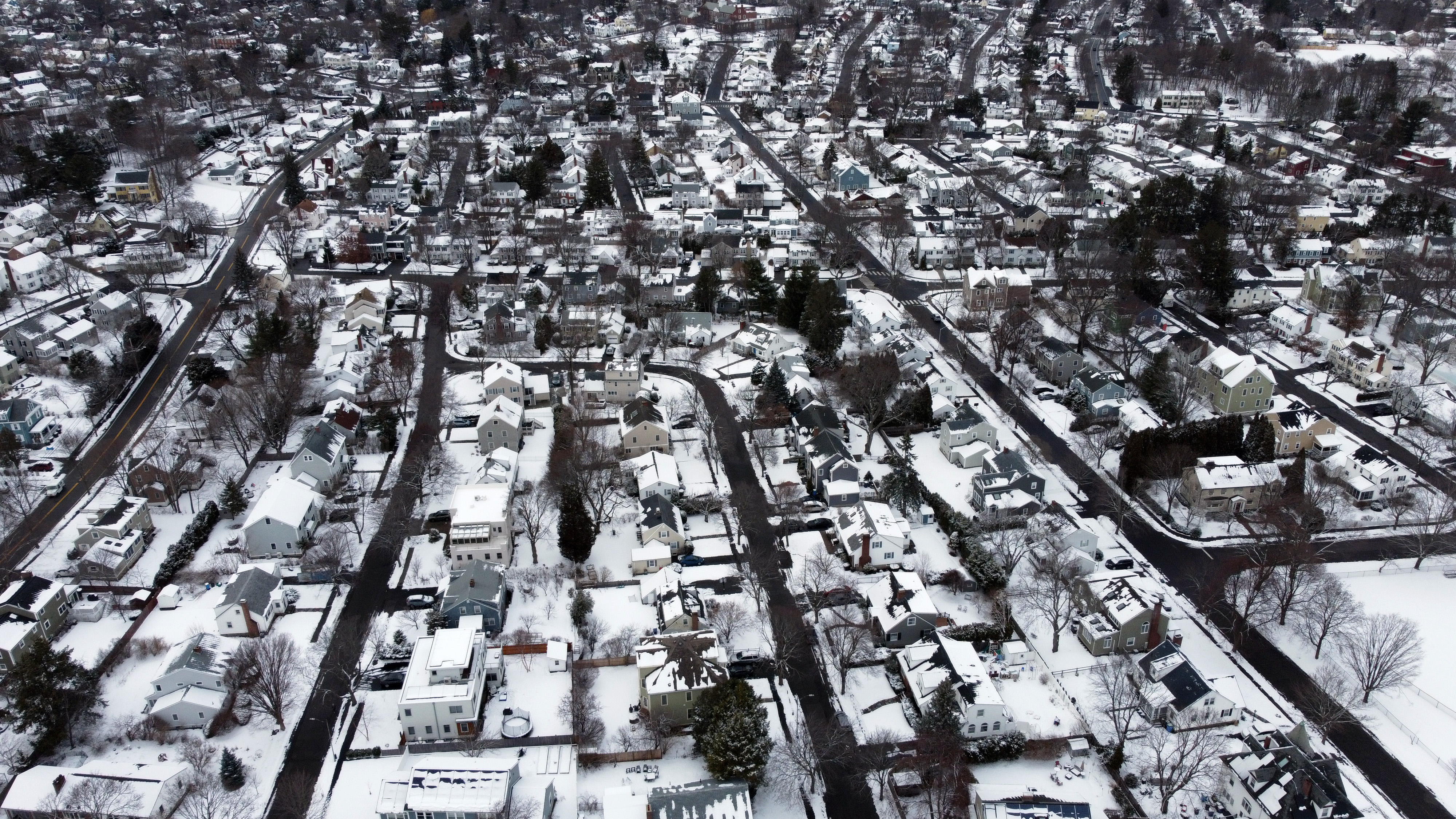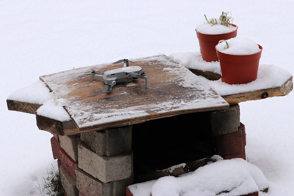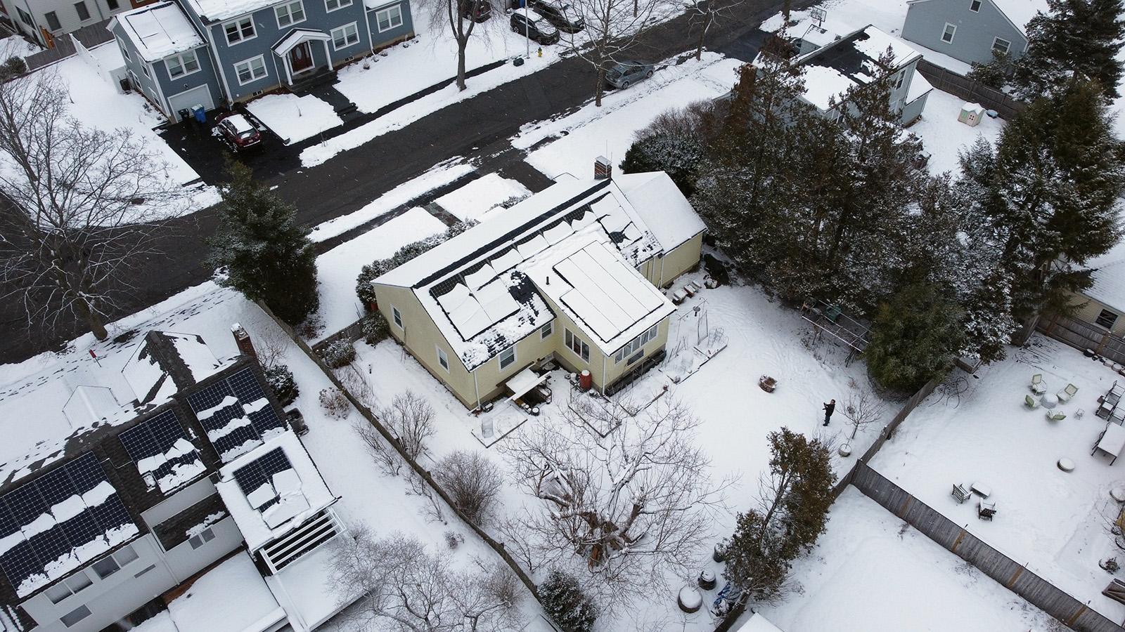 when i got to belmont, i shoveled the sidewalk and cleared the bit of snow off of the car. i then got the foam roof rake from the garage and went into the backyard to inspect the solar panels using the drone. even though temperature was below freezing, even though it was still snowing, i opted to fly. as long as the battery is warm, the DJI mini 2 can fly in subzero weather, though battery life is diminished. as for the snow, when the propellers are spinning, they sort of act as snow repellent. it was light snow anyway, and safer to fly in the snow than in the rain, though i've seen videos of people flying in the rain as well, so the drone is pretty tough.