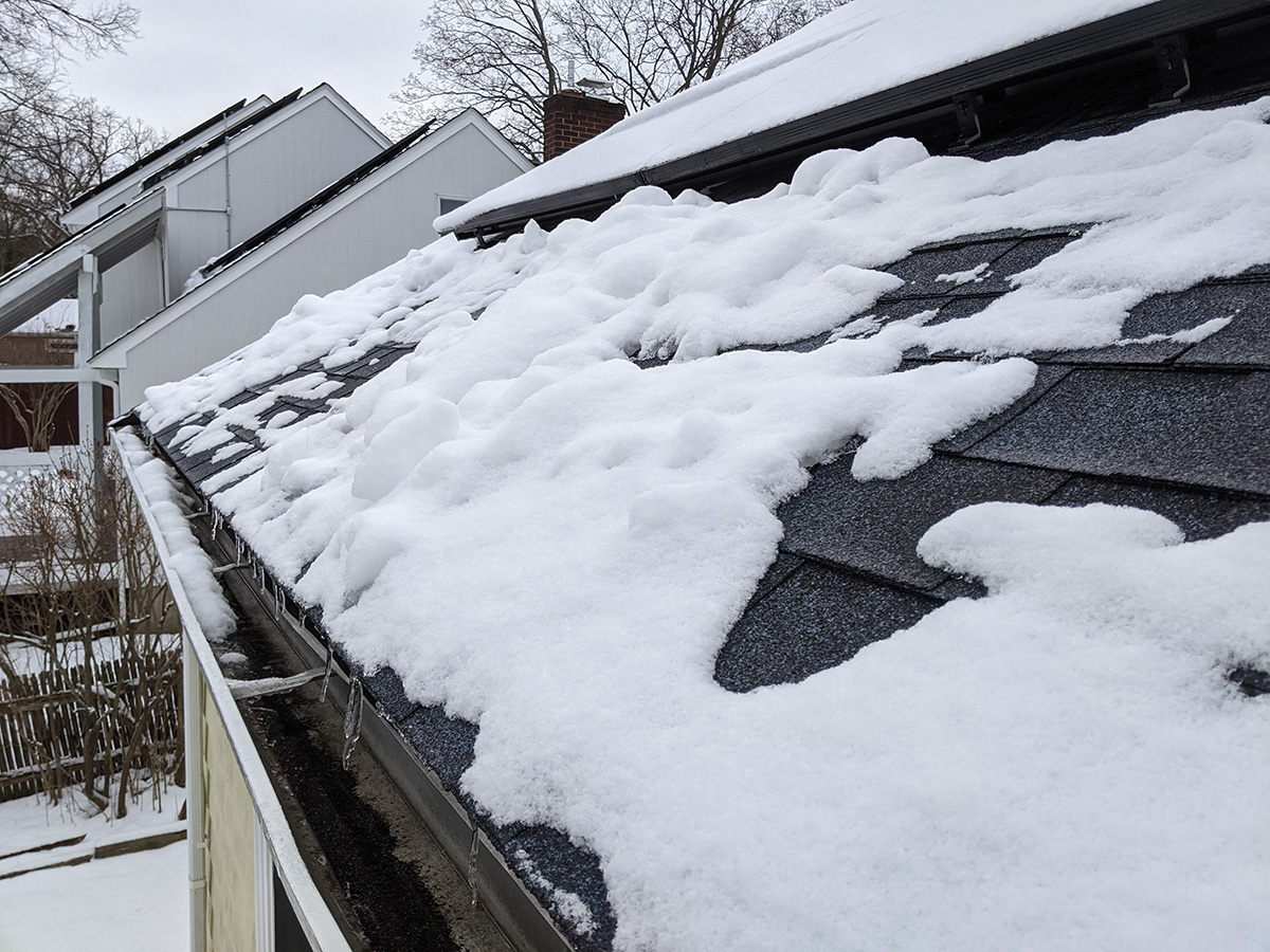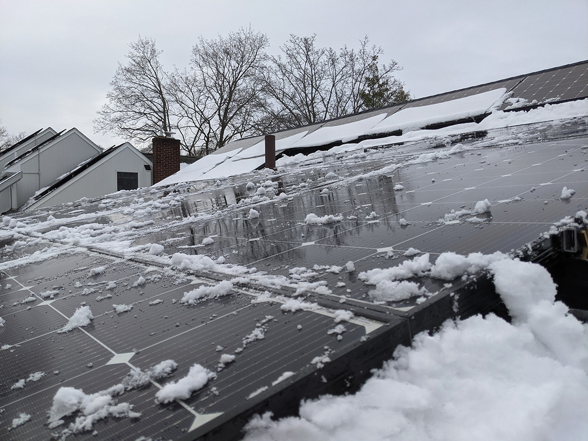 our solar panels were covered but there was only about in inch of snow. like yesterday, i first cleared the panels above the living room. from that spot i could also reach 2 of the panels in the middle of the roof. next i leaned the ladder against the eastern side of the sunroom and cleared the snow off of those panels. i discovered that pushing the snow is a lot easier than pulling the snow. it went a lot quicker than yesterday simple because there was less snow to remove. finally, i moved the ladder to the bathroom window. from that position i could clear all the panels above the bedroom along with 2 more panels from the middle of the roof.