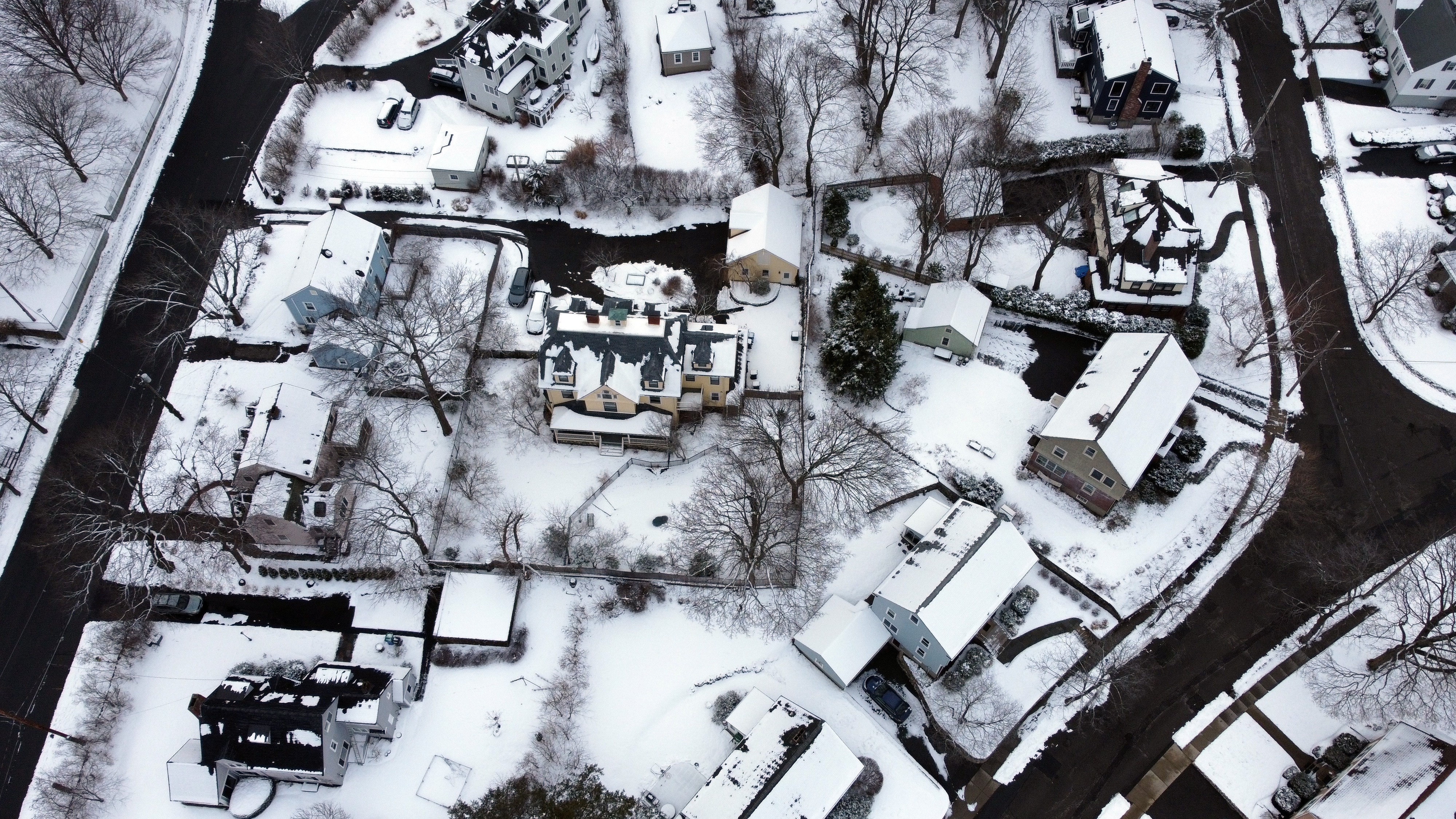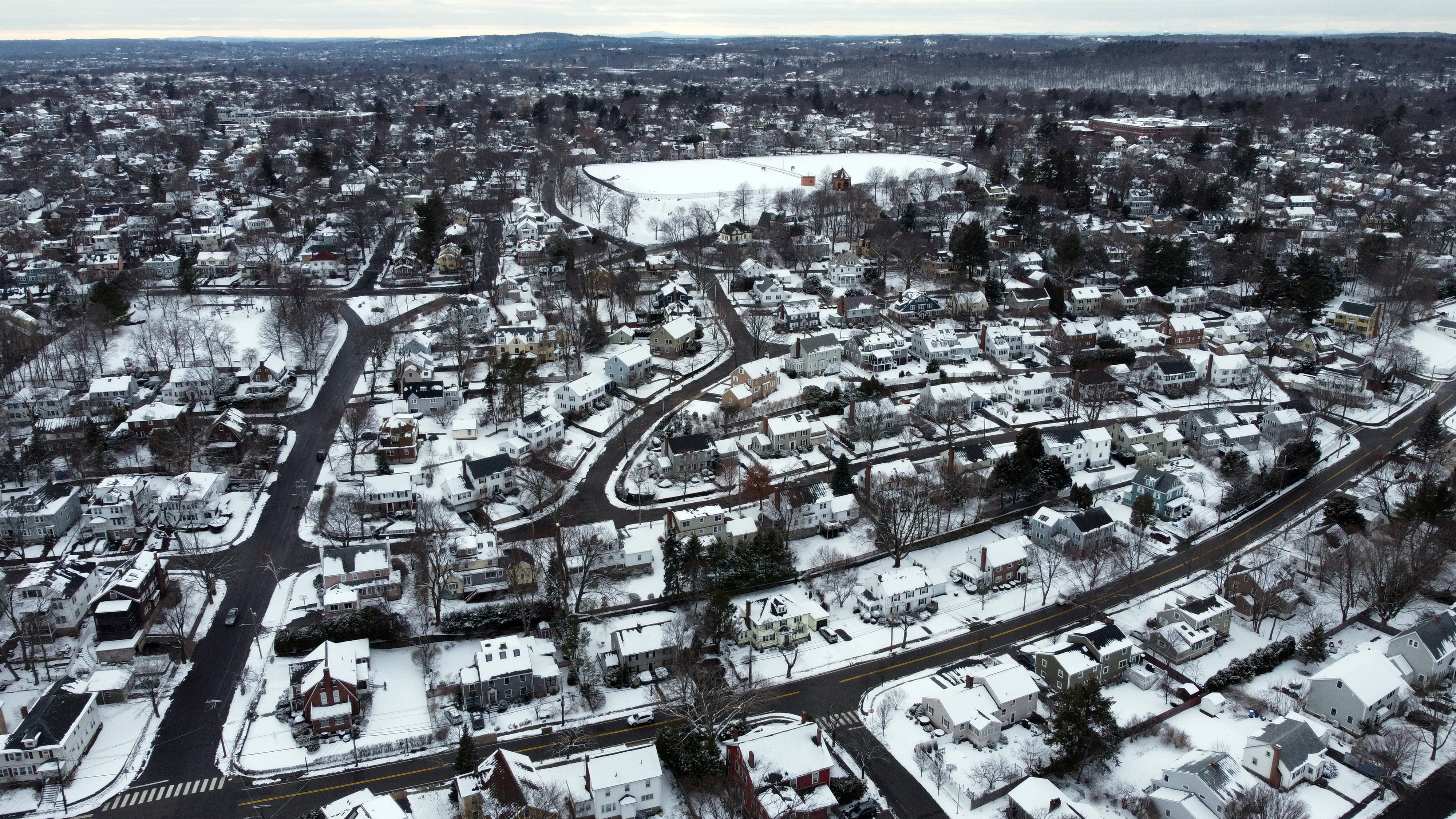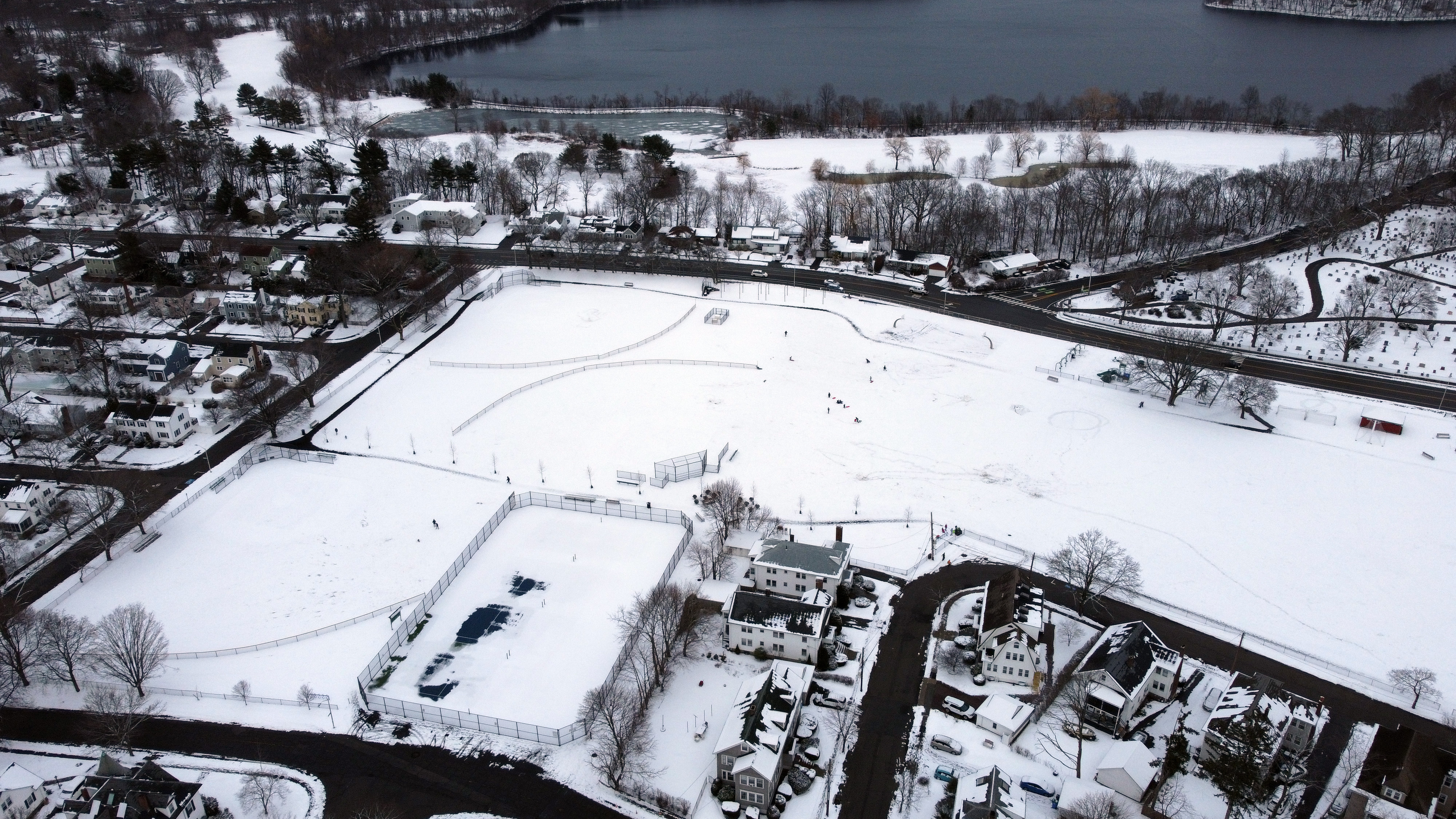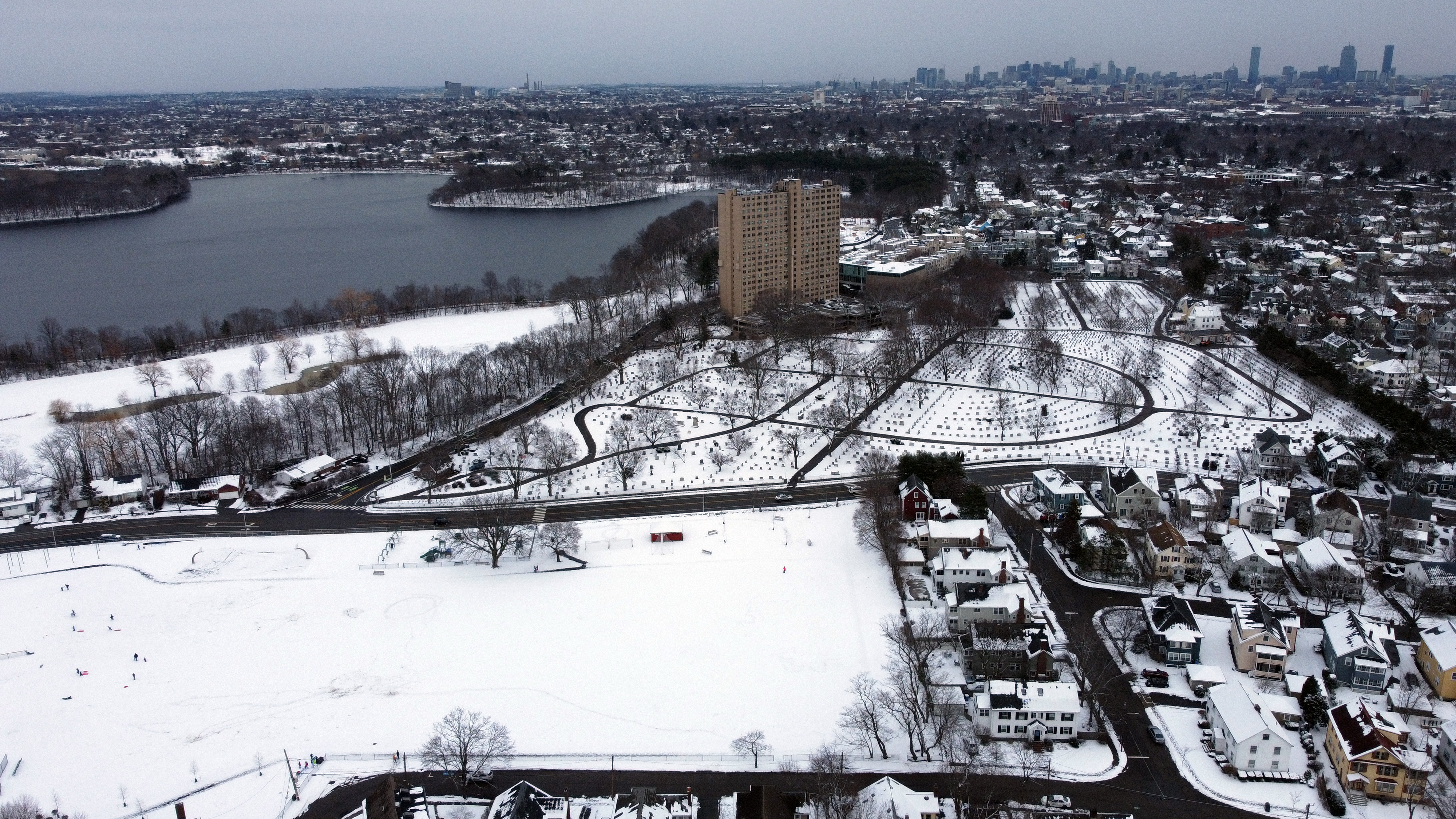 by the time i finished cleaning the solar panels, the snow had pretty much stopped. i put in a fresh battery (learned my lesson from yesterday, put the drone inside the house when not using) and decided to fly around a bit. all the flights today i'd put the phone into airplane mode, i never once had an app crash. i also checked to see if the map would still work with no wifi/data and the map data displayed fine, the app must've downloaded the map prior to flying. i decided to fly back to the reservoir as it was a short distance away. yesterday i only made it to the middle of the reservoir before turning back; today i reached all the way to the other side before 2 bars of RC signal reception made me return. i grabbed a better photo of the reservoir, with the trio of richardsonian romanesque gatehouses with views of fresh pond, the boston skyline, and children sledding down the hill.