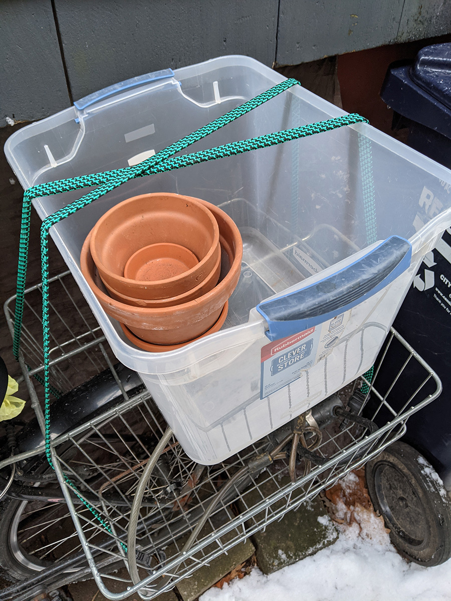 i returned to cambridge before 4pm. riding down huron avenue, i saw marimekko was closing and the employees were putting free stuff out on the sidewalk. i grabbed some small terracotta pots with matching clay saucers along with a half gallon glass milk bottle. they were also tossing out wooden boxes but a neighbor walking by grabbed all of them.