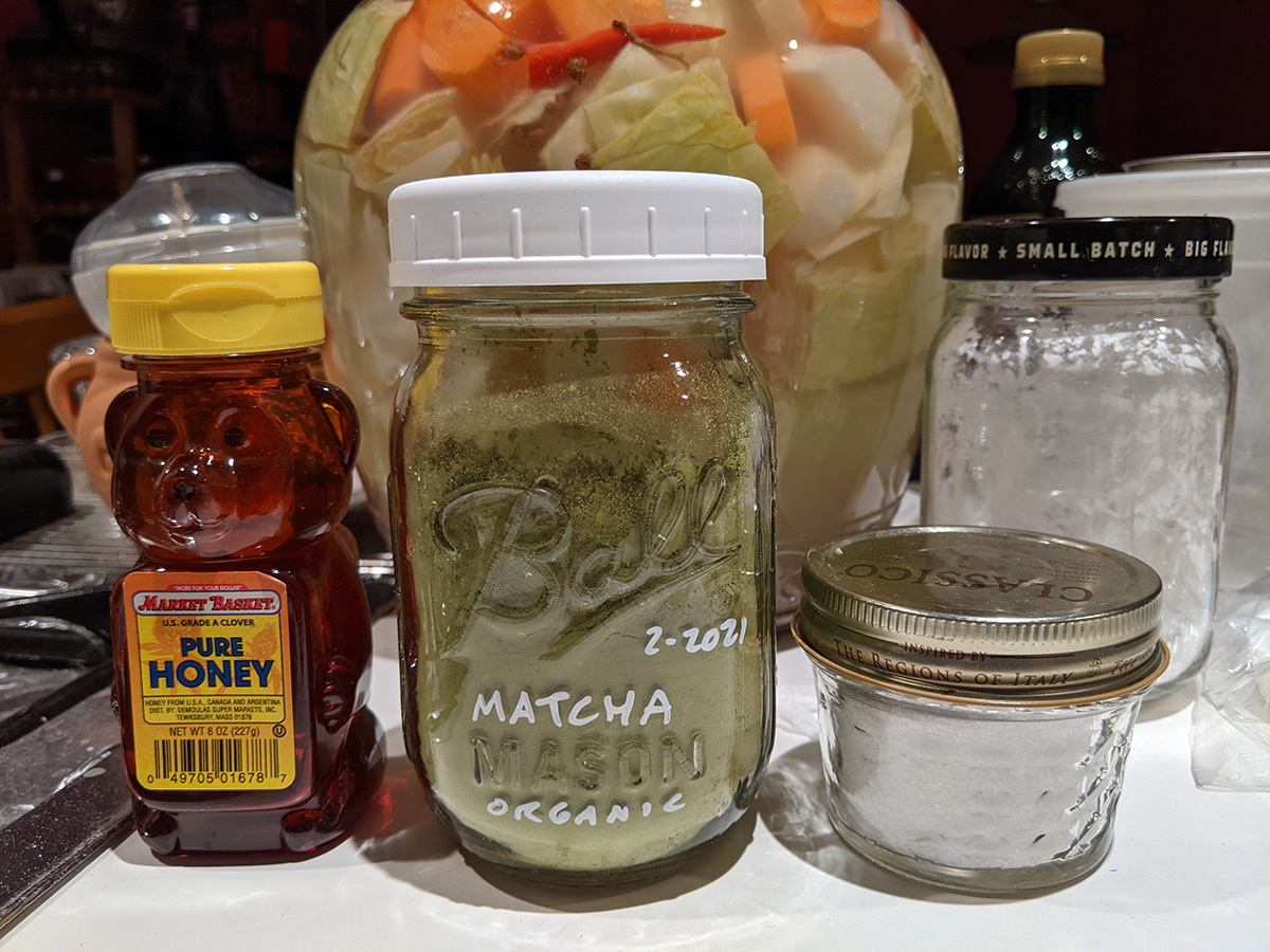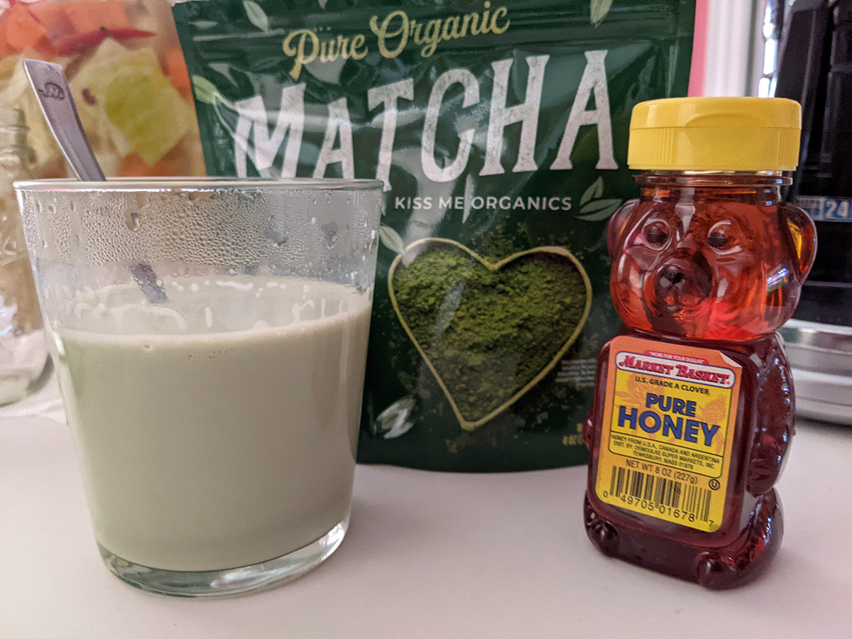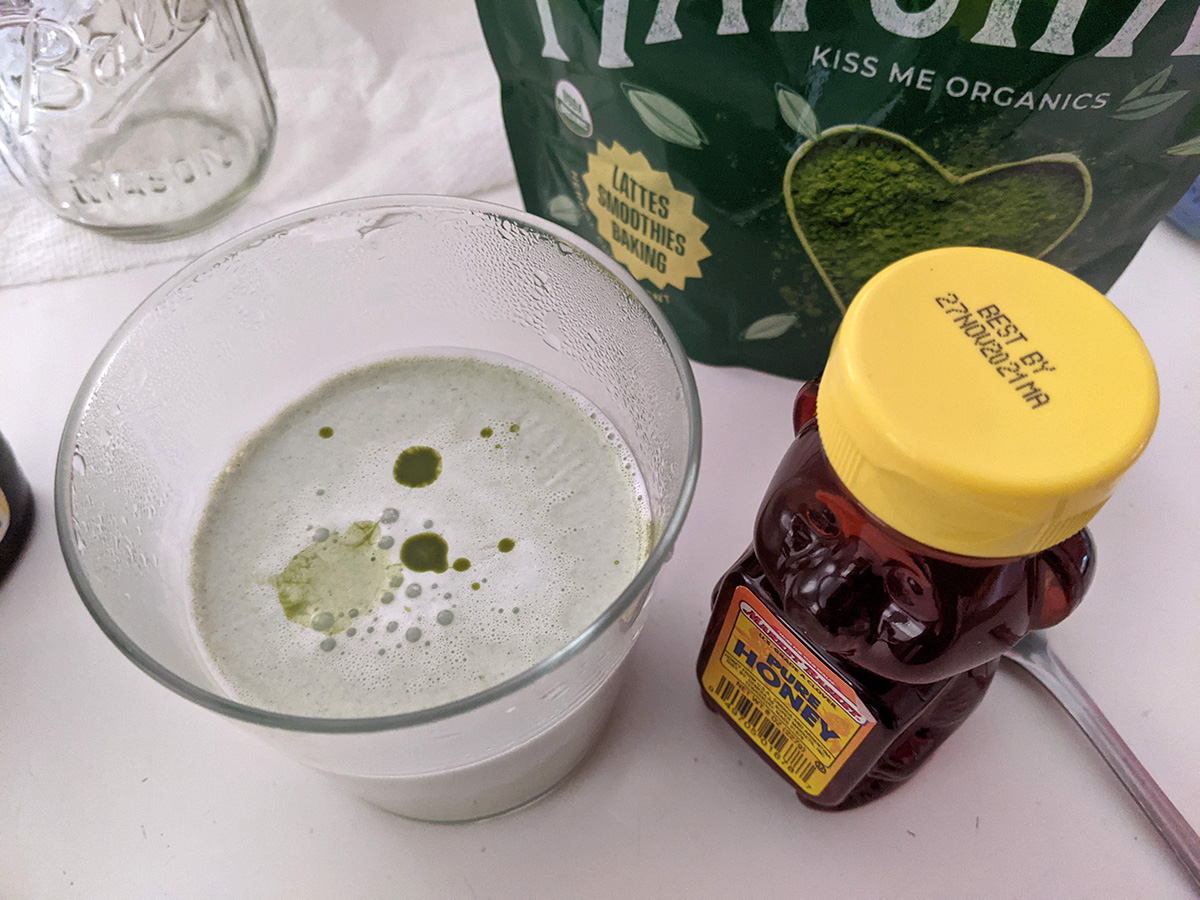 i made a whisk-free matcha latte (which i call a "matte") this morning after seeing a video about it last night. you warm the milk (90 seconds microwave) and mix the matcha powder with some water (hot water) in a jar by shaking it. you then pour the liquid matcha into the milk and sweeten with a bit of honey. i used 1/2 tsp of matcha powder and a tsp of honey. the end result was pretty good, really warmed me up, a nice morning drink. it wasn't as foamy had i used a whisk or a milk frother, but it's the taste that matters. there wasn't as much caffeine as a cup of coffee but more than tea, so i also felt a little wired afterwards. though like coffee, soon afterwards i had to poop. the matcha package said to use within 2 months of opening. looks like i'm going to be drinking and eating matcha until april.