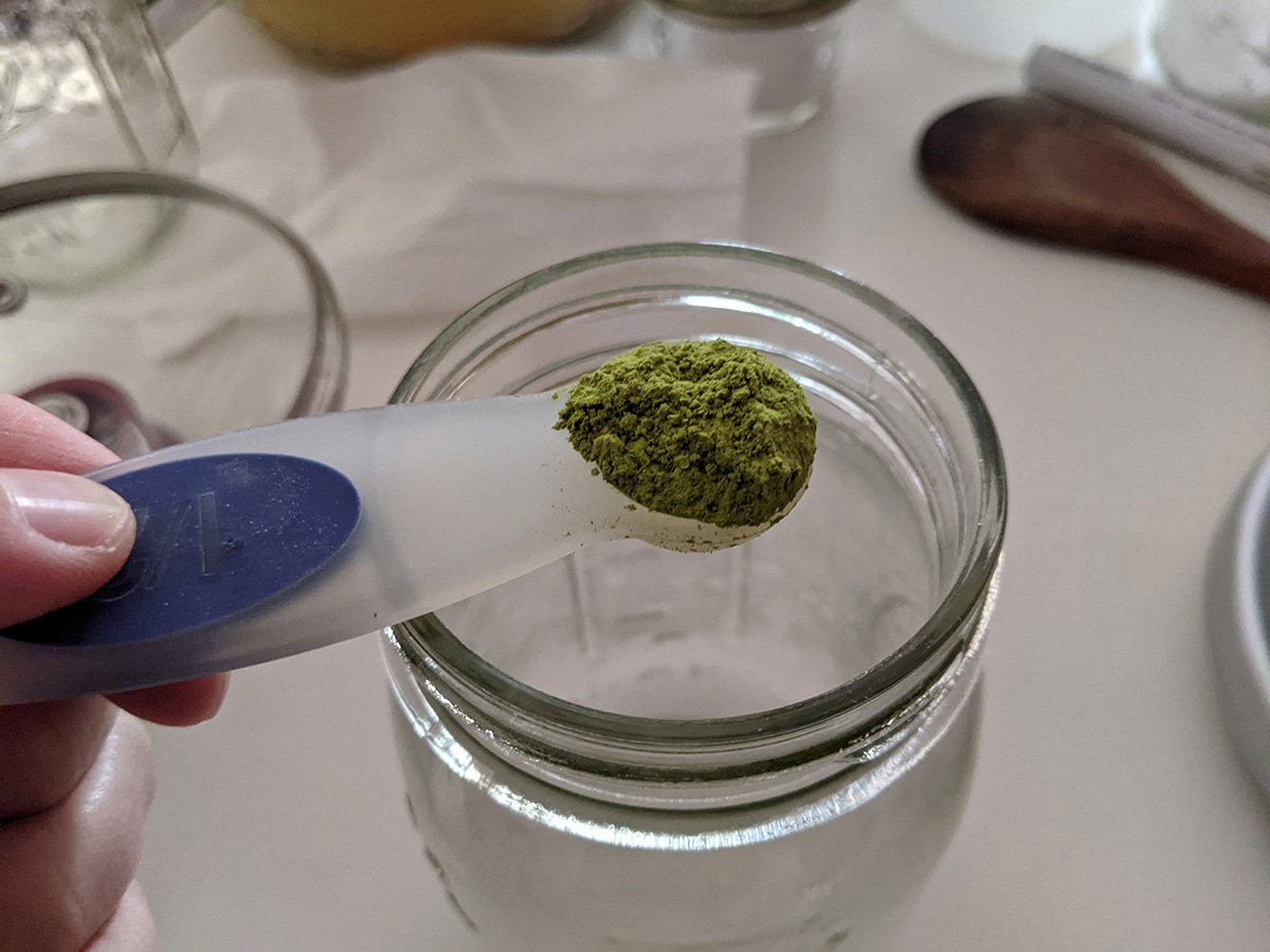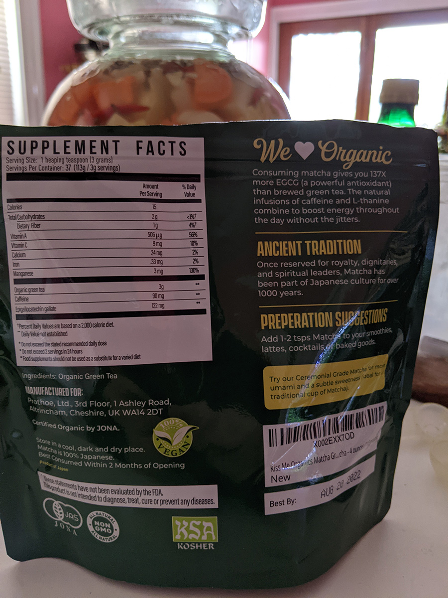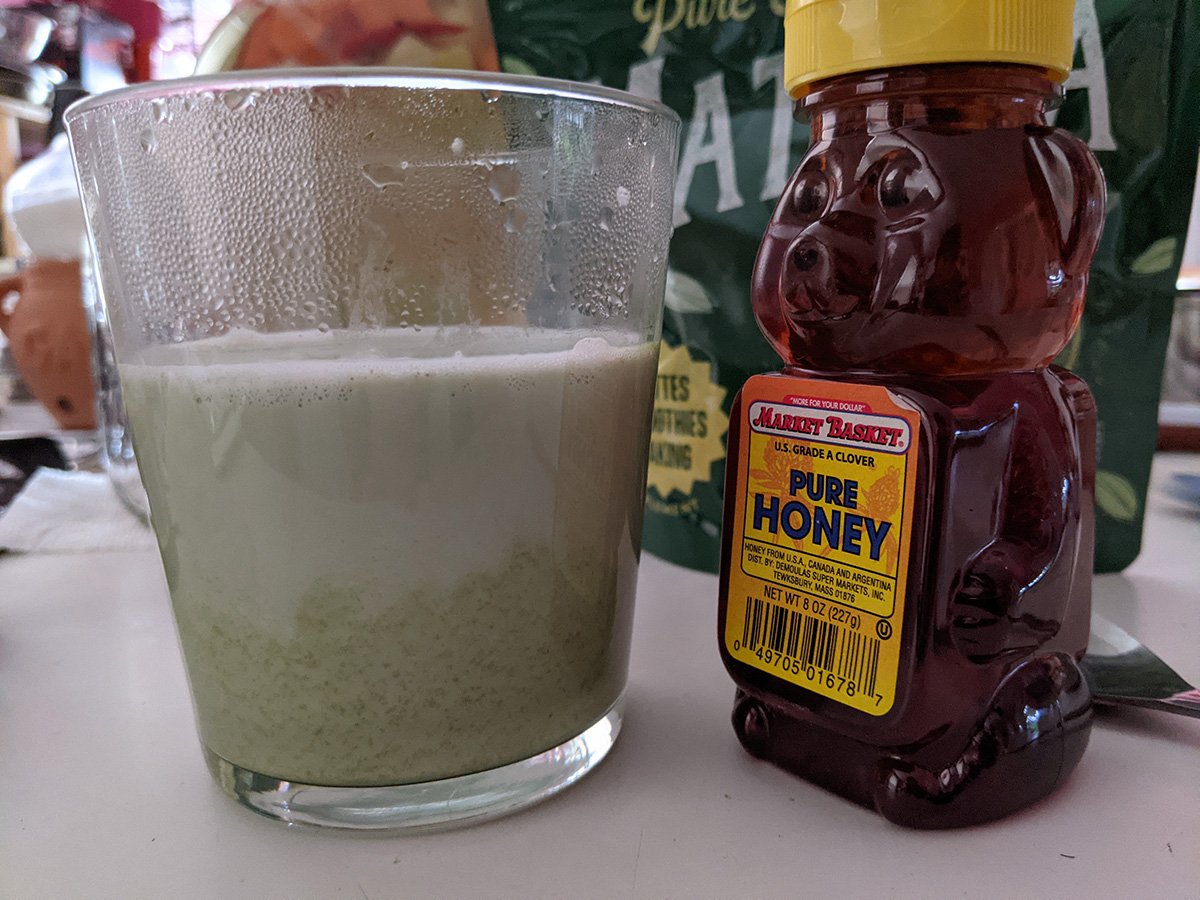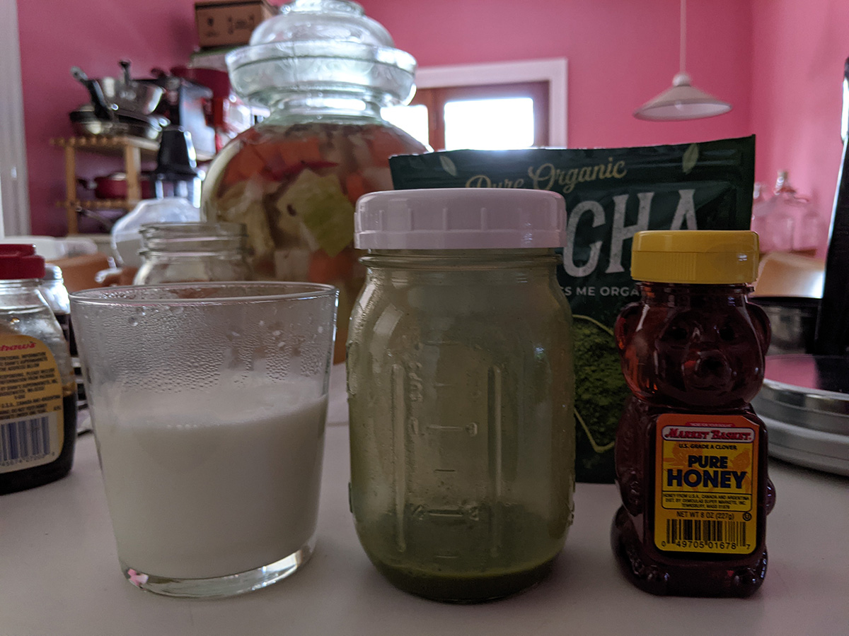 i made a whisk-free matcha latte (which i call a "matte") this morning after seeing a video about it last night. you warm the milk (90 seconds microwave) and mix the matcha powder with some water (hot water) in a jar by shaking it. you then pour the liquid matcha into the milk and sweeten with a bit of honey. i used 1/2 tsp of matcha powder and a tsp of honey. the end result was pretty good, really warmed me up, a nice morning drink. it wasn't as foamy had i used a whisk or a milk frother, but it's the taste that matters. there wasn't as much caffeine as a cup of coffee but more than tea, so i also felt a little wired afterwards. though like coffee, soon afterwards i had to poop. the matcha package said to use within 2 months of opening. looks like i'm going to be drinking and eating matcha until april.