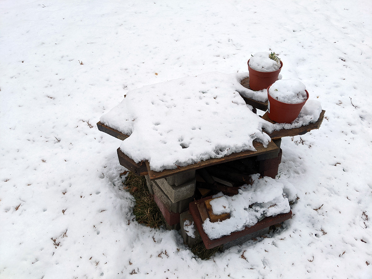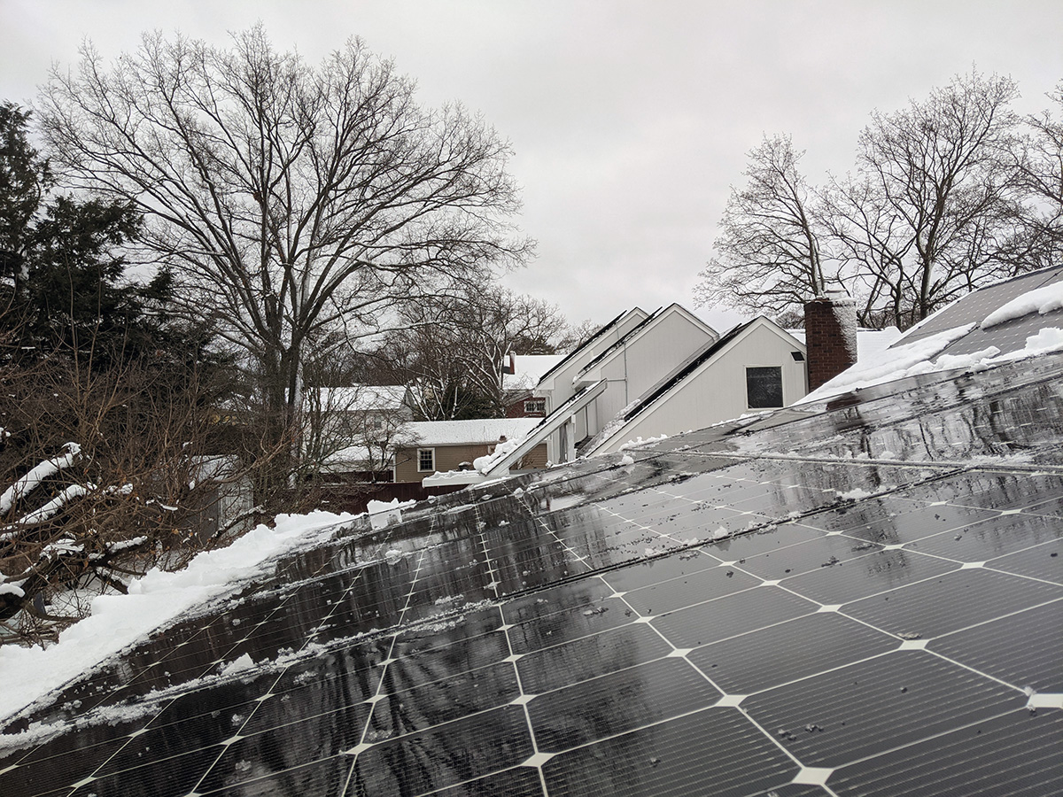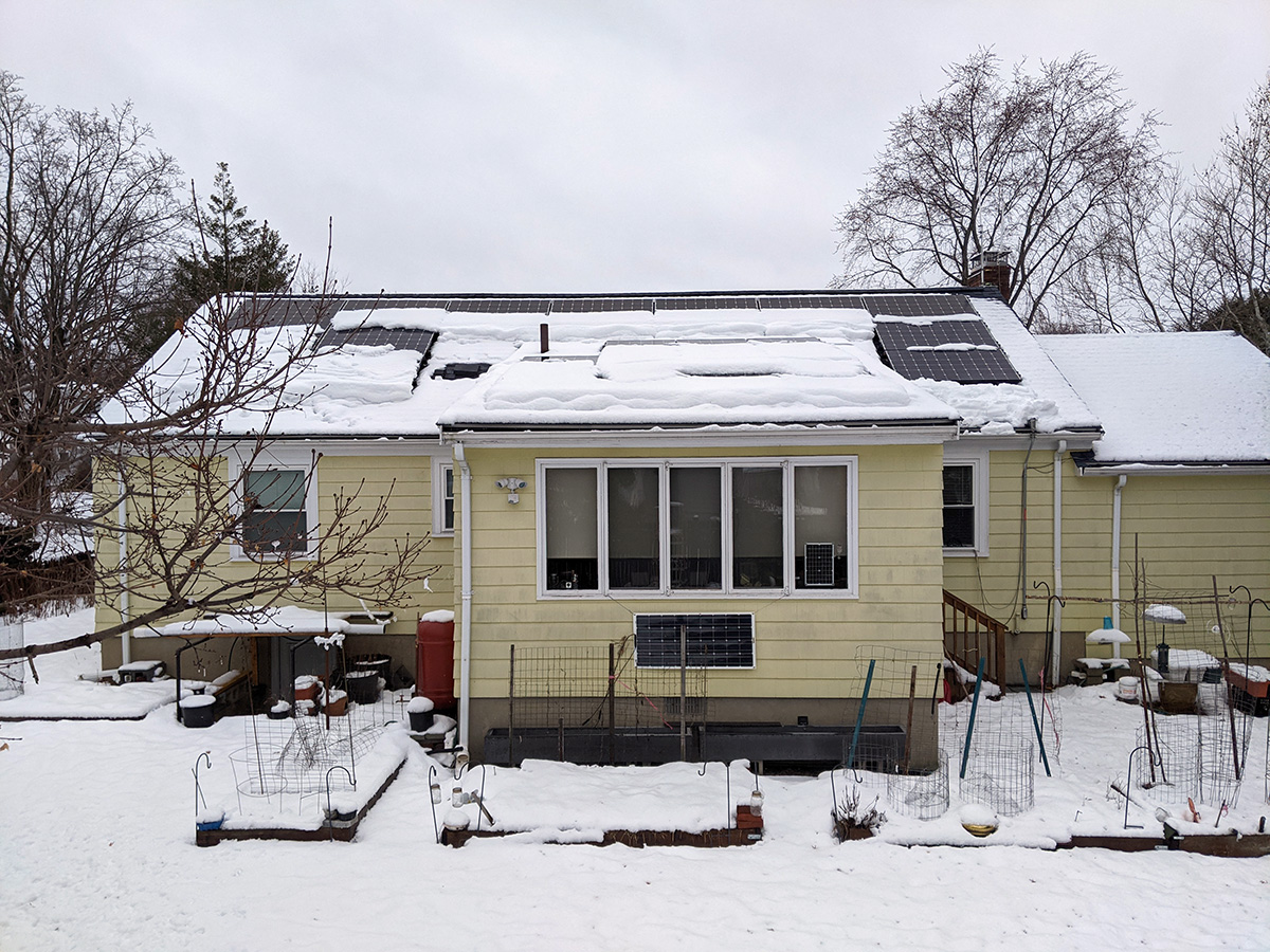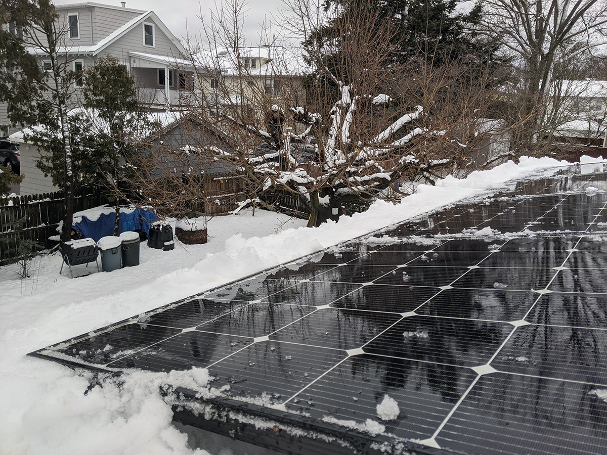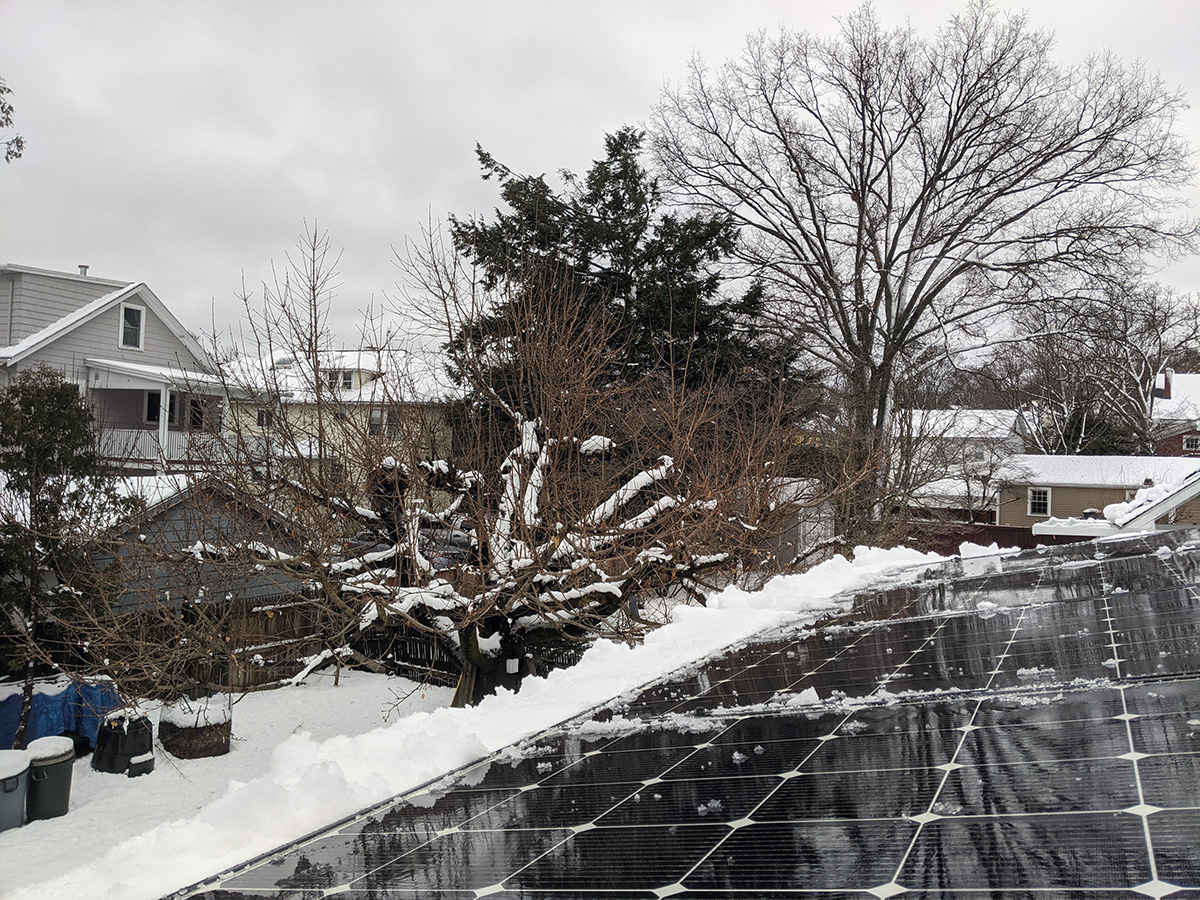 this was the toughest removal yet of this winter. some of the snow on the main roof had started to slide off on its own, but the snow was so wet it clumped together forming snow dams at the bottom of the panels, preventing the rest of the snow to come down. not to mention the wet snow had hardened back up in the cold weather. my strategy was to remove as much as the bottom snow pile before tackling the remaining snow on the panels. the good thing about the refreeze though is when i did manage to break off some snow, they came in big sheets, and so long as there was a clear path, they could gently slide off the panels. it took more than an hour to finally finish clearing the panels.