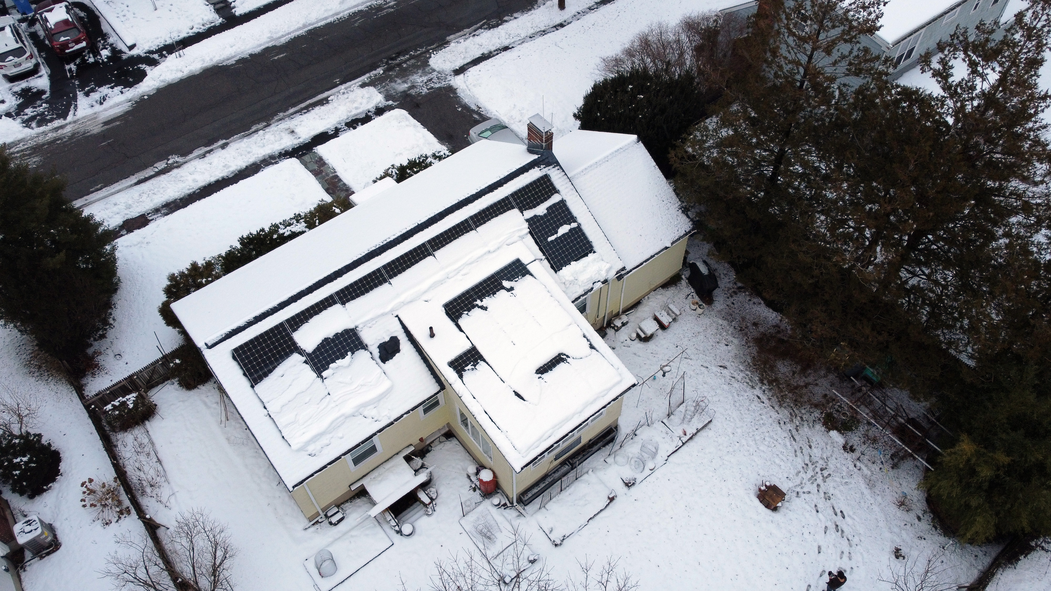 only then was i able to start working clearing the solar panels. i sent the drone up in the air briefly to survey how much snow was on the roof. it was mostly to get a before photo so i could compare it with the after photo, since i could just as easily see the roof condition from the step ladder.