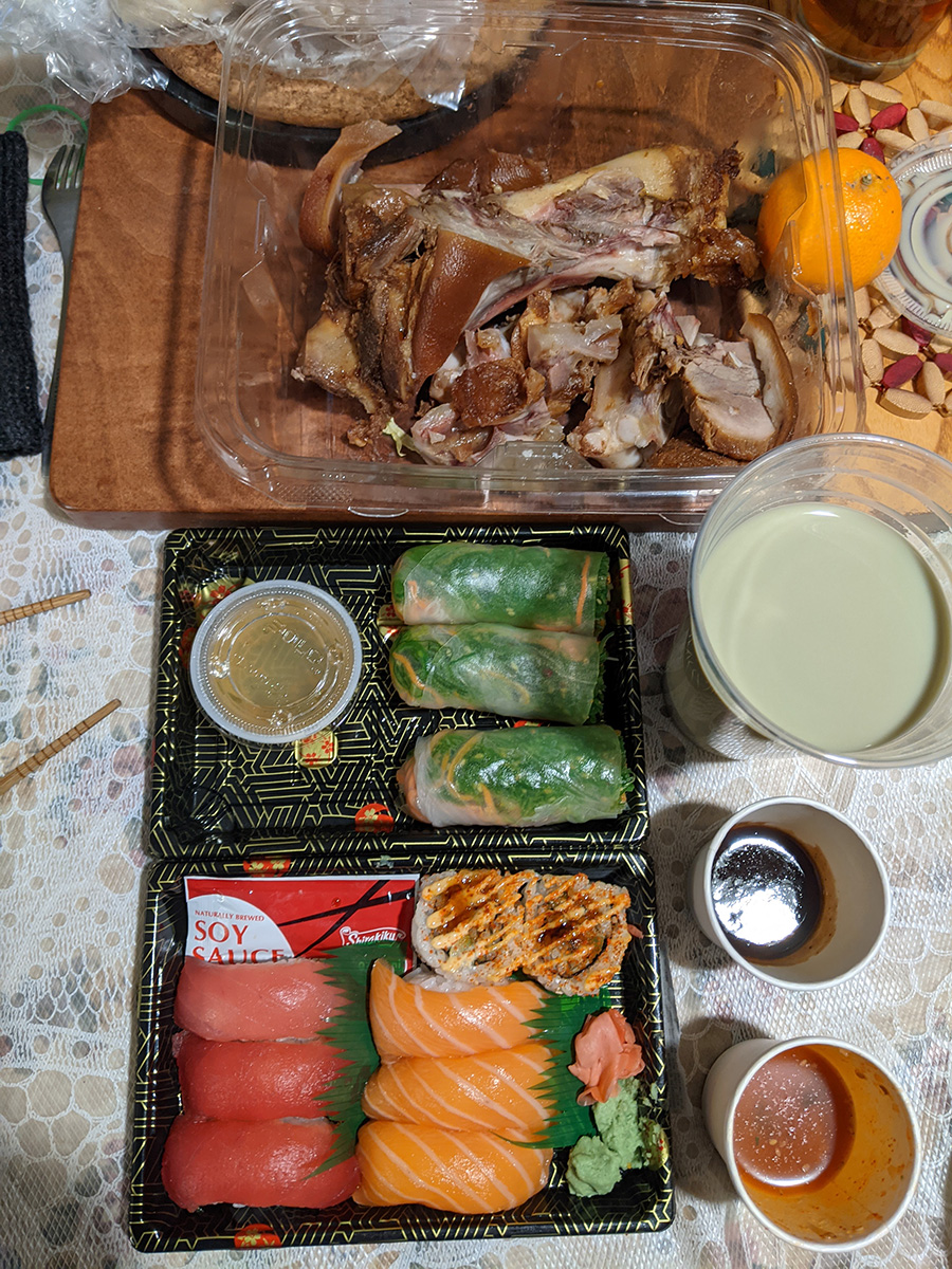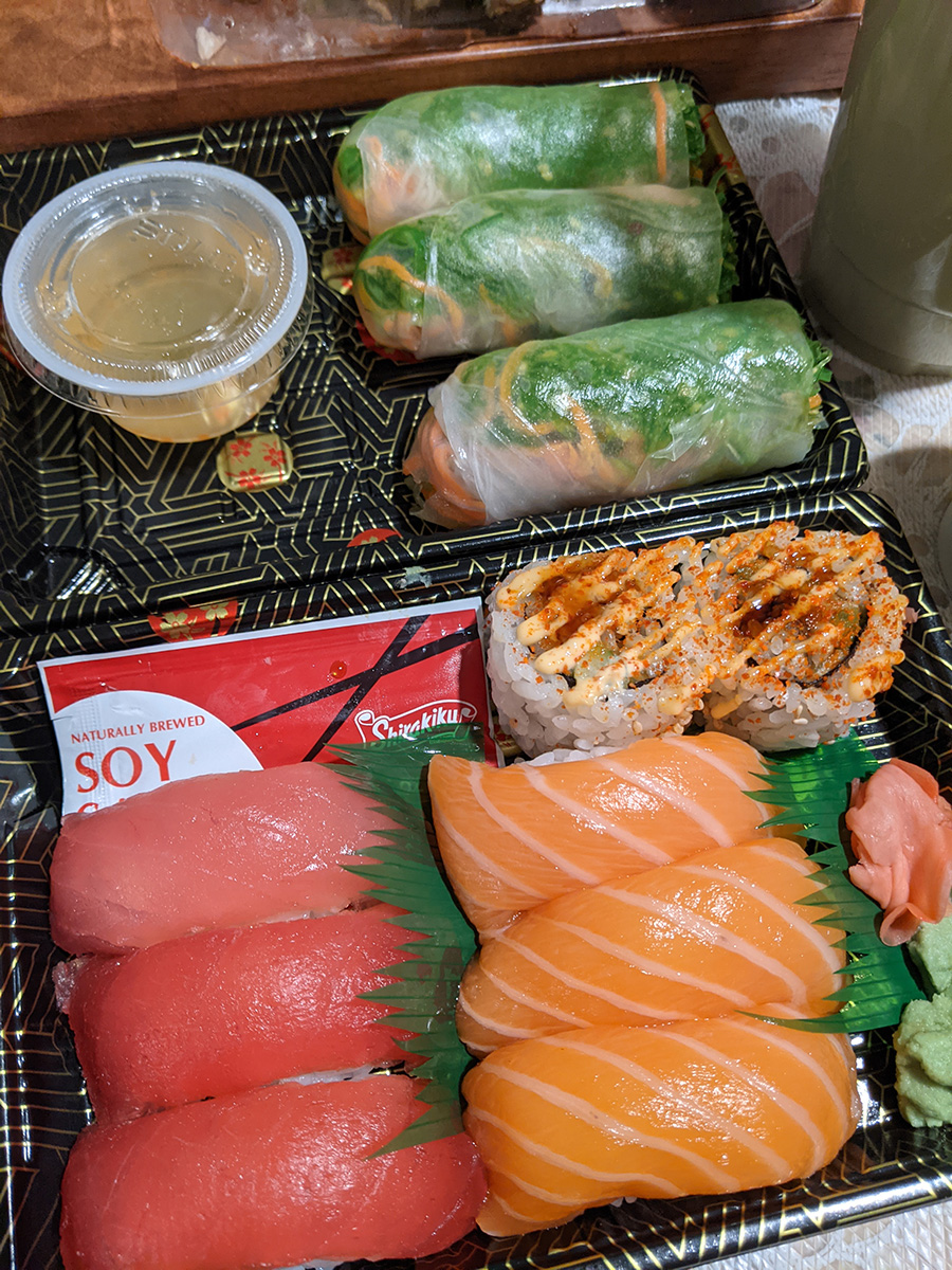 i was finally finished a bit after 4pm. i was getting ready to return to cambridge when my mother called me. she said their friends stopped by again with sushi deliveries, and she told me if i waited in belmont she'd bring back the sushi for dinner. so that's what i ended up doing. my parents came home a bit before 6pm. there was maki sushi and nigiri sushi, and also some seaweed spring rolls in a vinegary sweet chili sauce. there was also some leftover korean porch from when my father-sister-godmother went to h-mart after they finished securing the apartment.