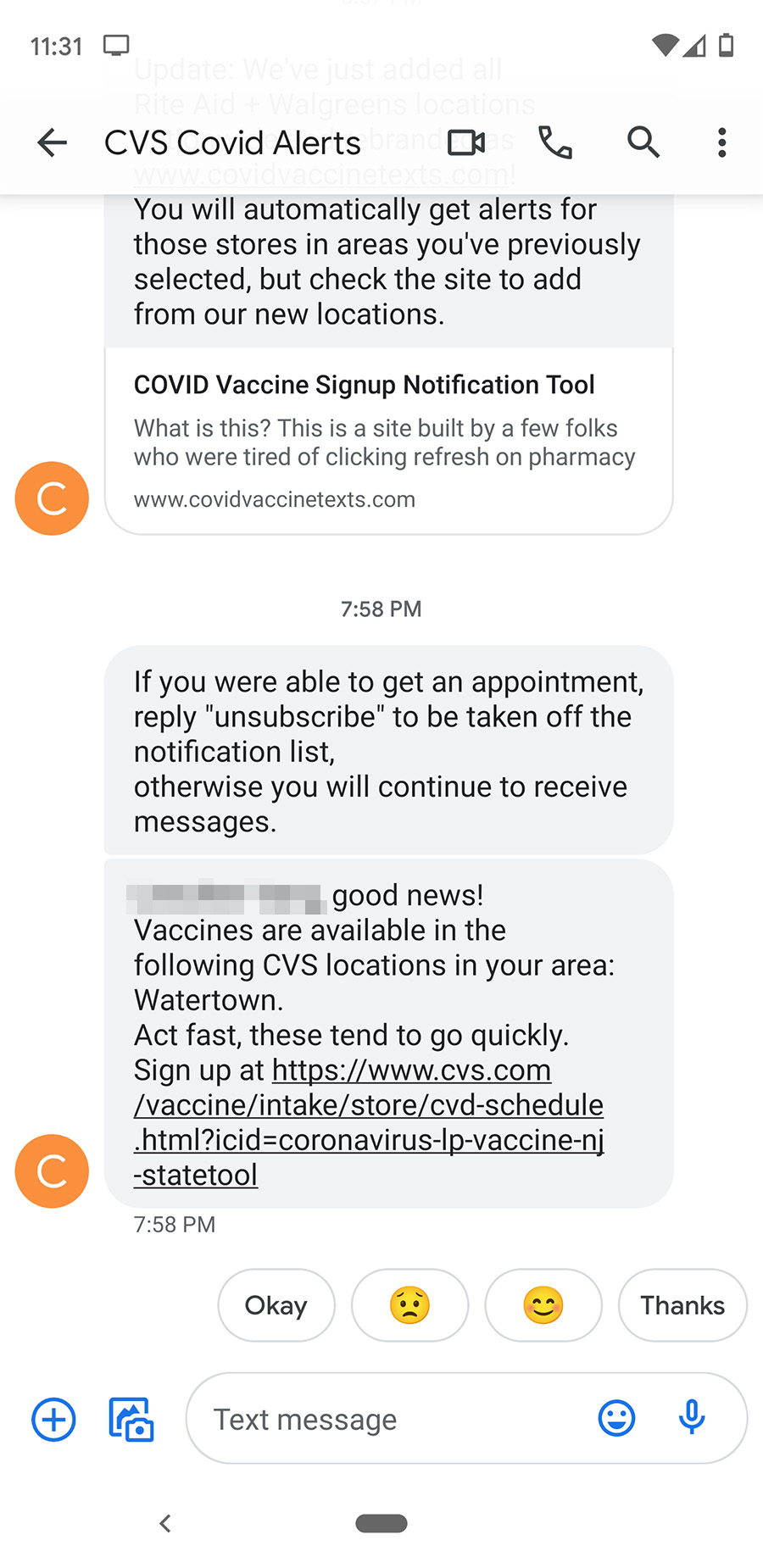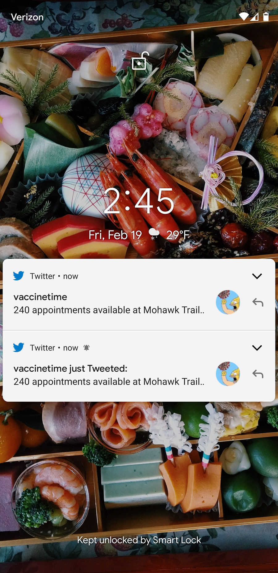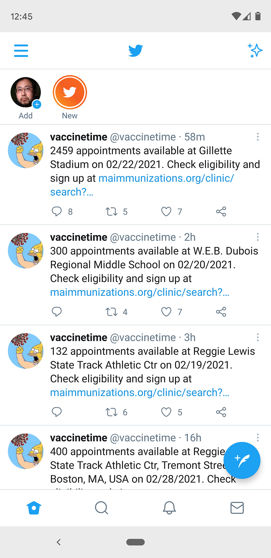 i signed up for a twitter account today (@tonychabuduo). not that i had any desire to tweet, but i wanted to get notifications on my phone from a vaccine bot that would tweet whenever appointments were available. like how it alerted me in the early afternoon that there were several thousand new appointments for 2/22 at gillette stadium. i was hoping to see appointments for fenway but the only other new slots was at the mohawk trail regional high school about 100 miles away. i also made an account for the cafe, in case we ever want to use it.