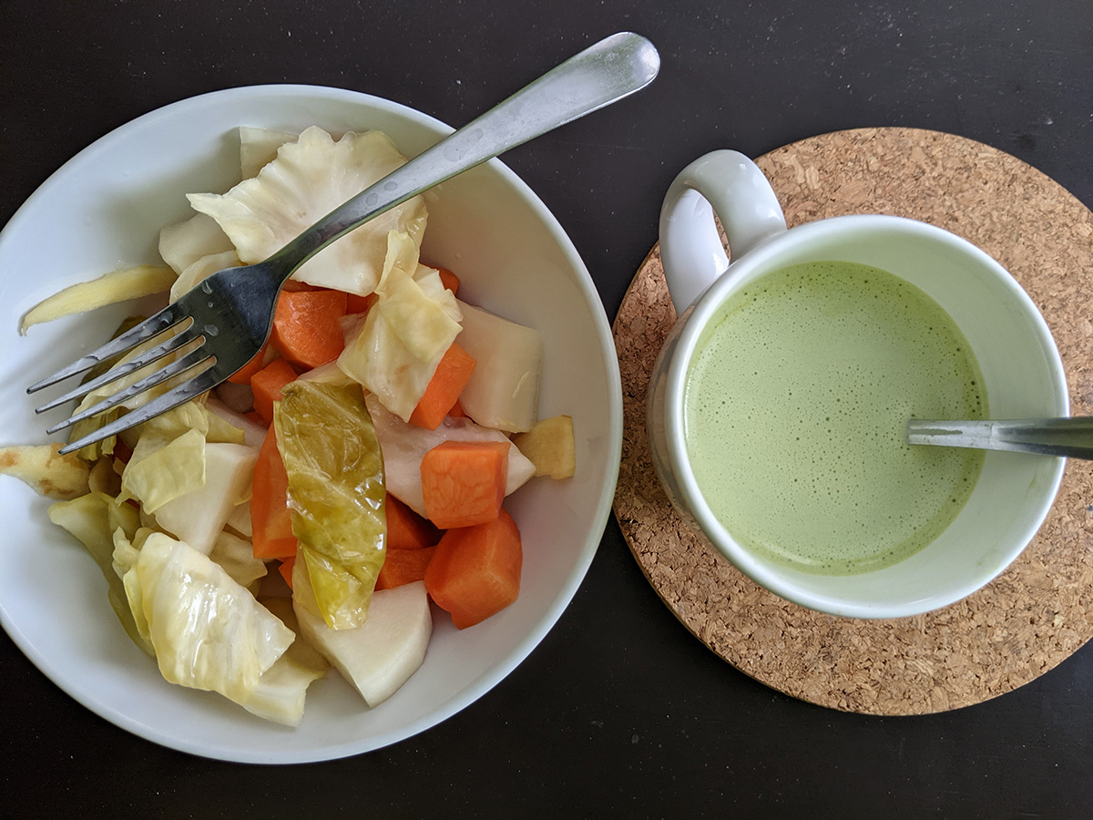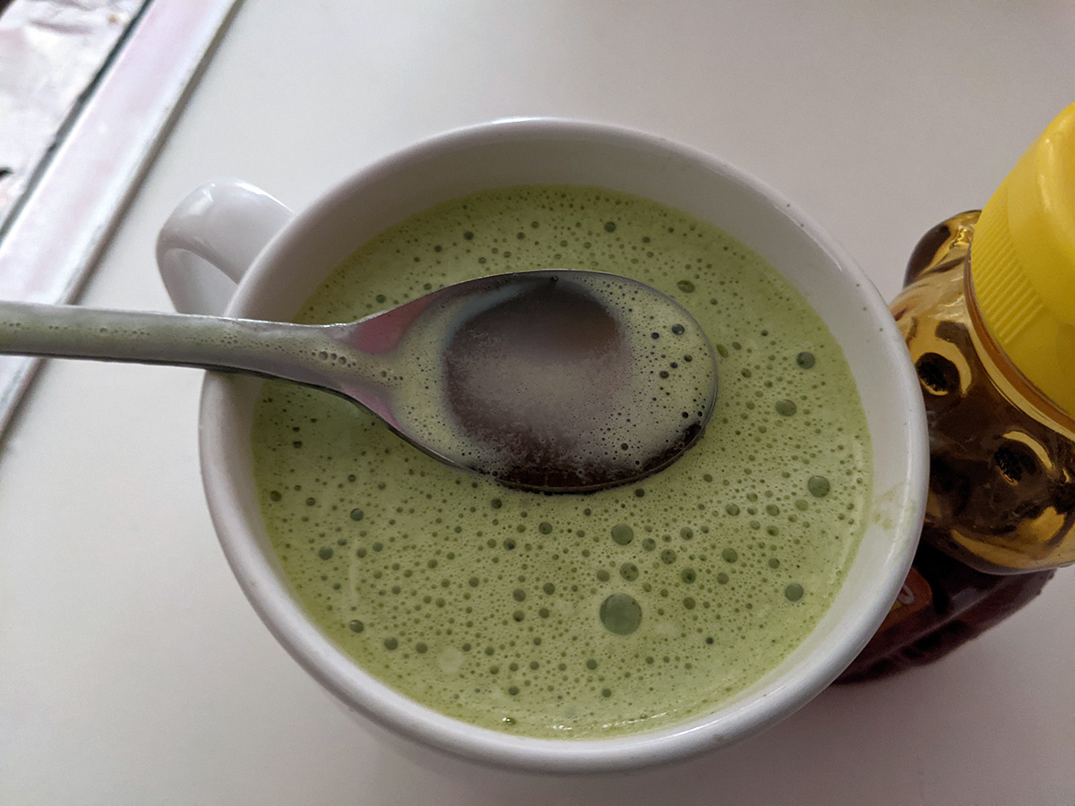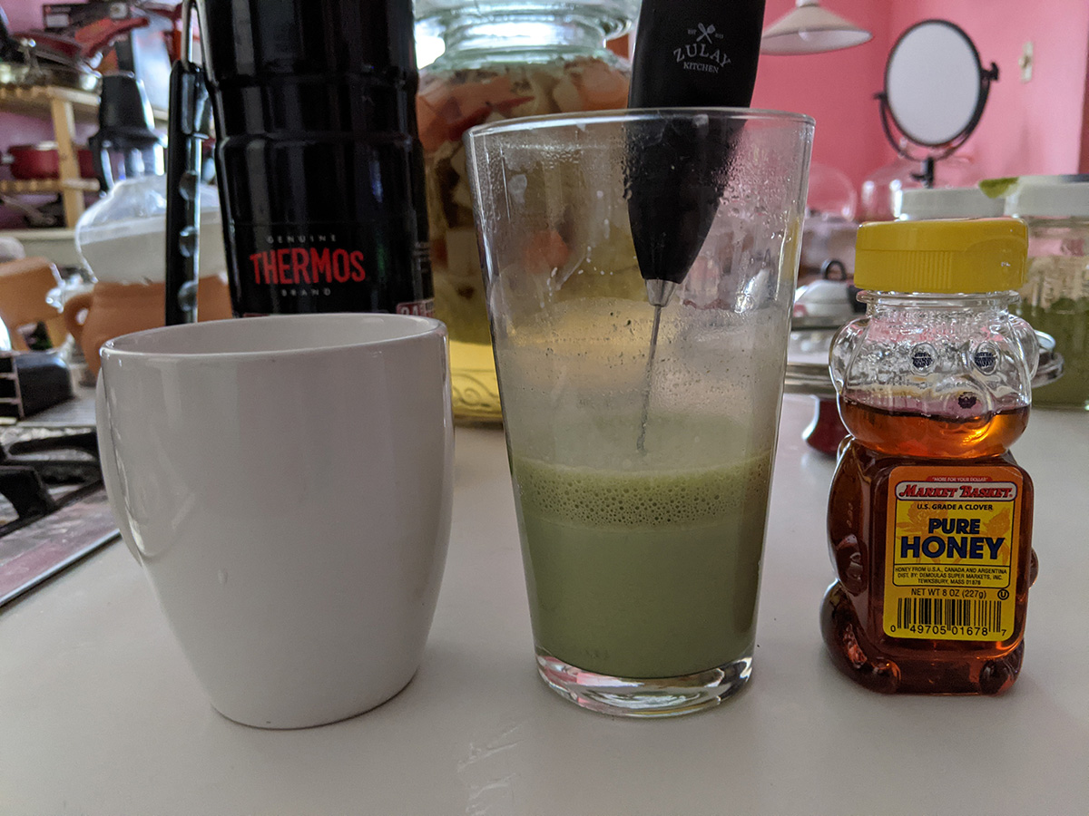 i made a matcha latte for lunch. i warmed up a tall glass of milk, poured most of it in a mug, then added a heaping 1/2 tsp of matcha powder to the leftover milk in the glass and mixed everything with the handheld frother before pouring the matcha mix into the rest of the milk. i had some leftover sichuan paocai i needed to finish so i had that for lunch as well. it was a weird mix, fermentation meets antioxidants. later my stomach felt a little weird, made some gurgling noises, that sensation when i eat sour foods on an empty stomach. matcha and paocai would combine forces to cleanse my bowels.