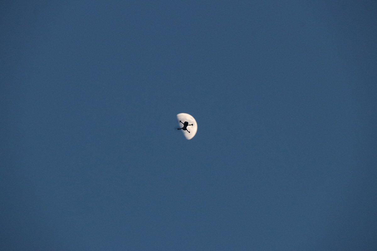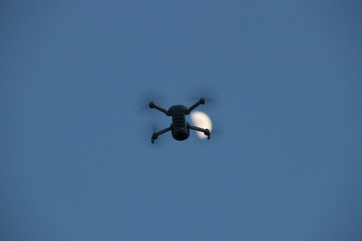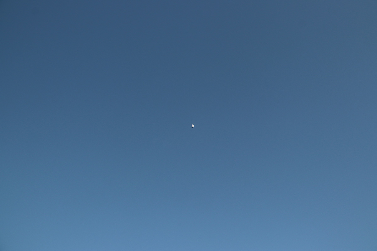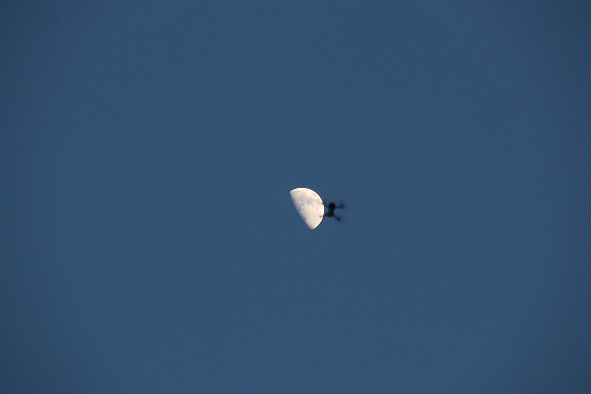 when twilight came around i went back outside for another flight. the sky looked like there might be a colorful sunset. the half-moon was out, i positioned the drone so the two could be super-imposed for a photo. there was some color but not as much as i'd hoped for. i was planning on coming out again later for some blue hour flight, with the landscape illuminated by street lights and house lights, but it was already time for dinner.