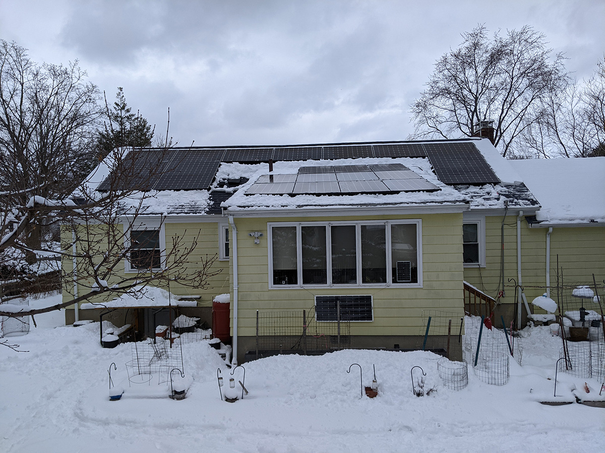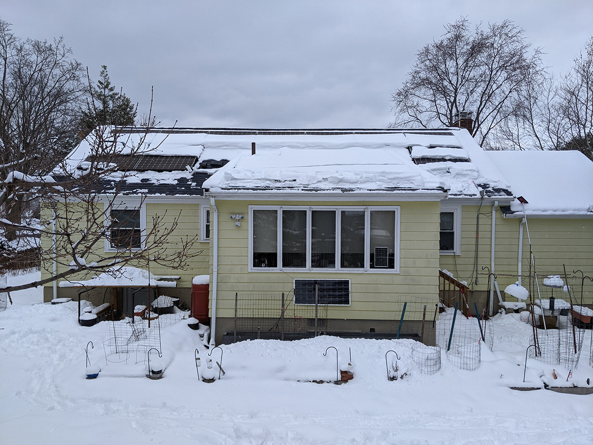 the first thing we did when we arrived in belmont was to clear the snow off the solar panels. my father told me he'd already brushed the snow below the panels, all we had to do was push the snow off. it was the light and fluffy type of snow, about 4-6" worth. some of it had already slid off the main room. there was no rush to get it done since today was a cloudy day anyway, so not too much electricity generation even if the panels were cleared.