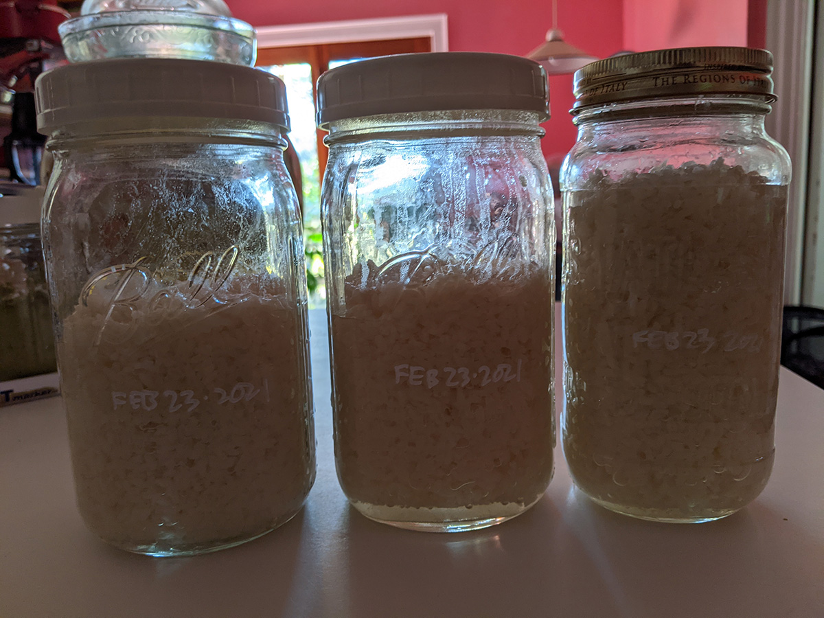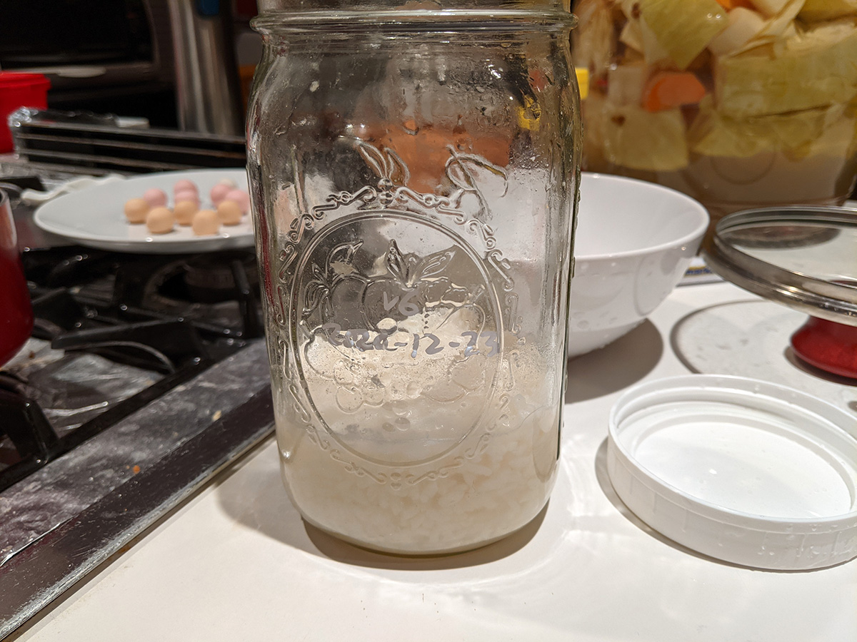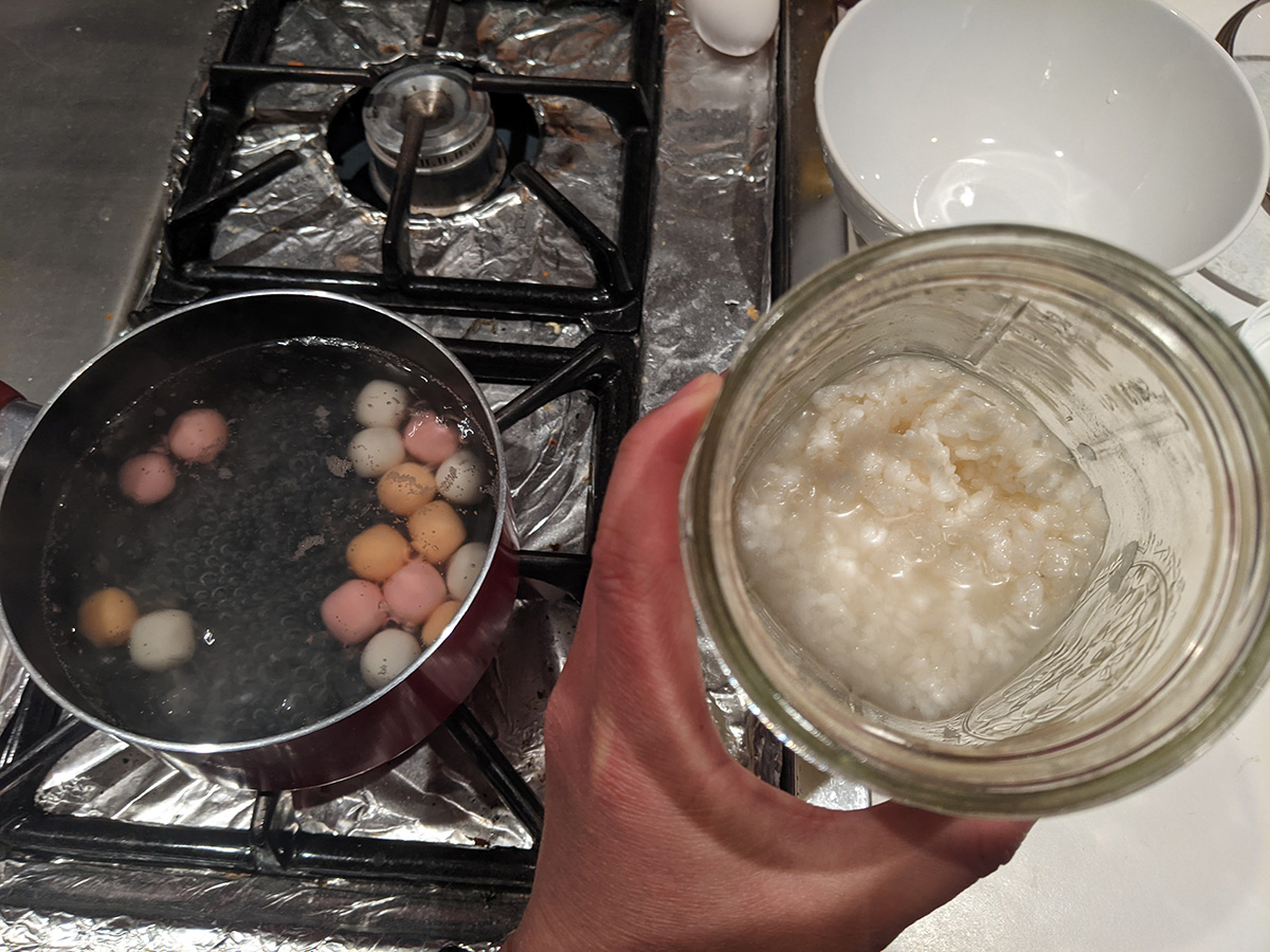 while cooking the tangyuan (they're ready once they float), i got out an old jar of jiu niang. i have various vintages in my fridge, the one that i got was some leftover from 12-23-2020, more than 2 months ago. i tasted it and it was incredibly sweet and had that fragrant jiu niang aroma. i used some leftover tangyuan water to cook an egg and add the jar of jiu niang and the tangyuan. i made the mistake of breaking the yolk and my jiu niang soup turned yellow when it should be white. but tastewise it was delicious, the sweetest i've ever had, and everything homemade too.